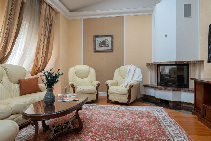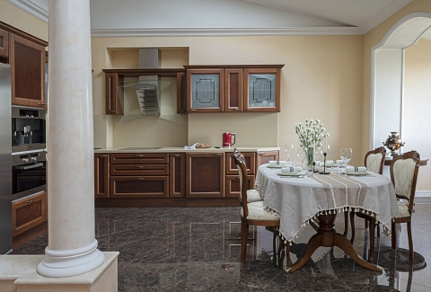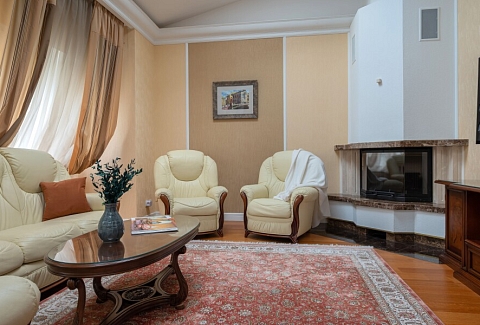 В номере: вешалка, гардеробная, диван, диван раскладной, зеркало, комод, кресла, кровать двуспальная, прикроватные тумбочки, стол, стулья, духовой шкаф, камин, кондиционер, кофемашина, микроволновая печь, набор посуды, плита электрическая, посудомоечная машина, стиральная машина, телевизор, утюг, холодильник, электрочайник