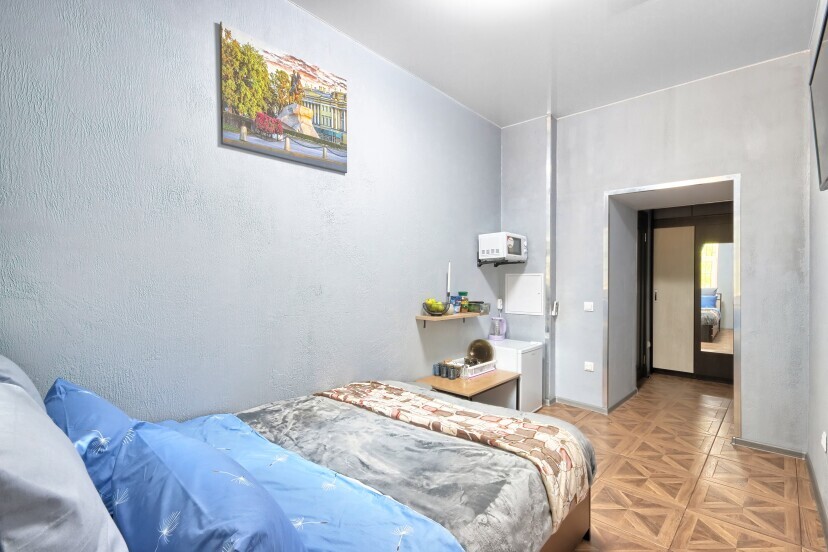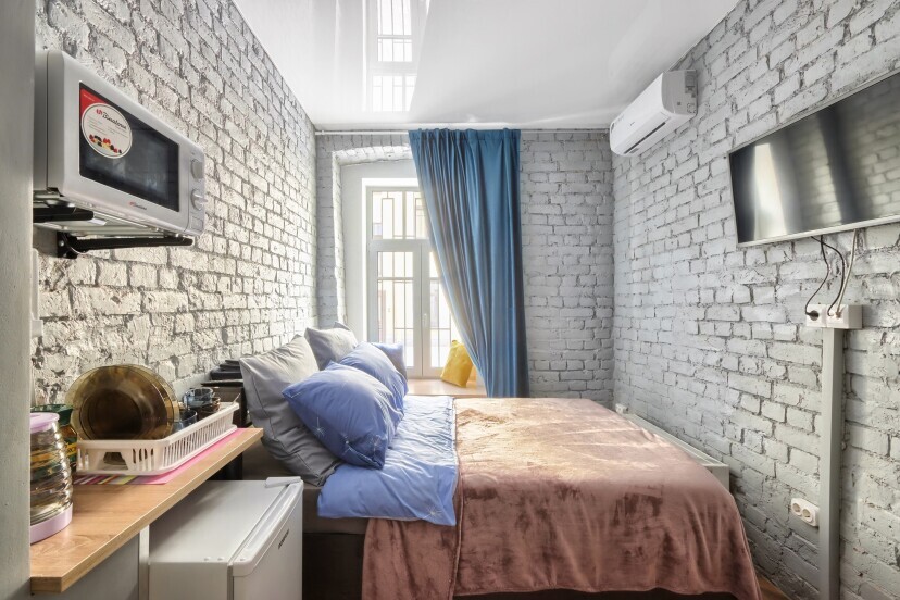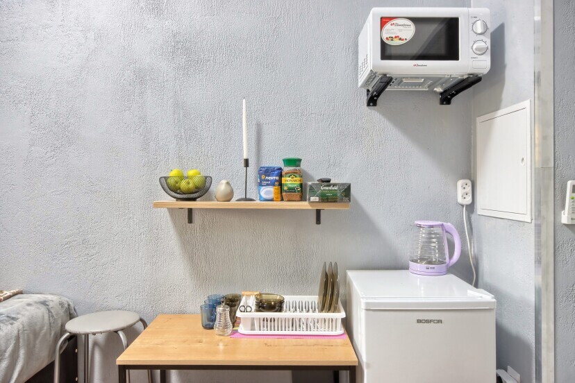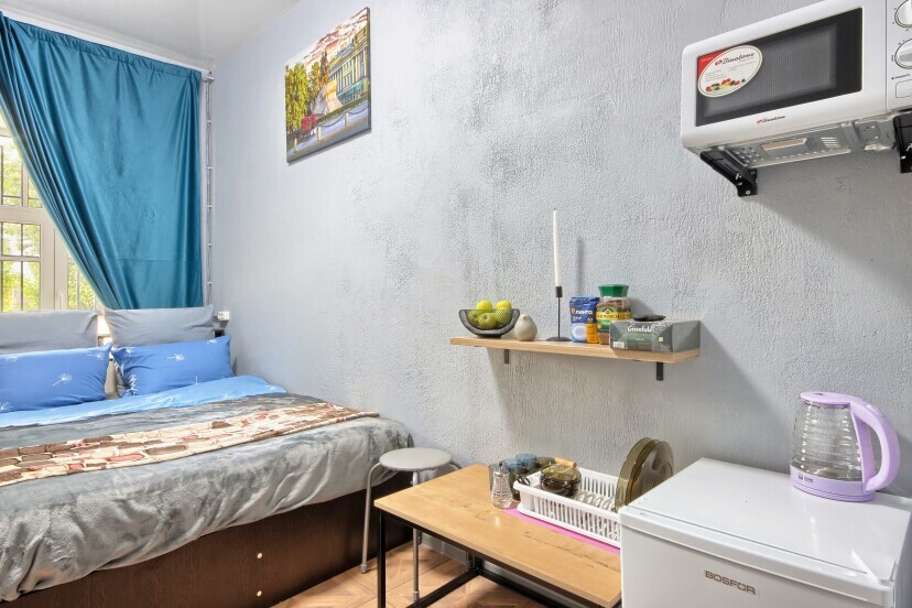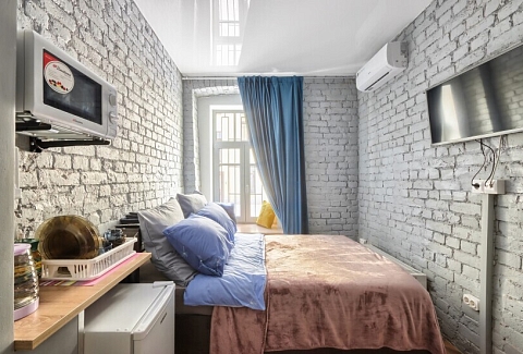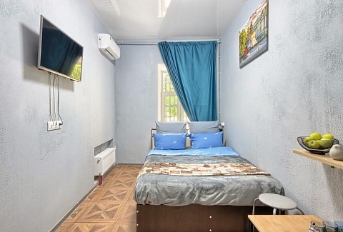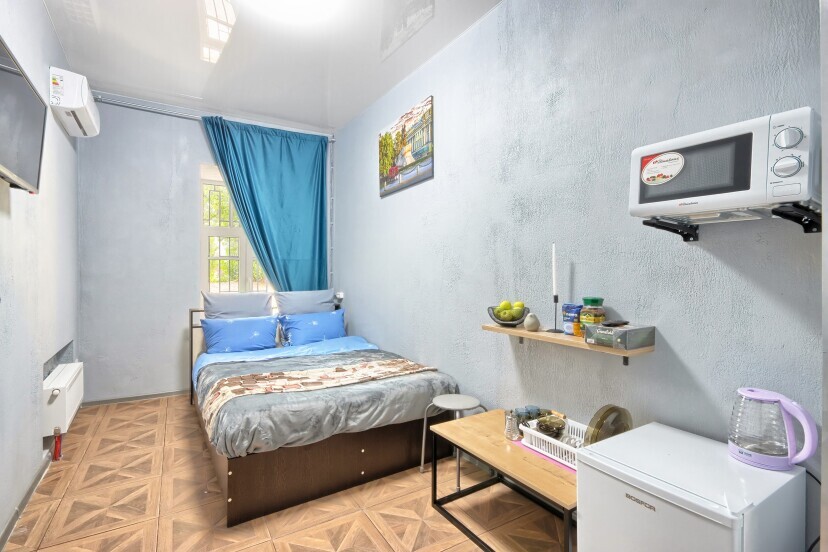В номере: вешалка, зеркало, кровать двуспальная, стол, стулья, шкаф, кондиционер, микроволновая печь, мини-холодильник, набор посуды, телевизор, электрочайник