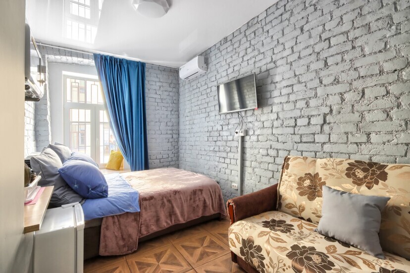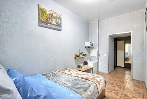 В номере: вешалка, диван, зеркало, кровать двуспальная, стол, стулья, шкаф, кондиционер, микроволновая печь, мини-холодильник, набор посуды, телевизор, электрочайник