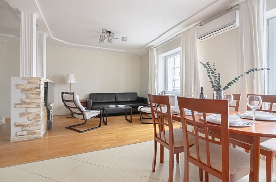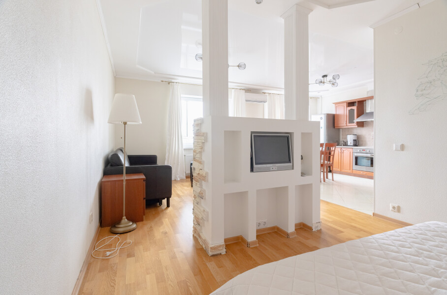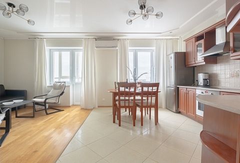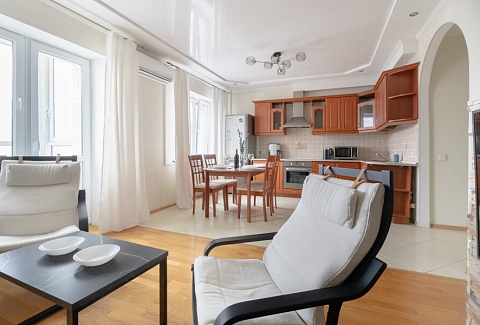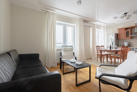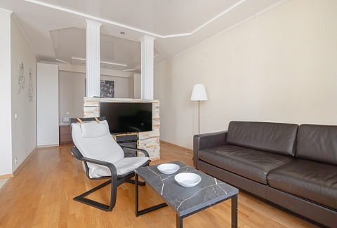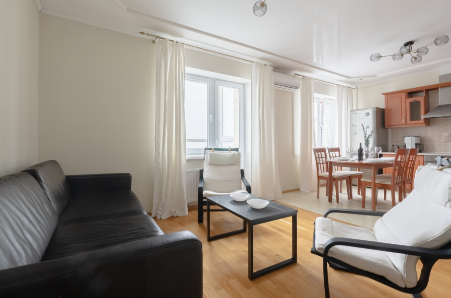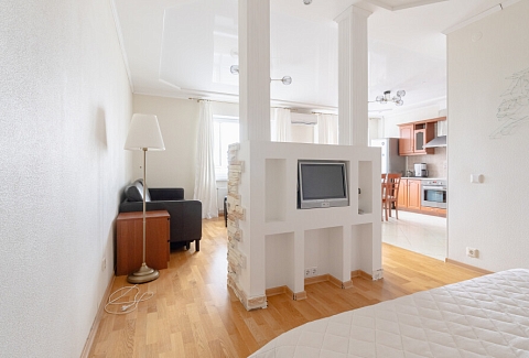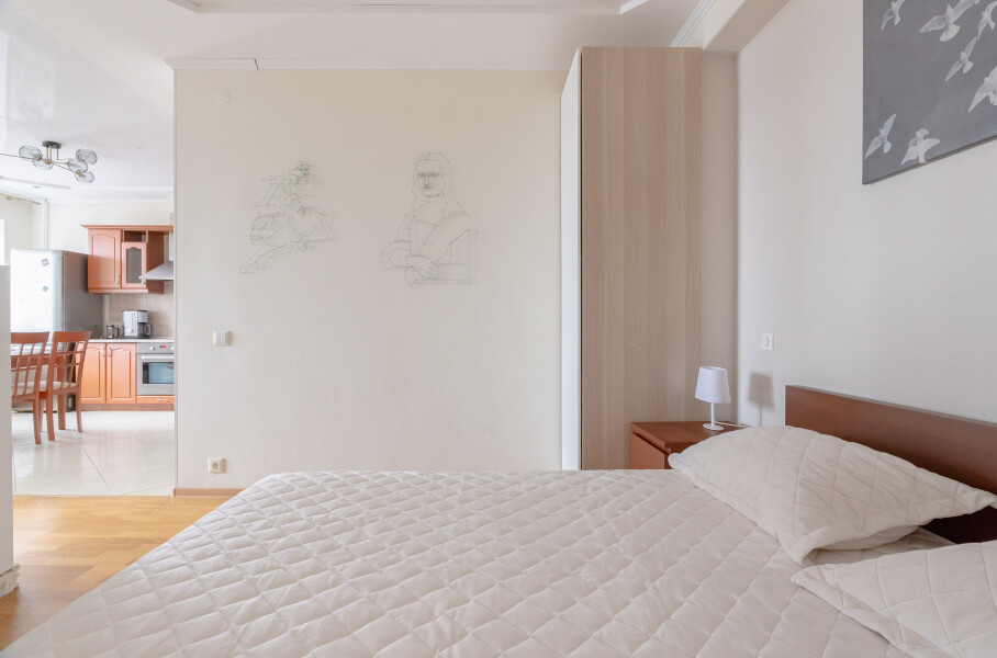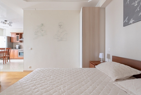 В этой студии гостей ждет полноценный отдых и крепкий сон в комфортной спальне с плотными шторами, возможность продуктивной работы в тихом кабинете, а также восхитительный вид на парк и реку Смоленку с уютной лоджии, где расположены мягкие кресла и столик. Кроме того, доступны разнообразные места для хранения вещей, а для удобства семей с детьми предусмотрена отдельная детская комната.