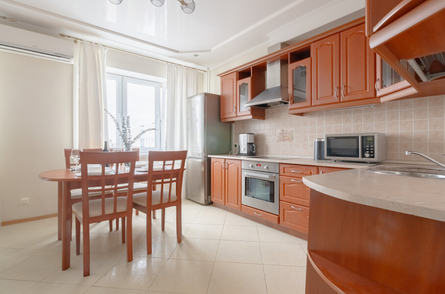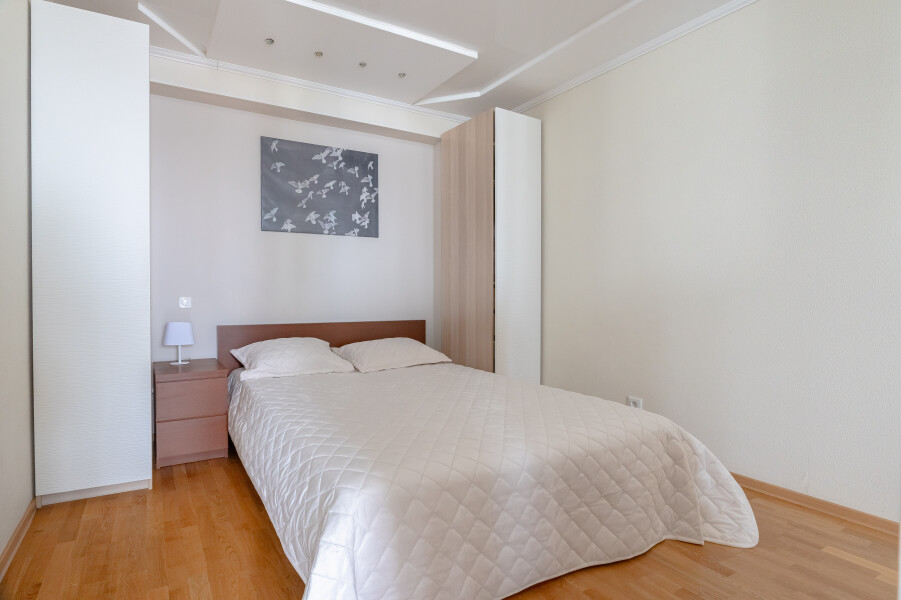 В номере: вешалка, диван раскладной, зеркало, кресло, кровать двуспальная, стол, стулья, шкаф, гладильная доска, духовой шкаф, кондиционер, кофемашина, микроволновая печь, набор посуды, плита электрическая, посудомоечная машина, стиральная машина, телевизор, утюг, холодильник, электрочайник