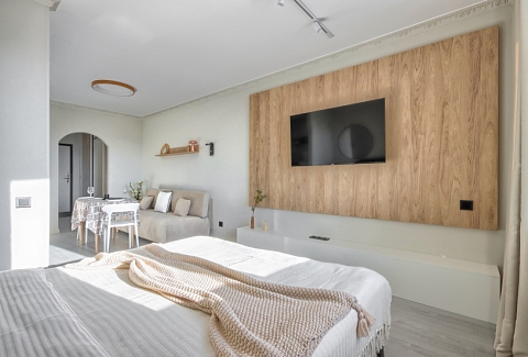 В номере: вешалка, диван, зеркало, кровать двуспальная, прикроватные тумбочки, стол, стулья, шкаф, кондиционер, микроволновая печь, набор посуды, плита электрическая, посудомоечная машина, стиральная машина, сушилка для белья, телевизор, холодильник, электрочайник