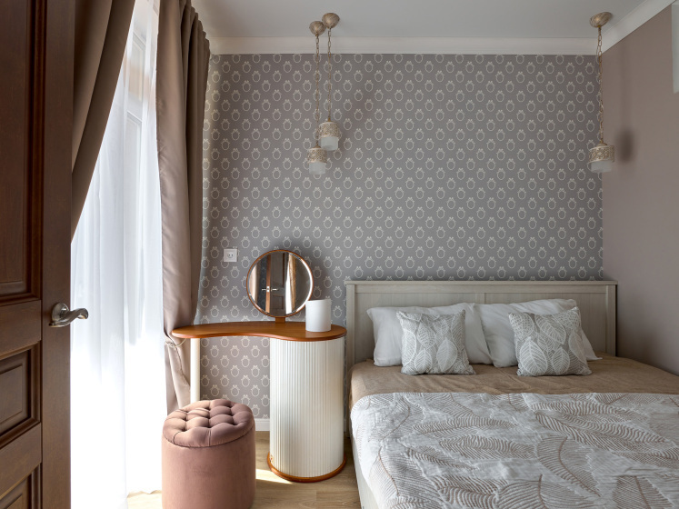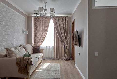 В номере: вешалка, гардеробная, диван раскладной, зеркало, кровать двуспальная, прикроватные тумбочки, стол, стулья, духовой шкаф, микроволновая печь, набор посуды, плита электрическая, посудомоечная машина, стиральная машина, сушилка для белья, телевизор, холодильник, электрочайник