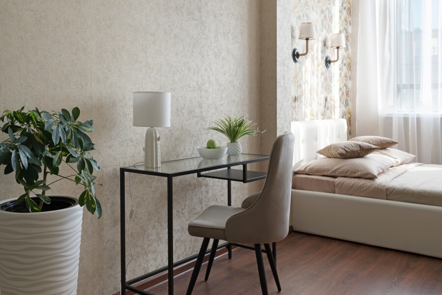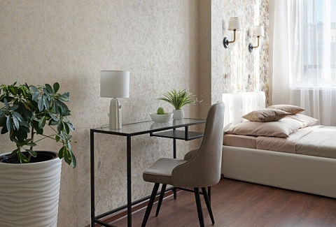 В номере: вешалка, зеркало, кровать двуспальная, прикроватные тумбочки, стол, стулья, шкаф, гладильная доска, микроволновая печь, набор посуды, плита электрическая, стиральная машина, сушилка для белья, телевизор, утюг, холодильник, электрочайник