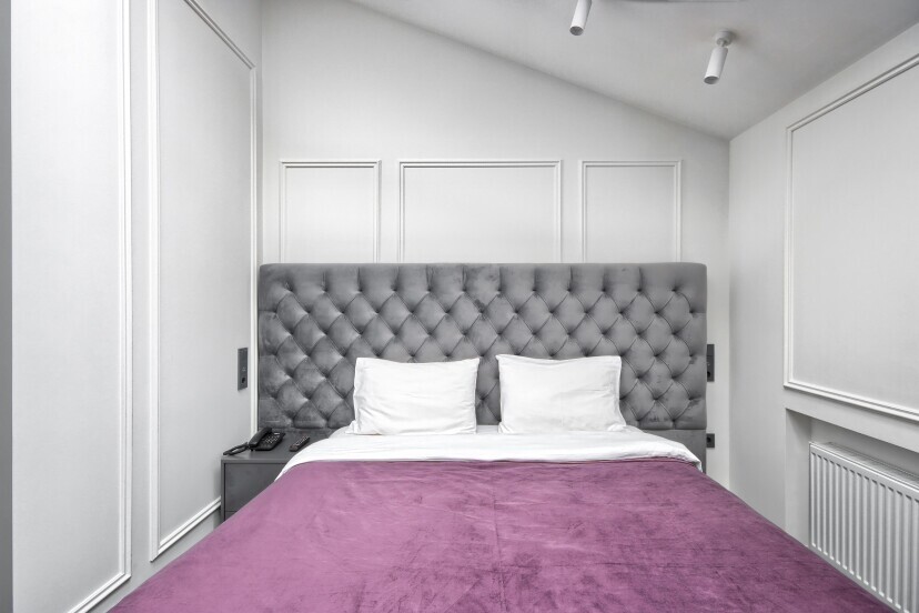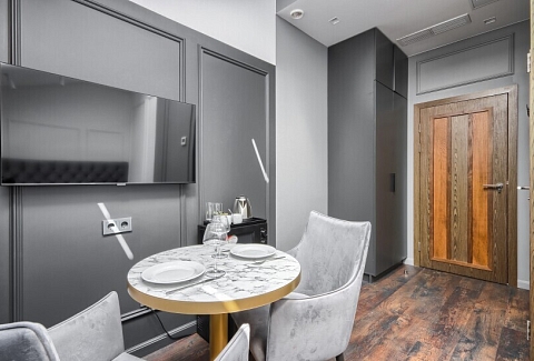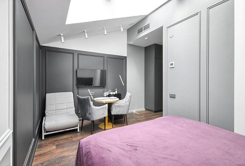 В номере: вешалка, зеркало, кресло-кровать, кровать двуспальная, прикроватные тумбочки, стол, стулья, шкаф, гладильная доска, микроволновая печь, мини-холодильник, набор посуды, сейф, телевизор, утюг, электрочайник