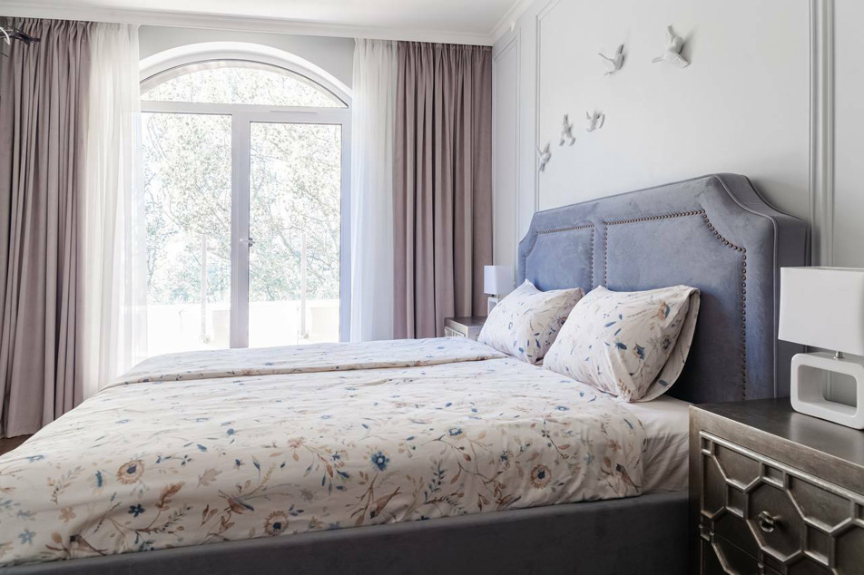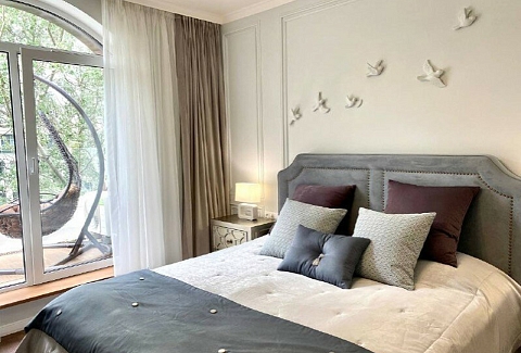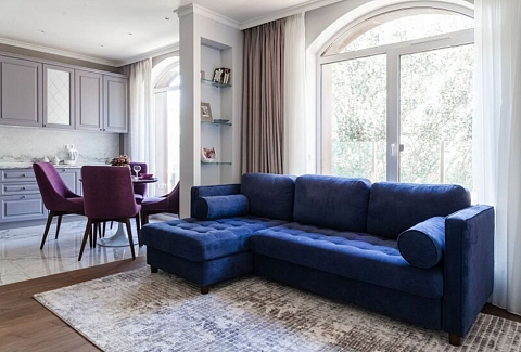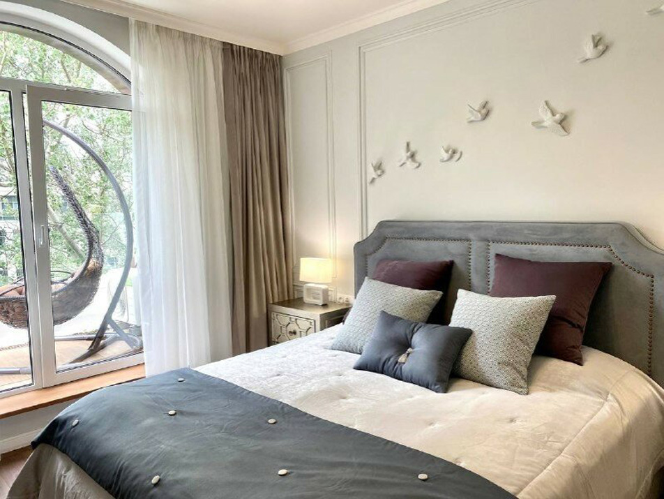 В номере: вешалка, диван, зеркало, кровать двуспальная, прикроватные тумбочки, стол, стулья, шкаф, гладильная доска, духовой шкаф, кондиционер, микроволновая печь, набор посуды, плита электрическая, посудомоечная машина, стиральная машина, сушилка для белья, телевизор, утюг, холодильник, электрочайник