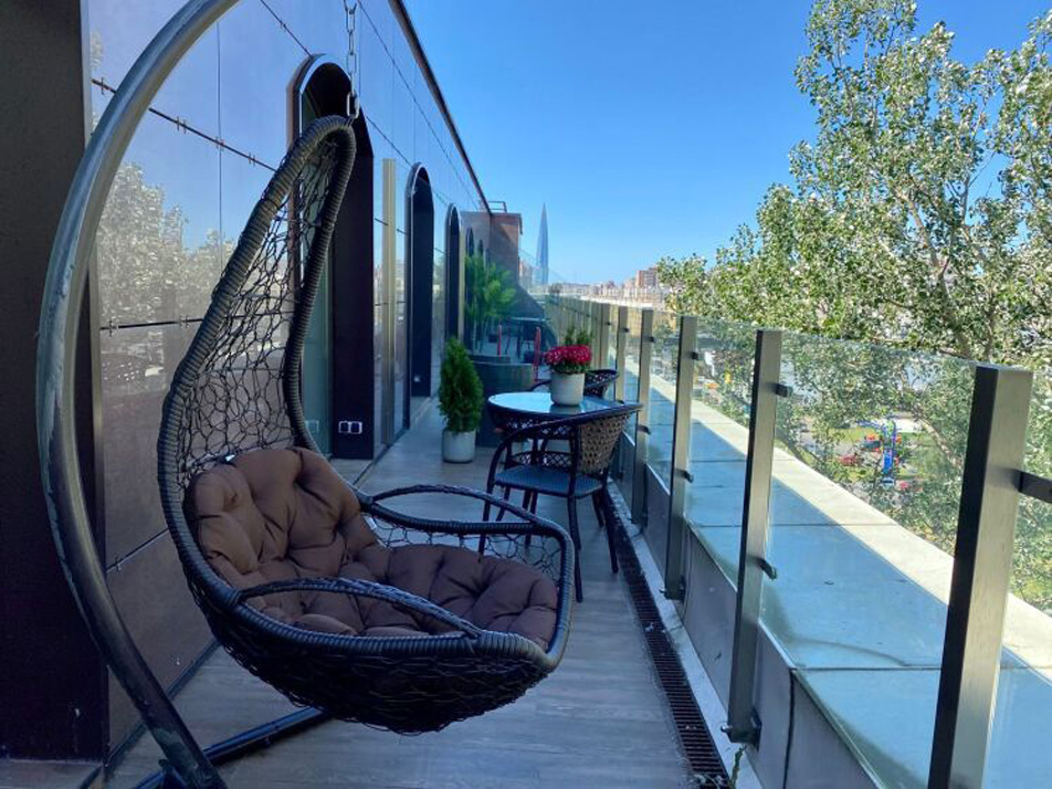 Окна от пола до потолка предлагают захватывающий вид на Лахта-центр. Просторная терраса предоставляет возможность любоваться живописными окрестностями. В индивидуальной ванной комнате установлена душевая, ванна и система подогрева пола.