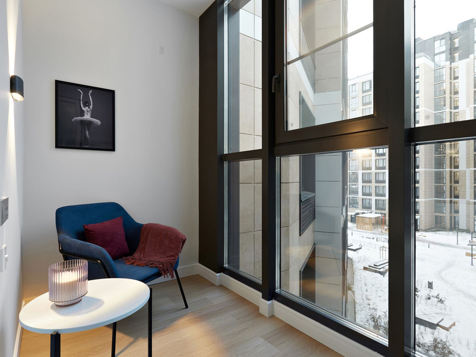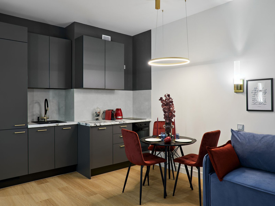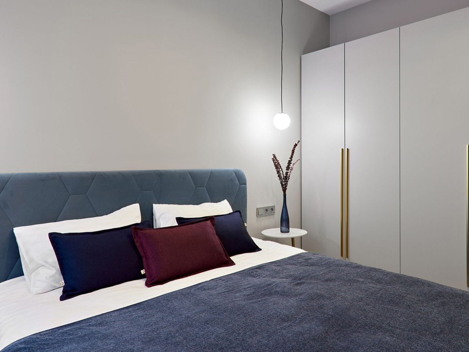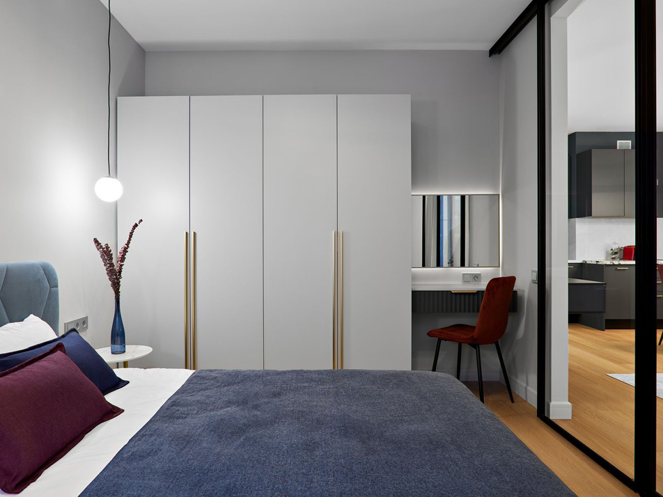 В номере: вешалка, диван раскладной, зеркало, кровать двуспальная, прикроватные тумбочки, стол, стулья, шкаф, гладильная доска, духовой шкаф, кофемашина, микроволновая печь, набор посуды, плита электрическая, посудомоечная машина, стиральная машина, телевизор, утюг, холодильник, электрочайник