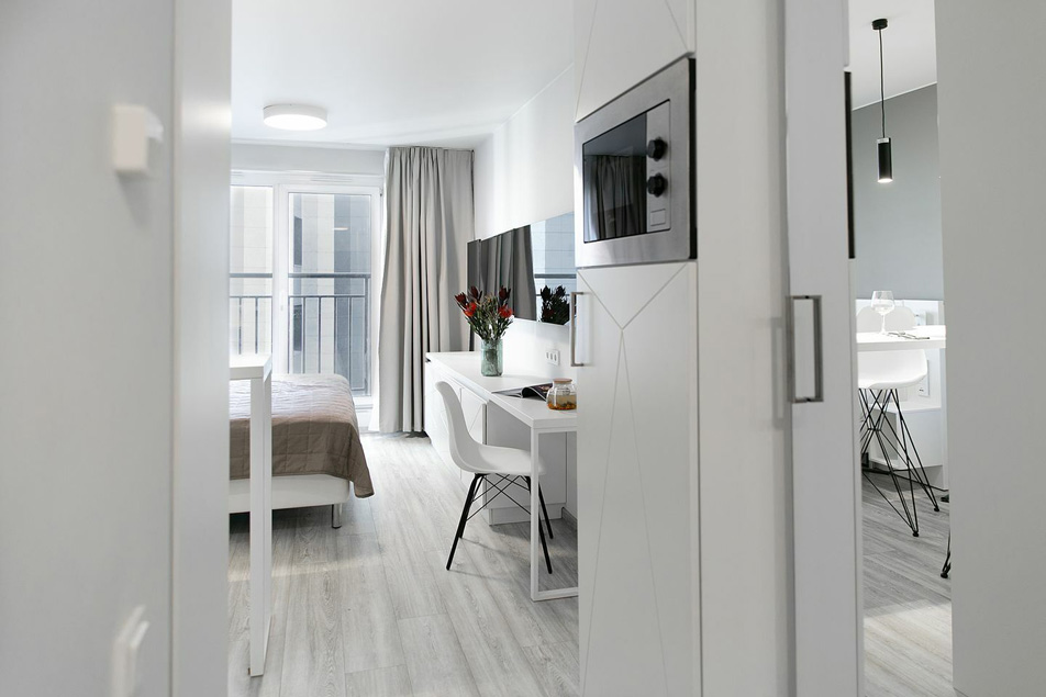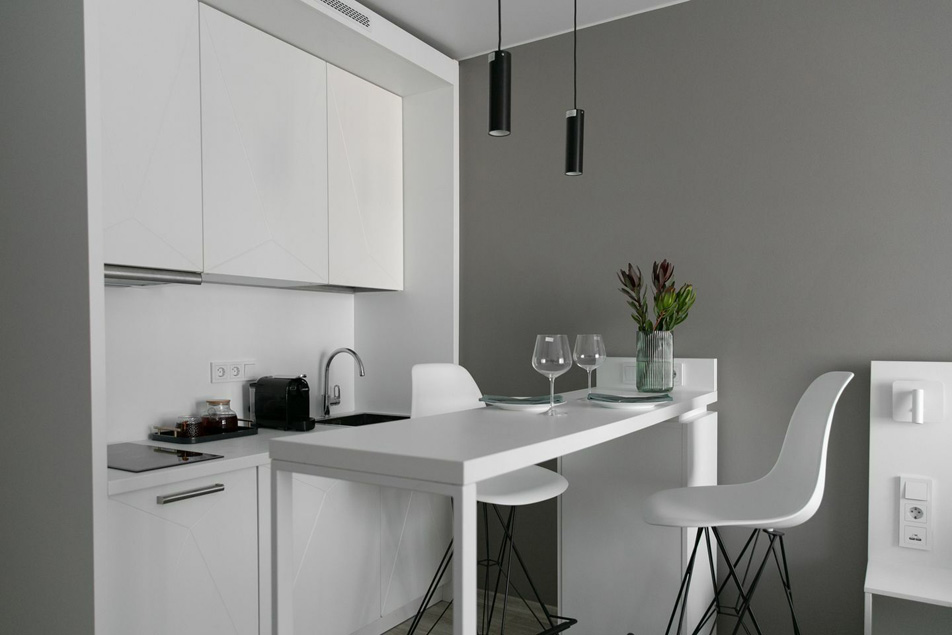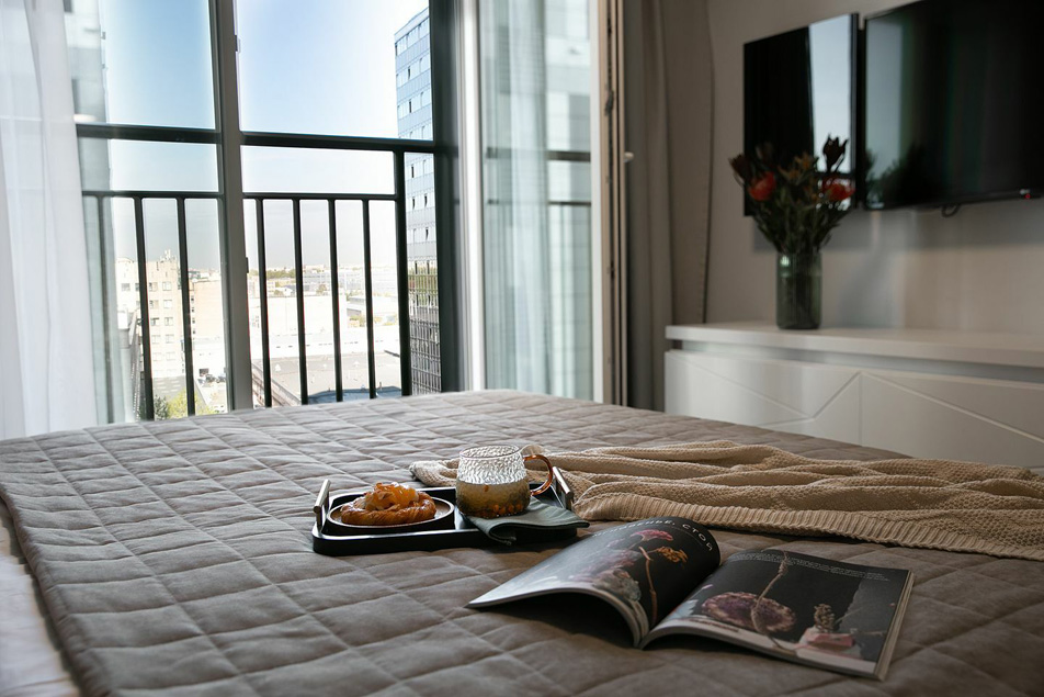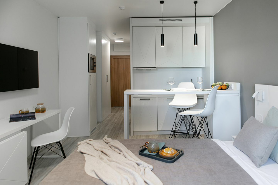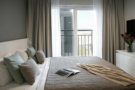В номере: вешалка, зеркало, кровать двуспальная, прикроватные тумбочки, стол, стулья, шкаф, гладильная доска, кондиционер, кофемашина, микроволновая печь, мини-холодильник, набор посуды, плита электрическая, посудомоечная машина, стиральная машина, сушилка для белья, телевизор, утюг, электрочайник