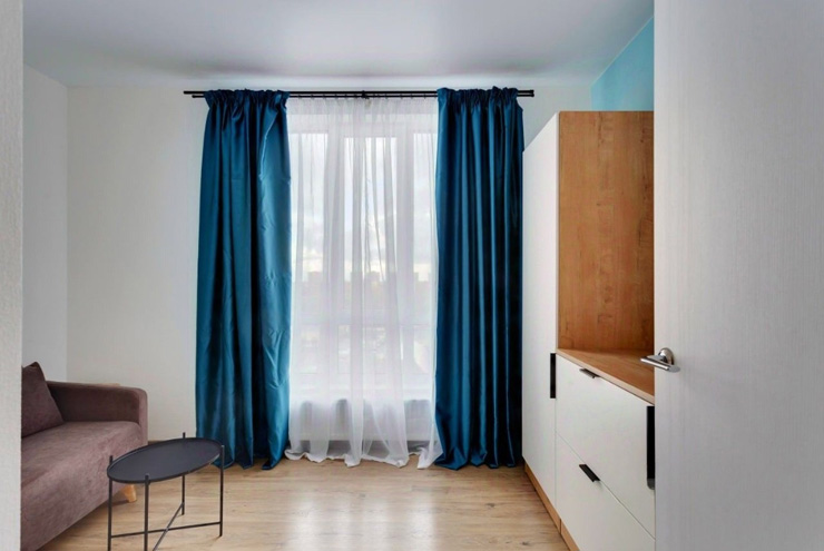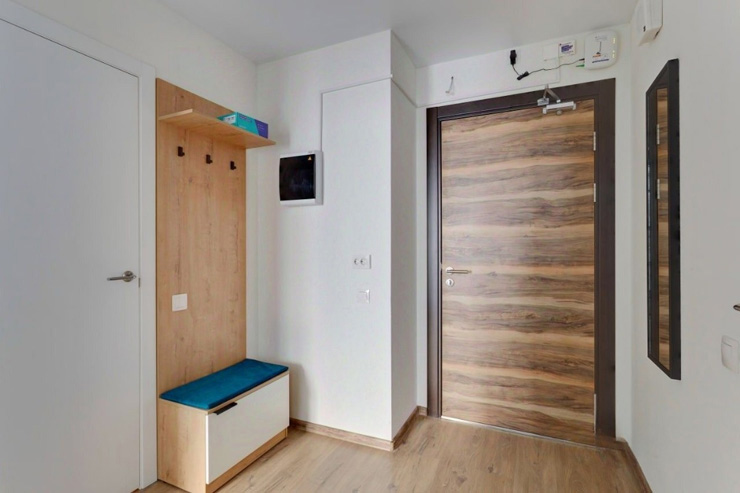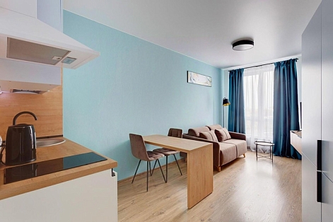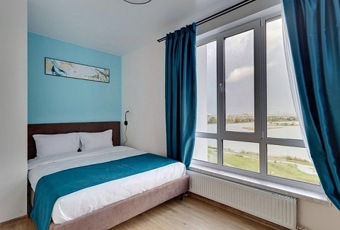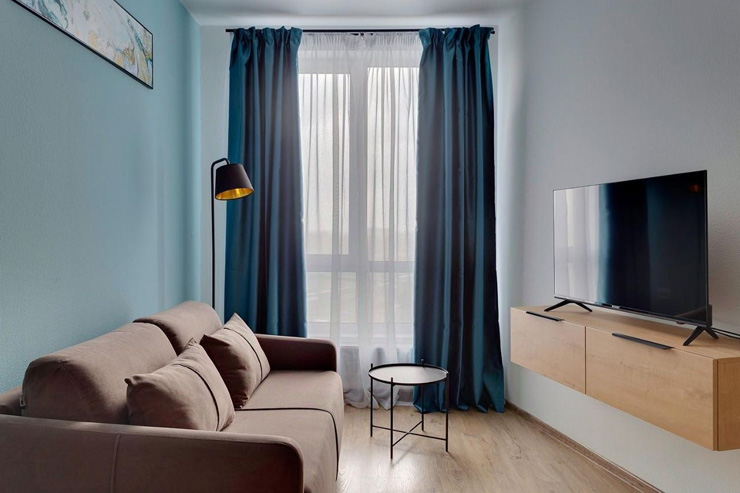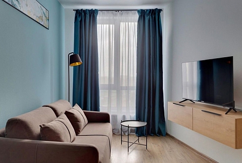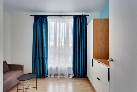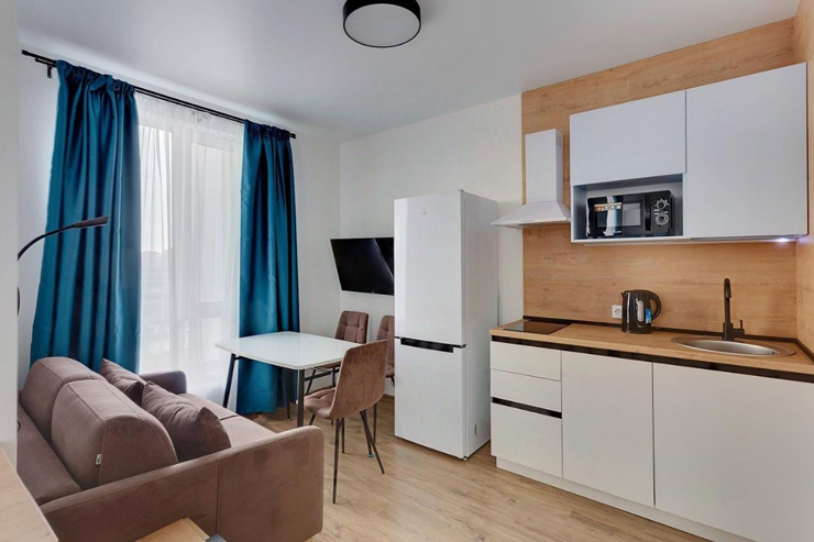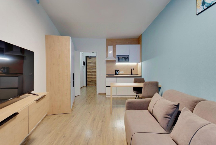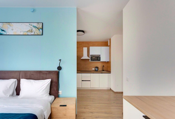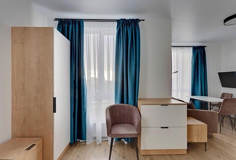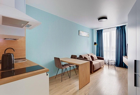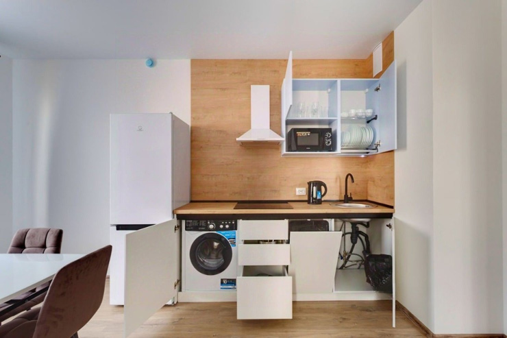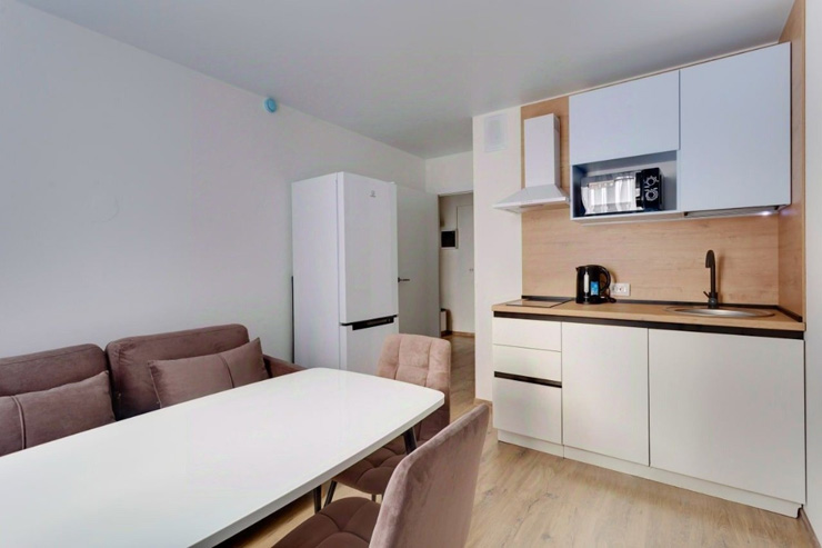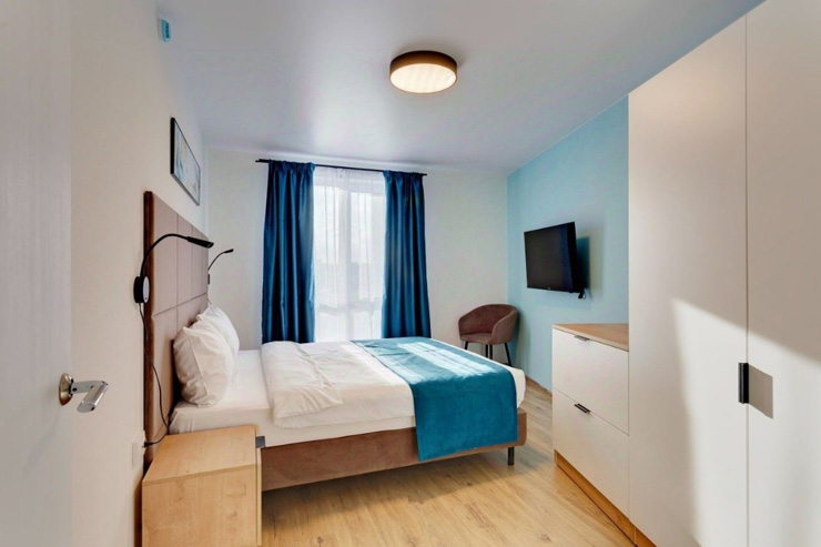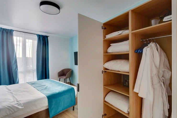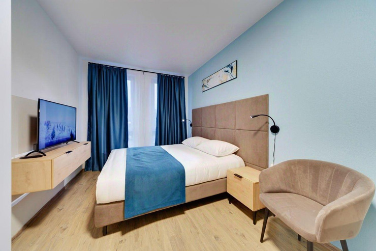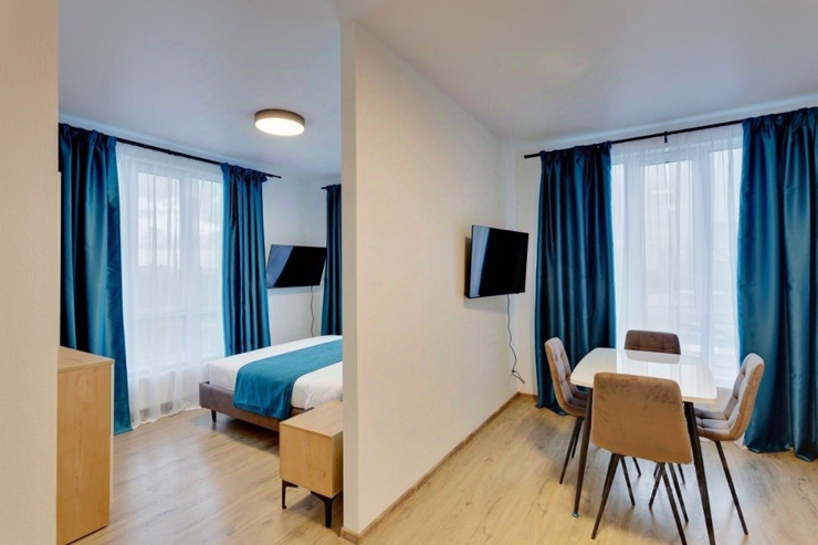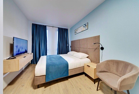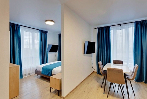 В номере: диван раскладной, стол, стулья, шкаф, гладильная доска, микроволновая печь, мини-холодильник, набор посуды, плита электрическая, посудомоечная машина, телевизор, утюг, электрочайник