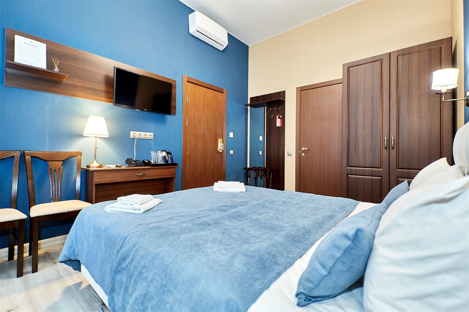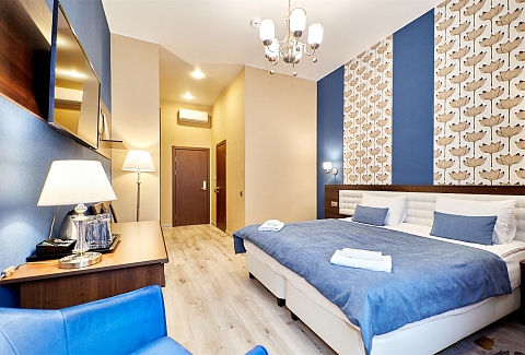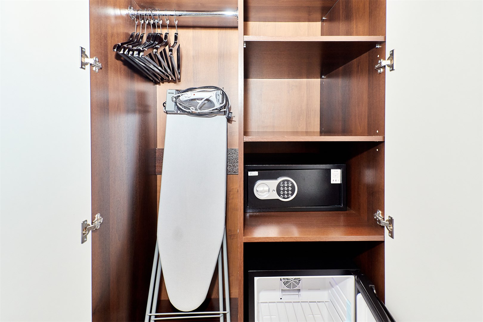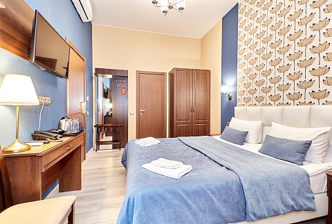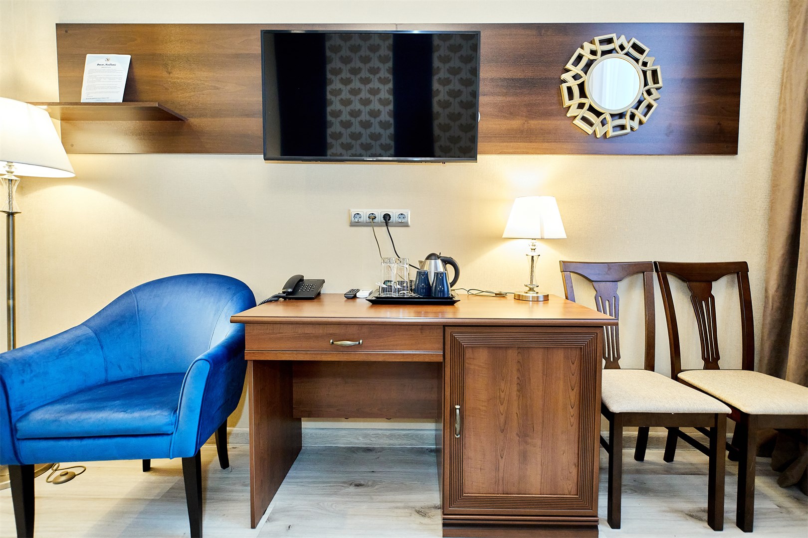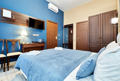 В номере: зеркало, кровать двуспальная, прикроватные тумбочки, стол, стулья, шкаф, гладильная доска, кондиционер, мини-холодильник, сейф, телевизор, телефон, утюг, чайный набор посуды, электрочайник