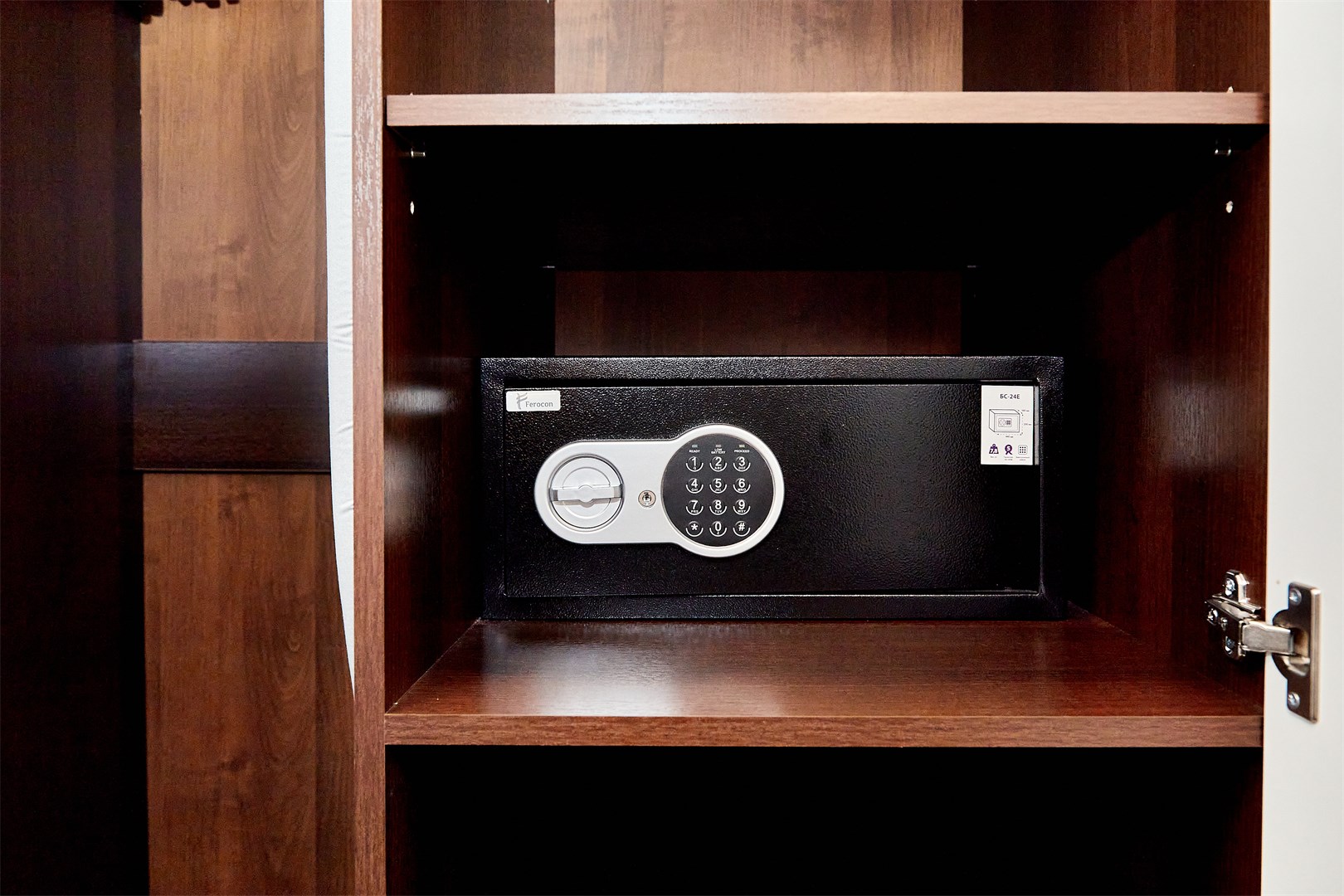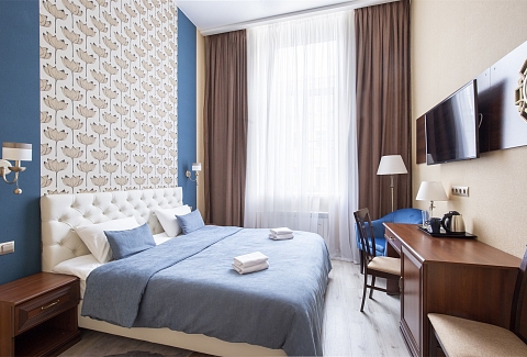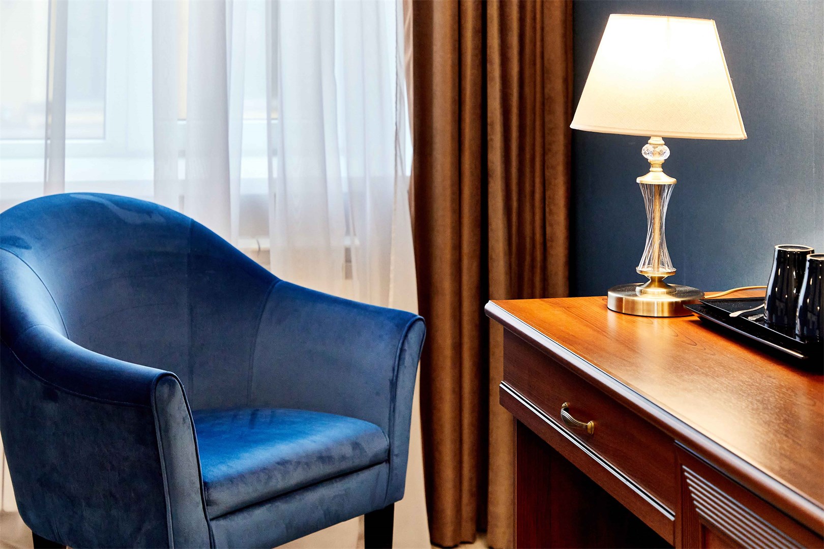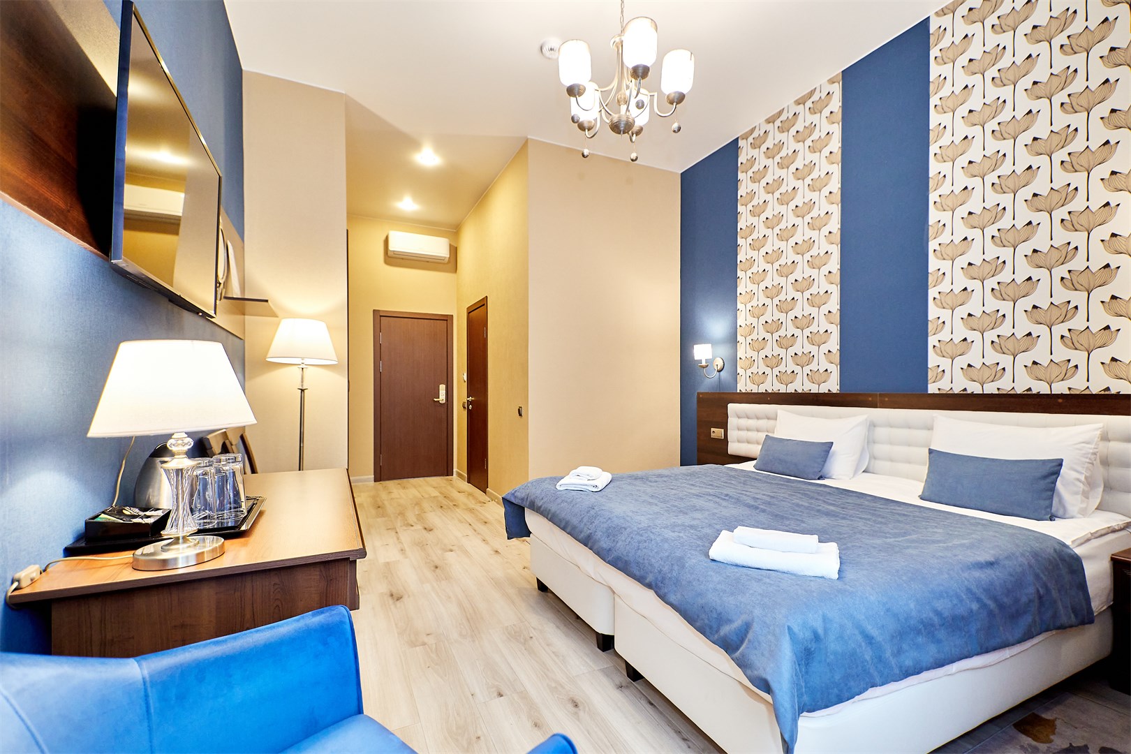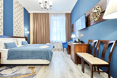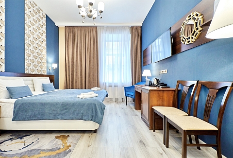 В номере: зеркало, кровать двуспальная, прикроватные тумбочки, стол, стулья, шкаф, гладильная доска, кондиционер, мини-холодильник, сейф, телевизор, телефон, утюг, чайный набор посуды, электрочайник