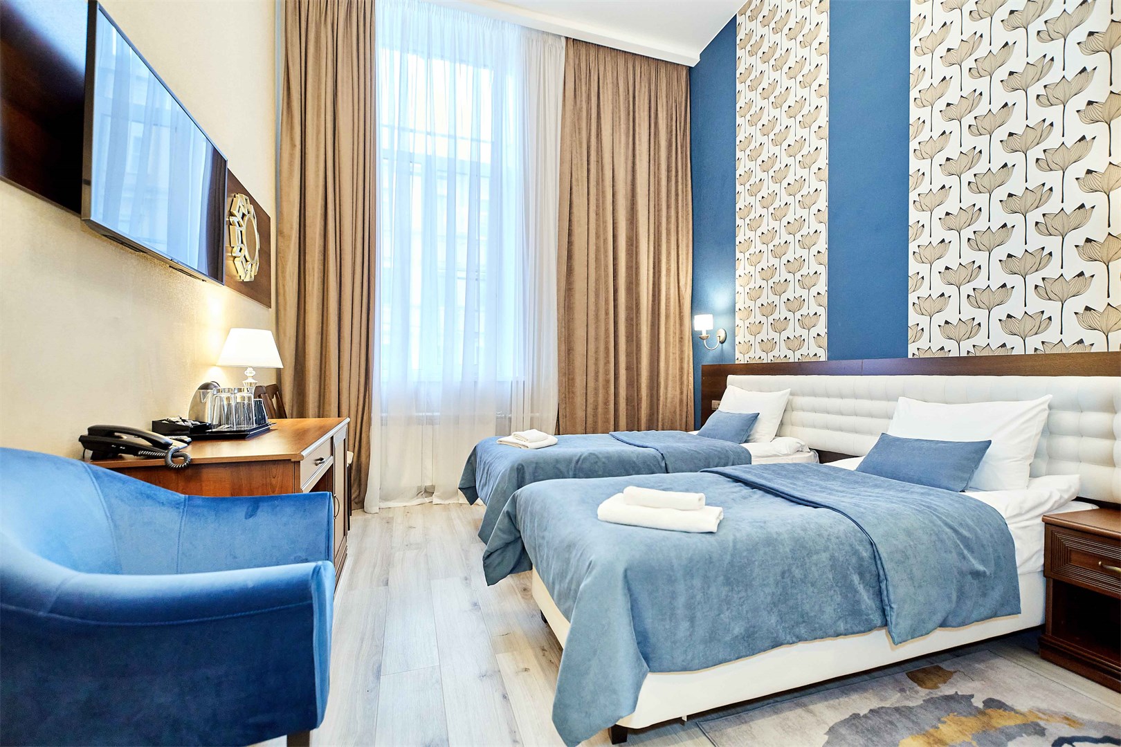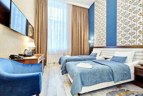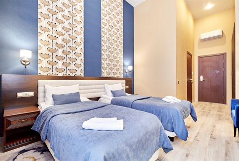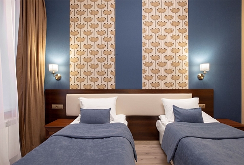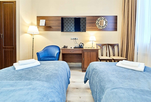 В номере: зеркало, кровати односпальные, прикроватные тумбочки, стол, стулья, шкаф, гладильная доска, кондиционер, мини-холодильник, сейф, телевизор, телефон, утюг, чайный набор посуды, электрочайник