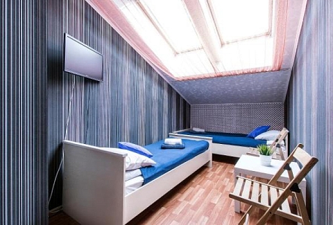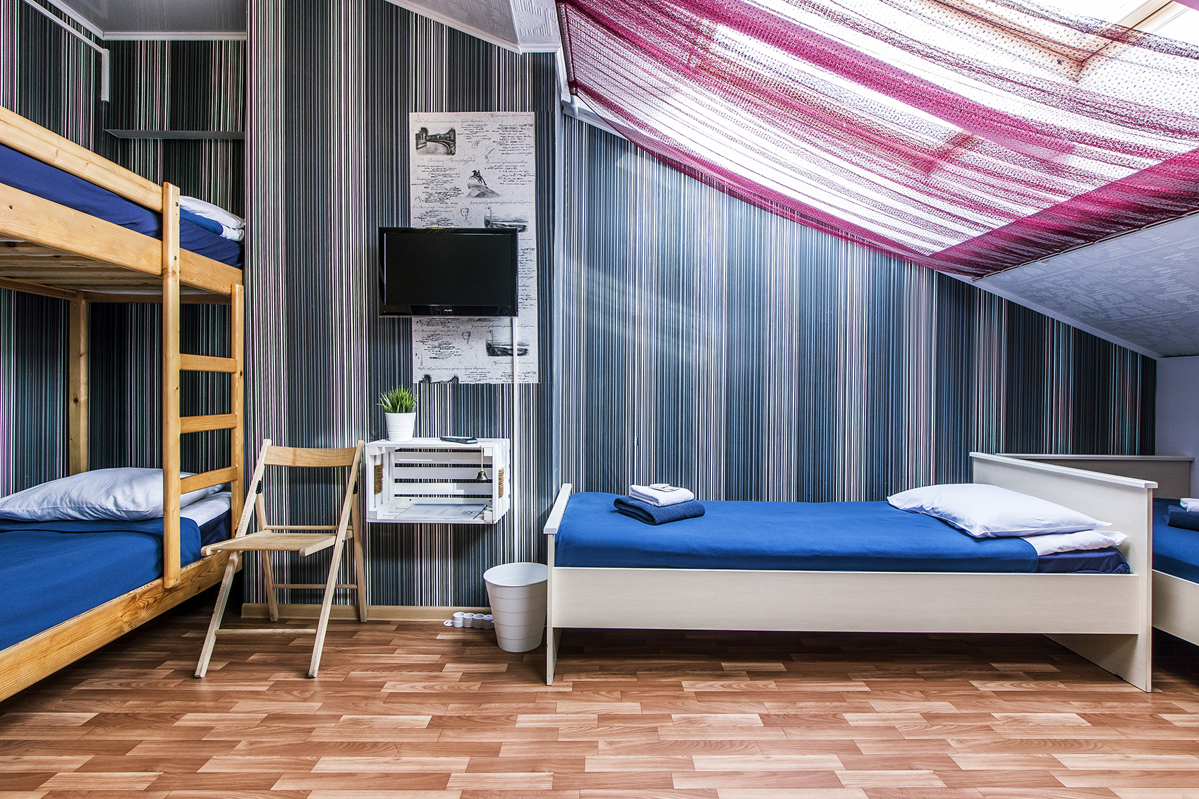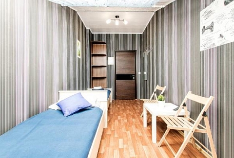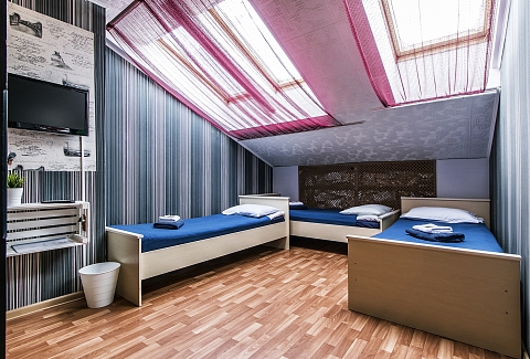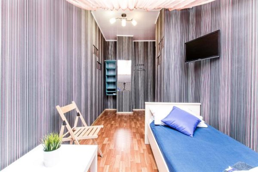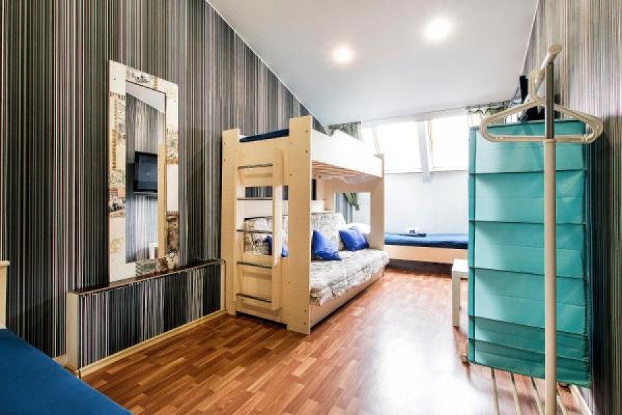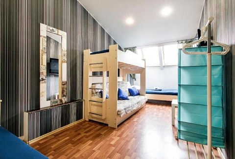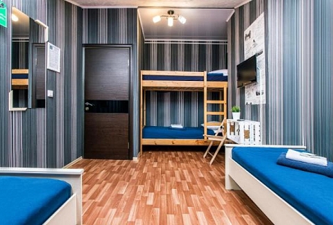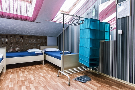 В номере: вешалка, кровати односпальные, кровать двухъярусная, стол, стулья, телевизор