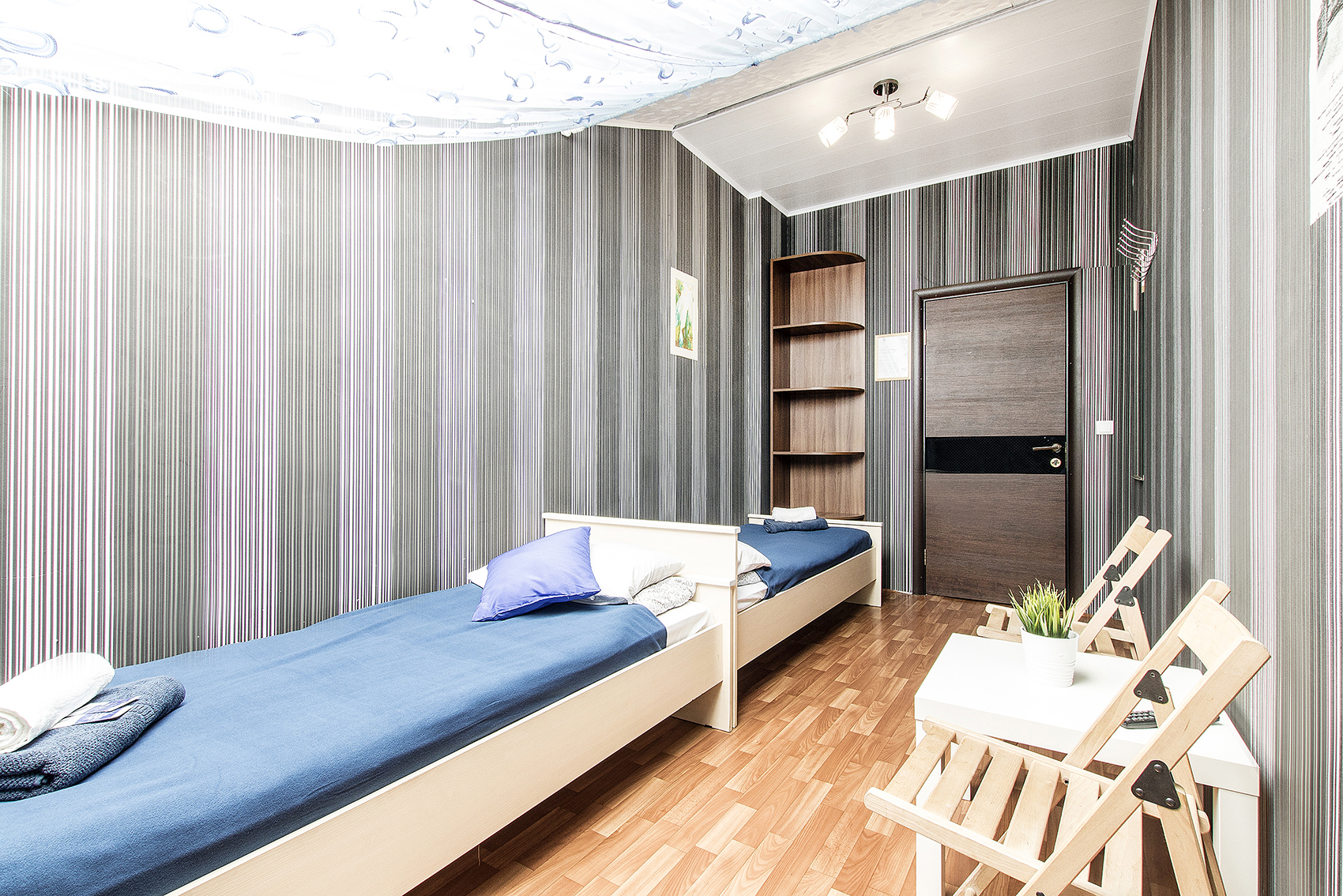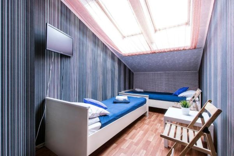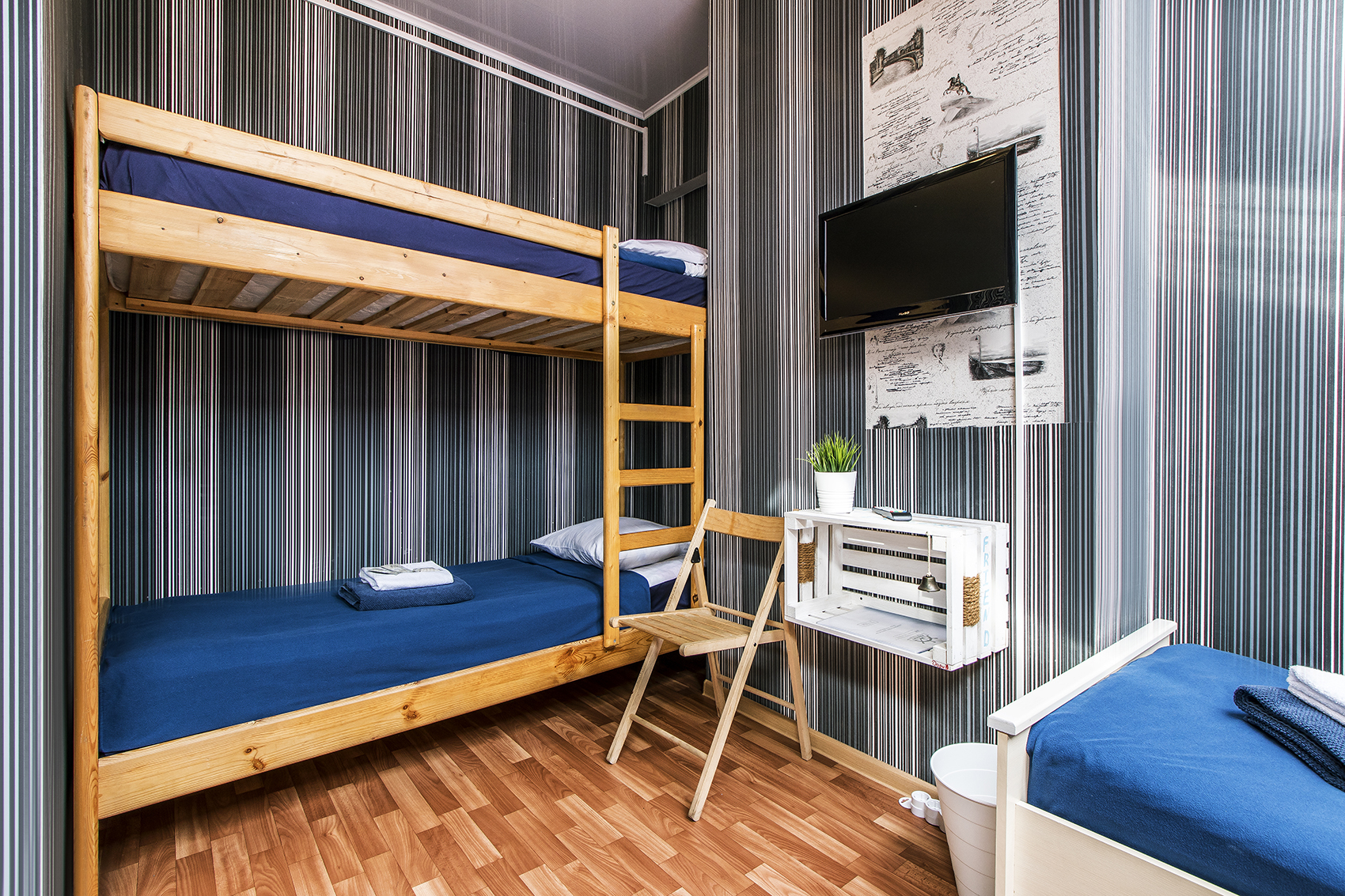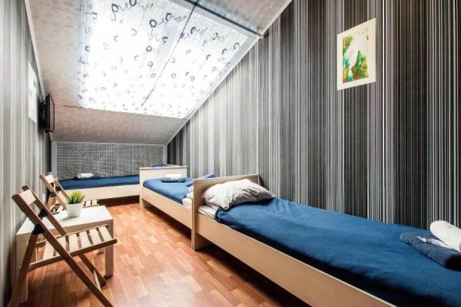 В номере: вешалка, кровати односпальные, кровать двухъярусная, стол, стулья, телевизор