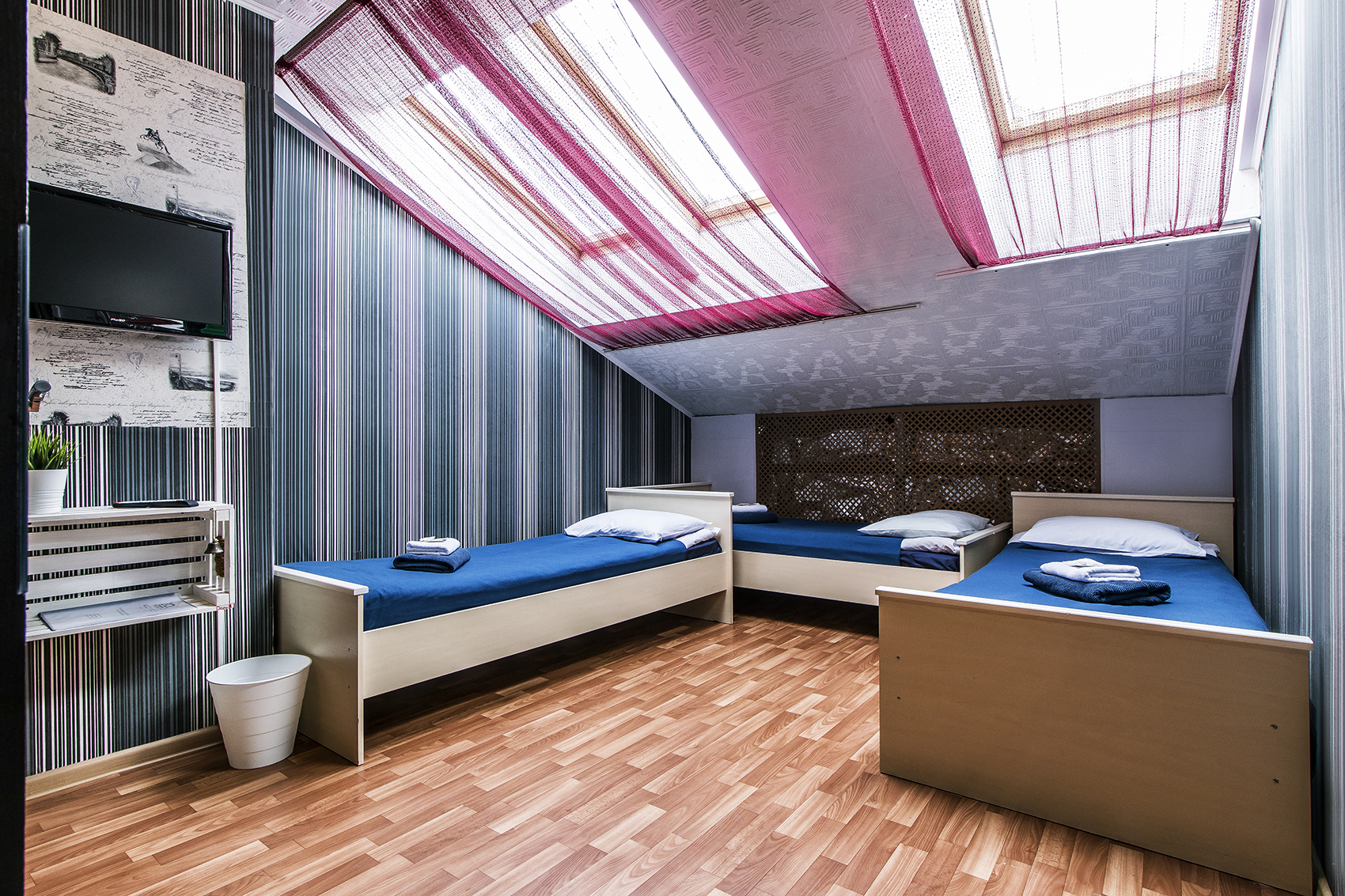 В номере: вешалка, кровати односпальные, кровать двухъярусная, стол, стулья, шкаф, телевизор