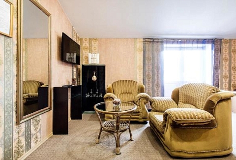 В номере: вешалка, диван, зеркало, кресла, кровать двуспальная, стол, шкаф, мини-холодильник, телевизор