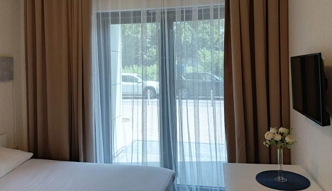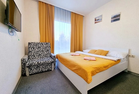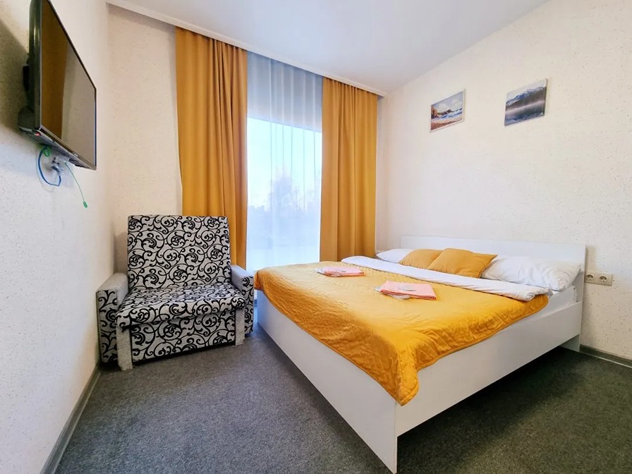 В номере: вешалка, зеркало, кресло-кровать, кровать двуспальная, микроволновая печь, мини-холодильник, набор посуды, плита электрическая, телевизор