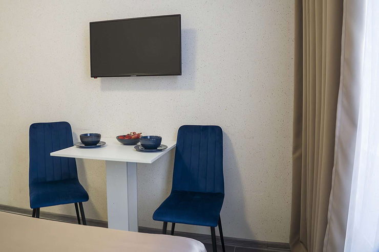 В номере: вешалка, зеркало, кресло, кровать двуспальная, кухонная мебель, прикроватная тумбочка, столик журнальный, вентилятор, микроволновая печь, мини-холодильник, набор посуды, плита электрическая, телевизор, чайный набор посуды, электрочайник