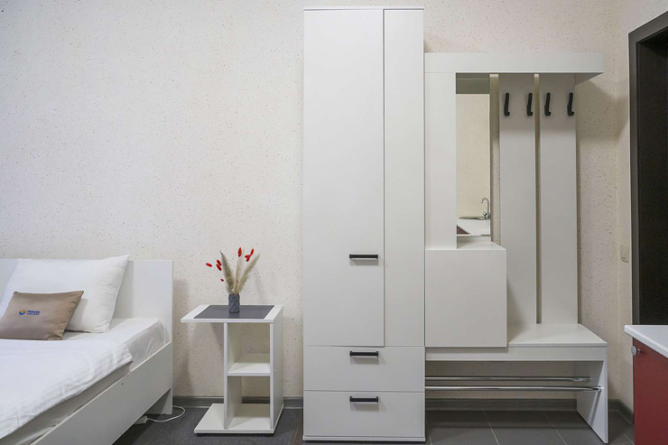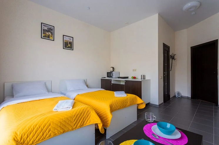 В номере: вешалка, зеркало, кровати односпальные, кухонная мебель, прикроватный столик, столик журнальный, микроволновая печь, мини-холодильник, набор посуды, плита электрическая, телевизор