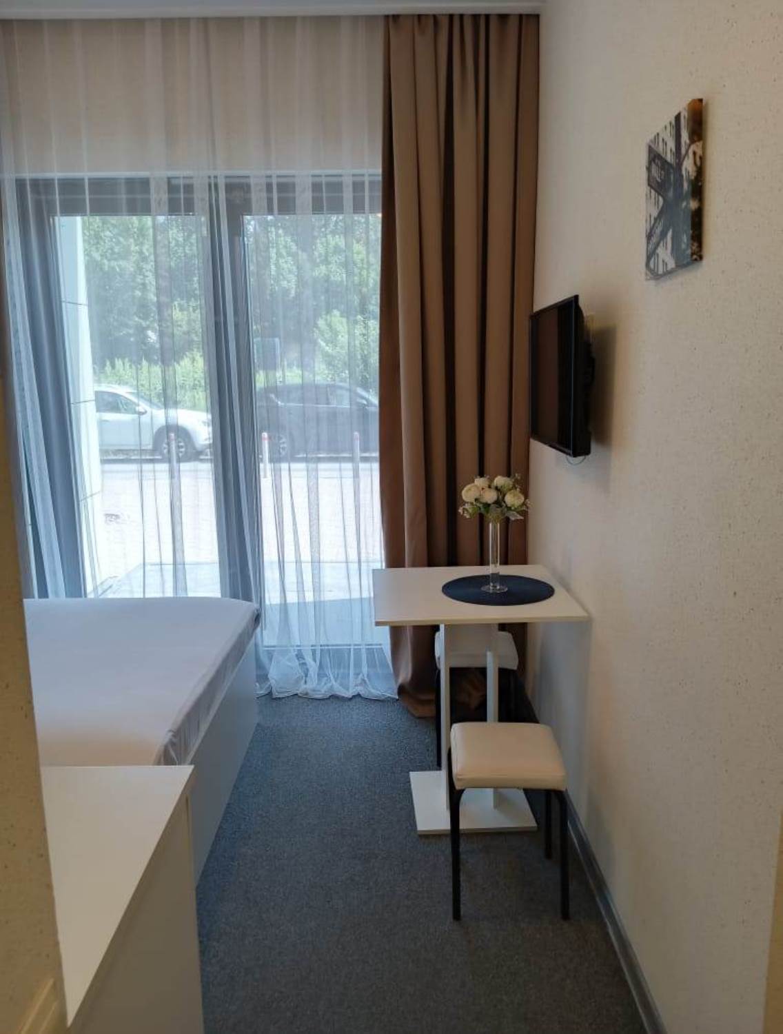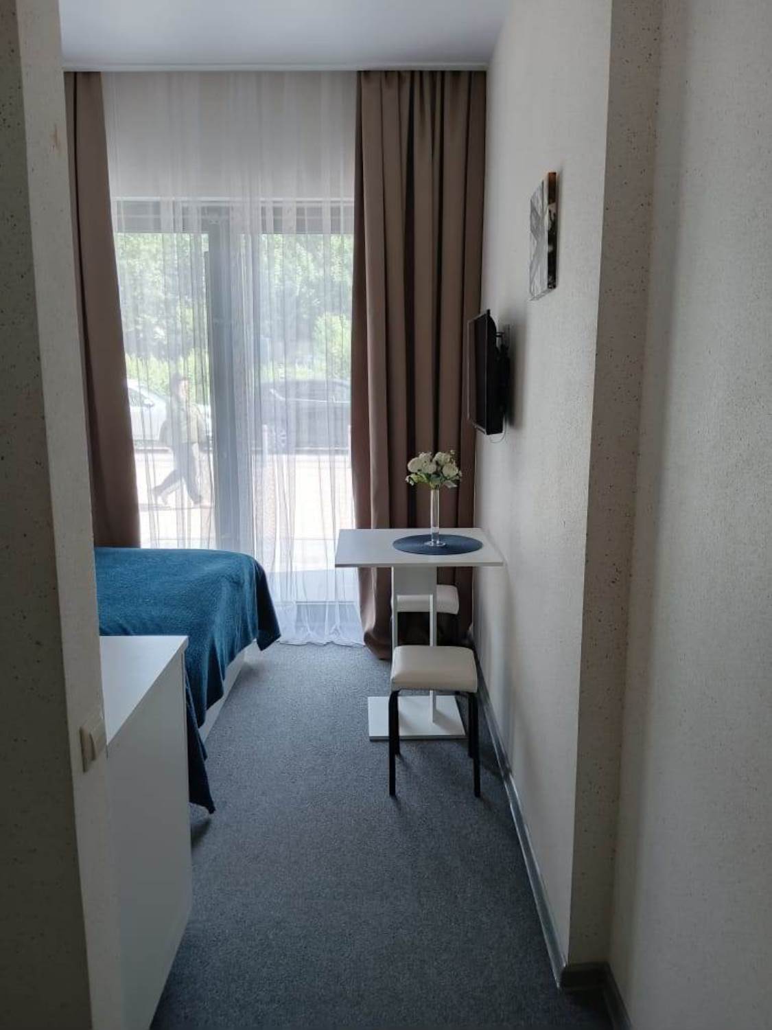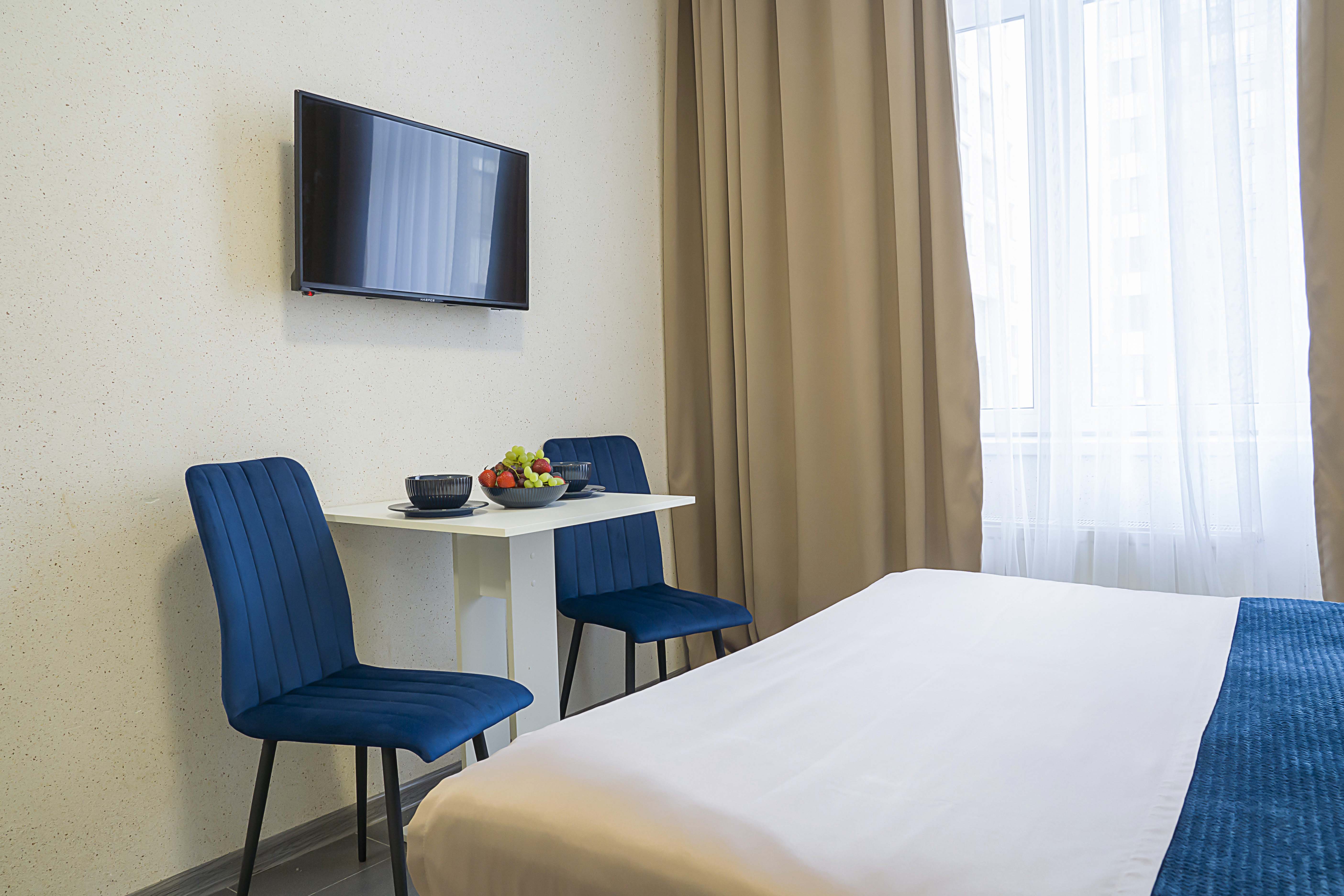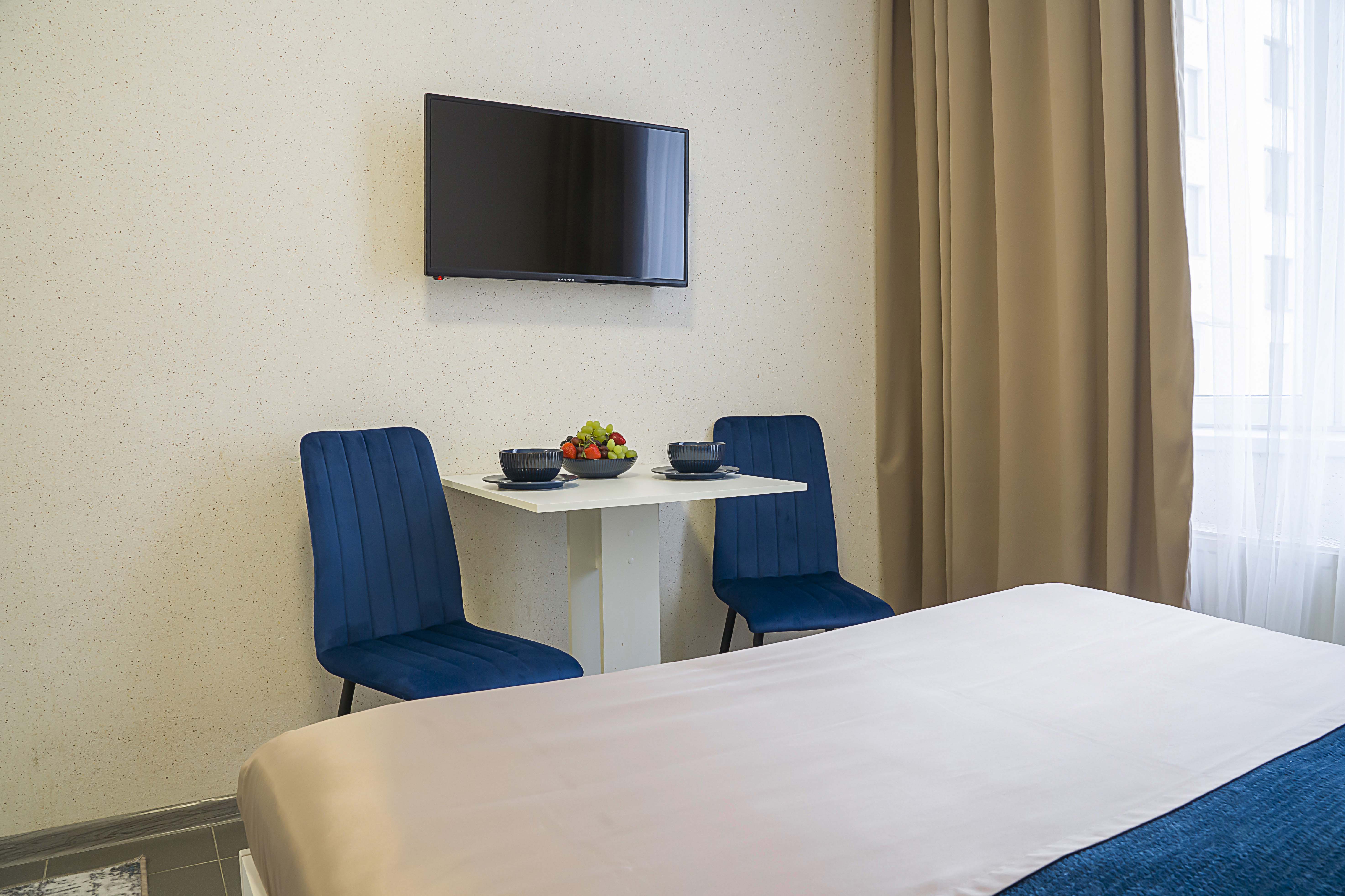 В номере: вешалка, зеркало, кровать двуспальная, прикроватные тумбочки, стол, стулья, телевизор