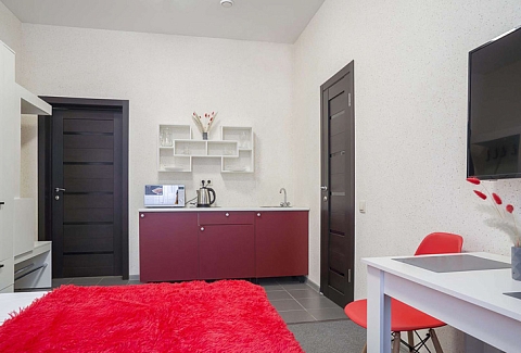 В номере: вешалка, зеркало, кровать двуспальная, кухонная мебель, прикроватный столик, стол, стулья, микроволновая печь, мини-холодильник, набор посуды, плита электрическая, телевизор