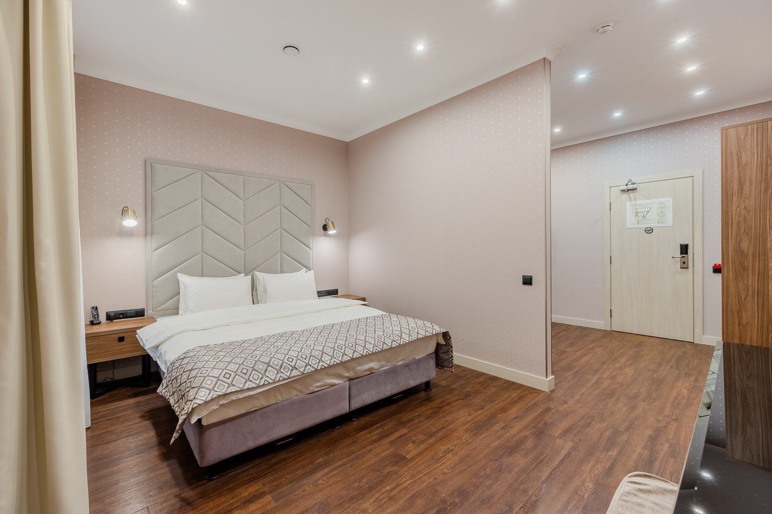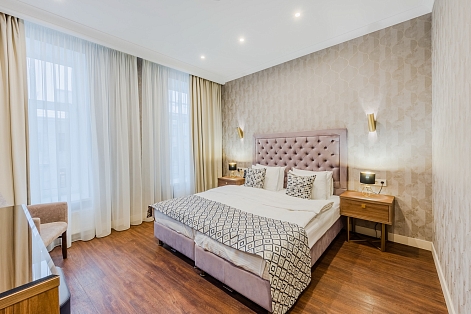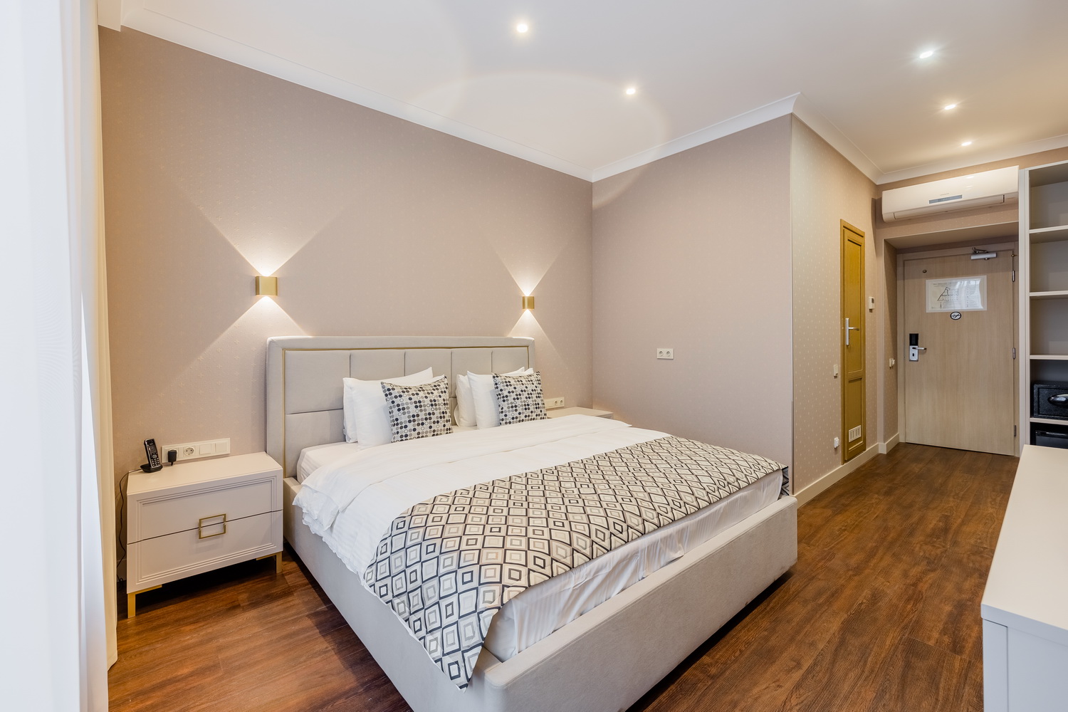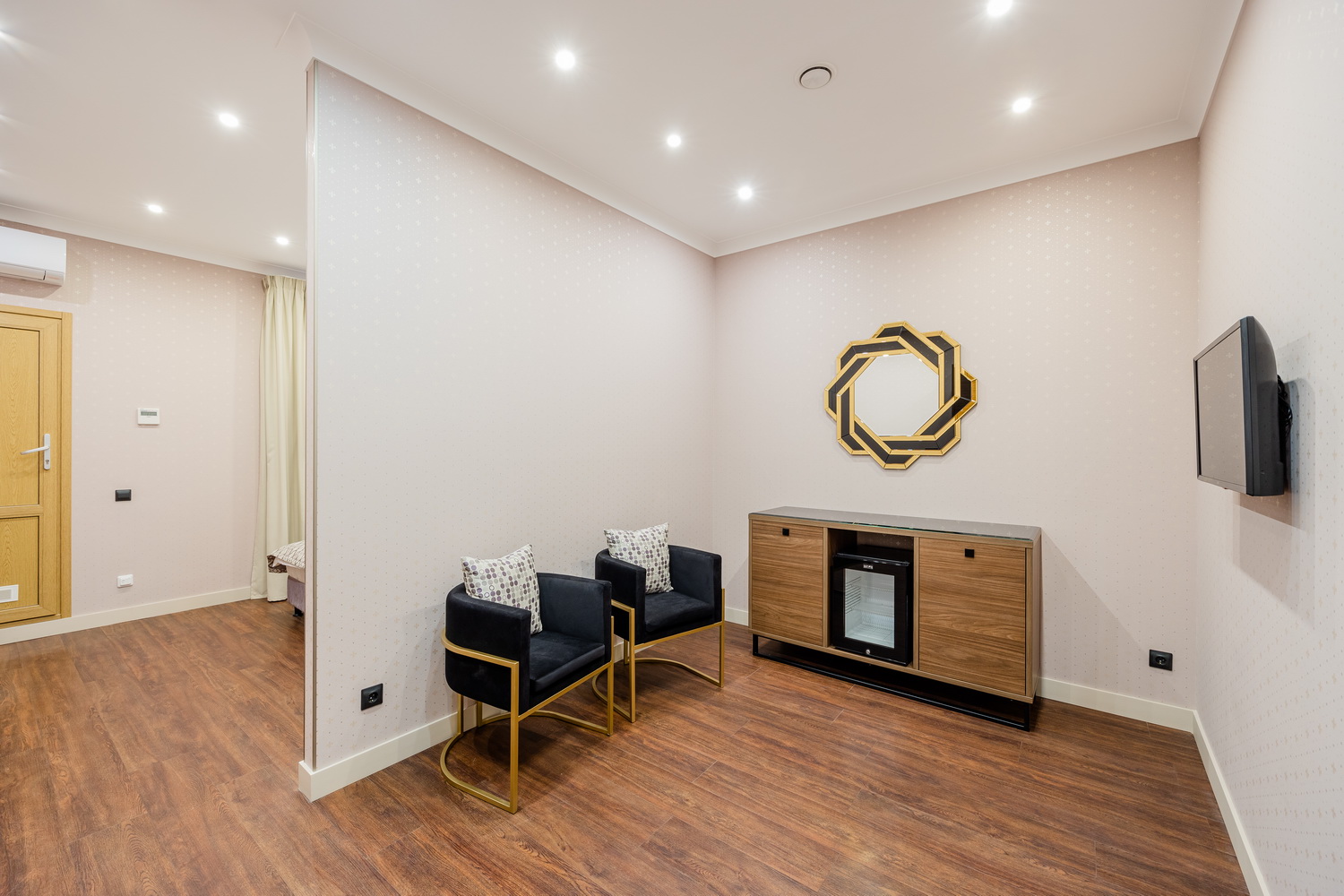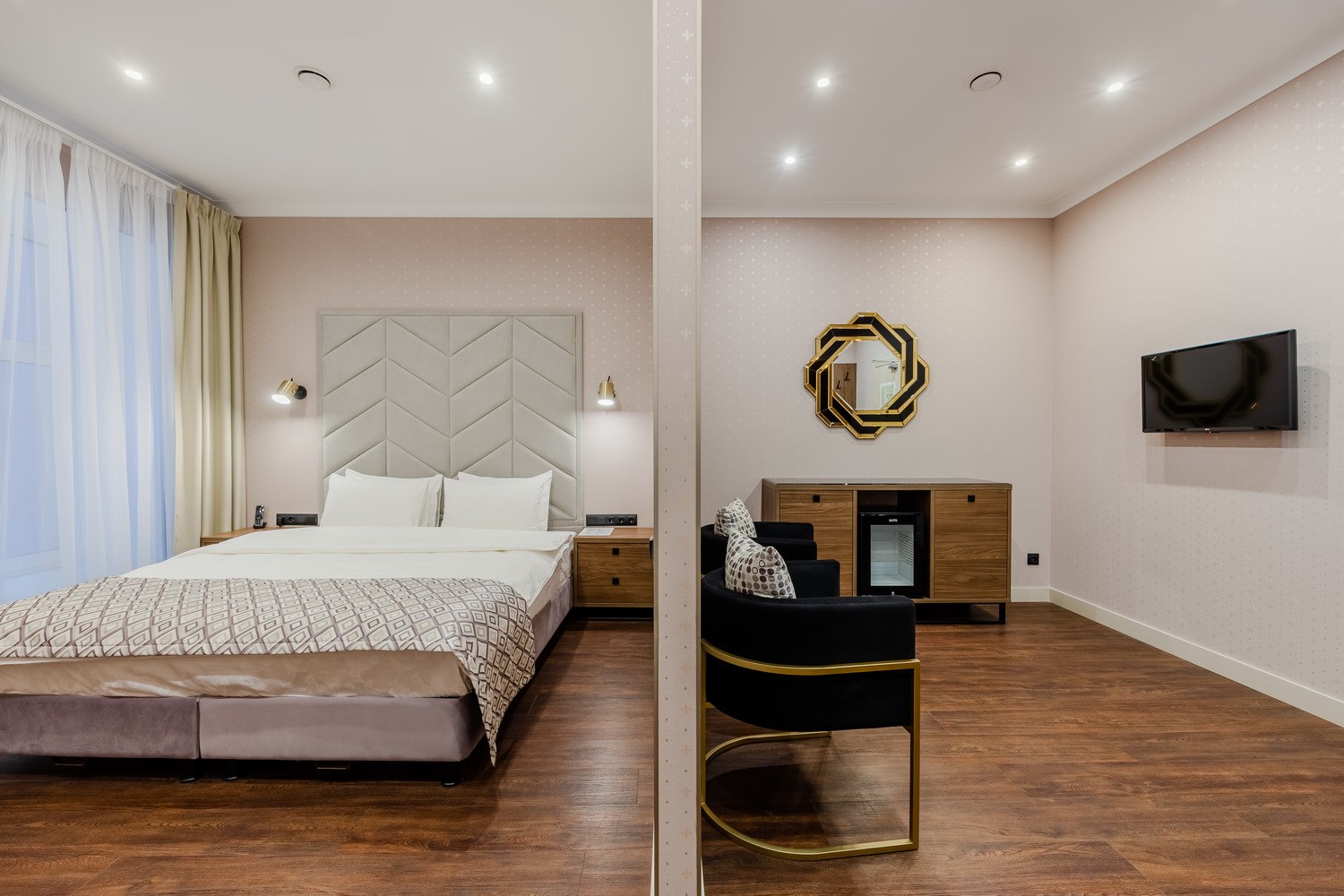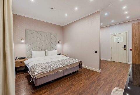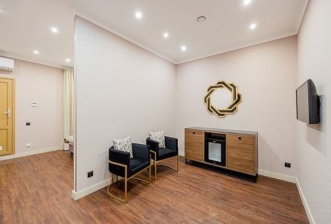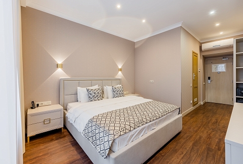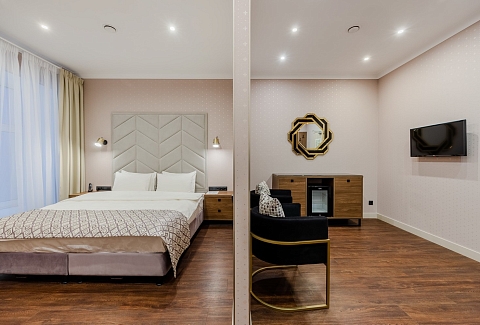 В номере: вешалка, диван раскладной, зеркало, кровать двуспальная, прикроватные тумбочки, стол, столик журнальный, стулья, тумба багажная, шкаф, кондиционер, сейф, телевизор, телефон, холодильник, чайная станция