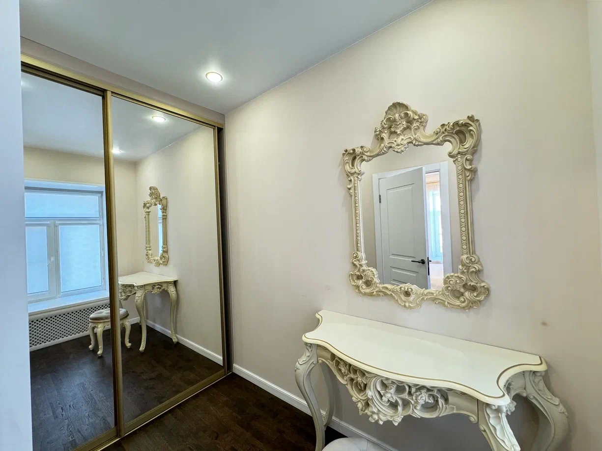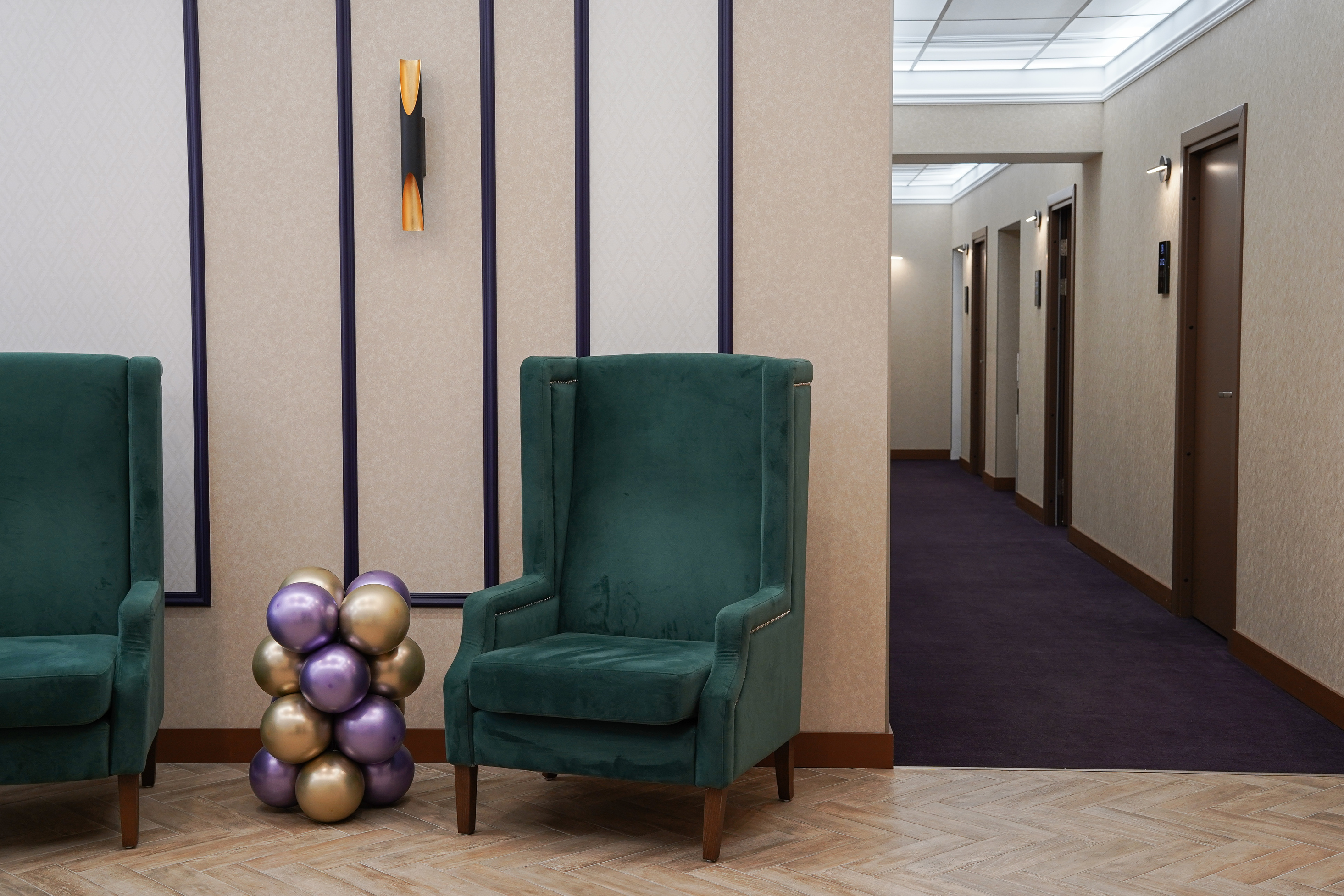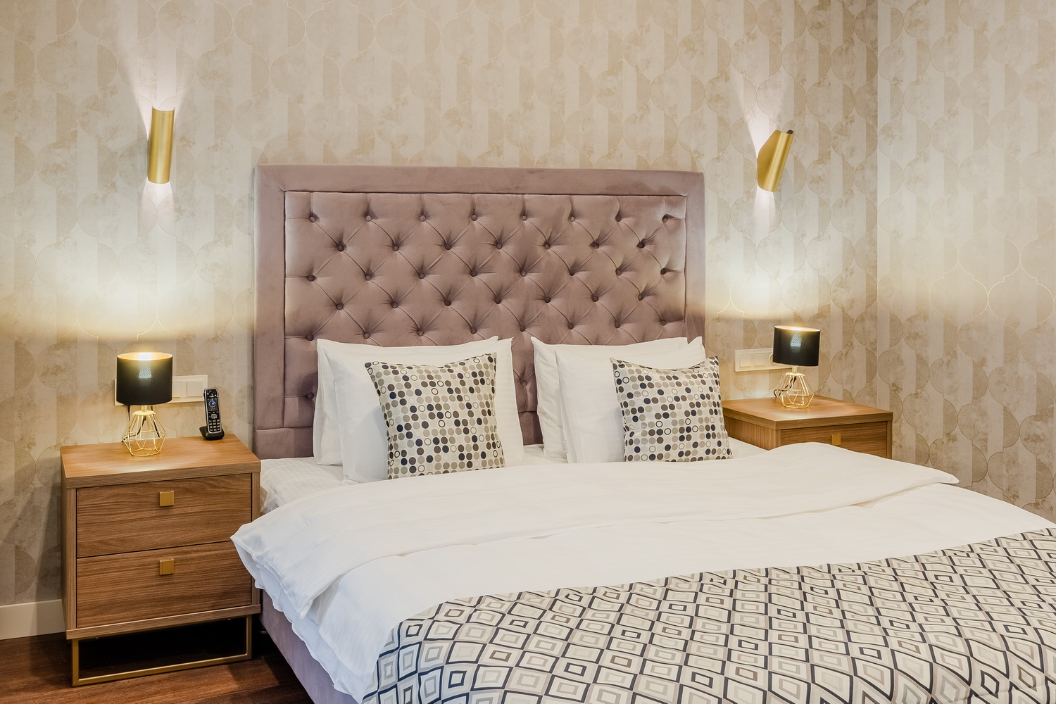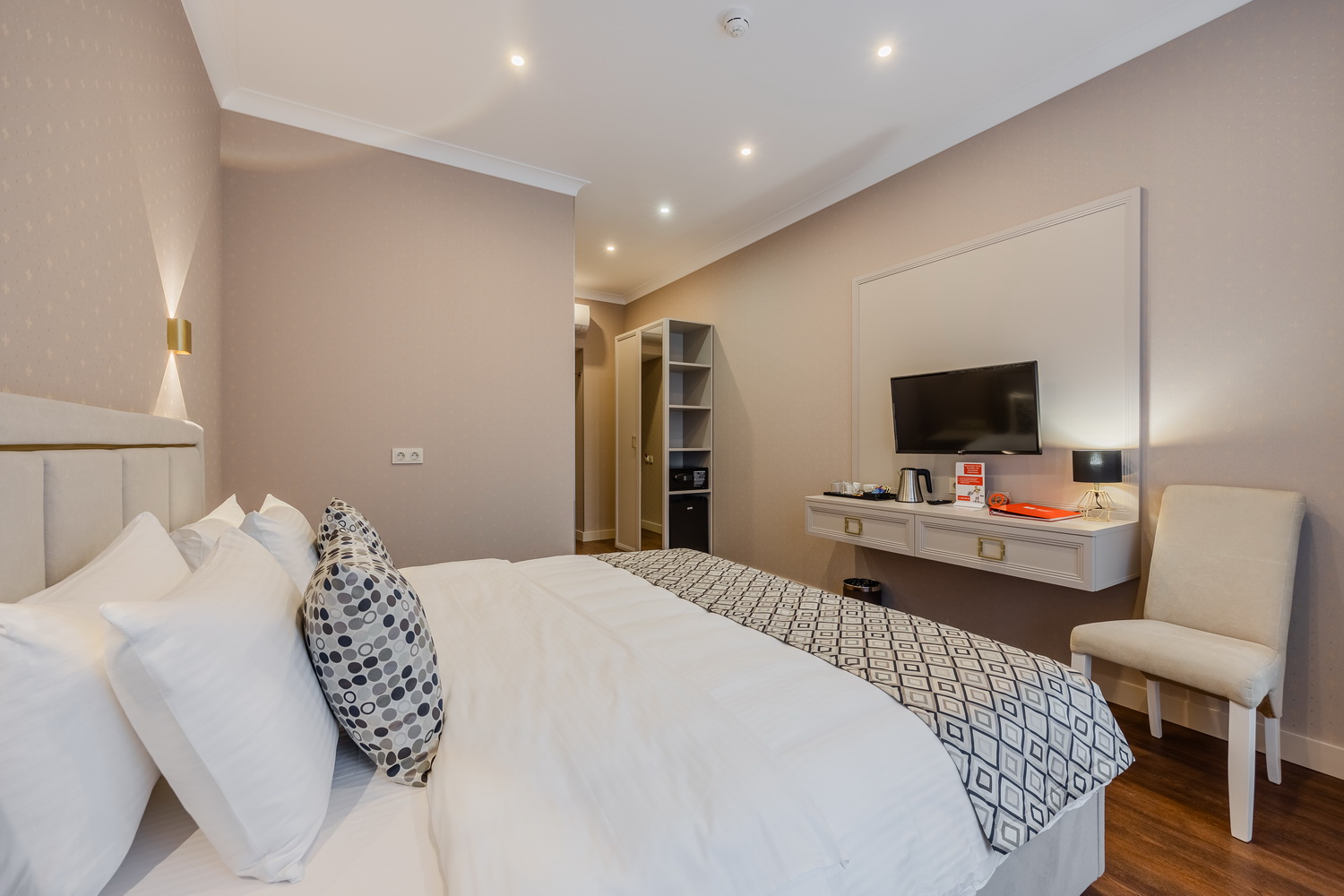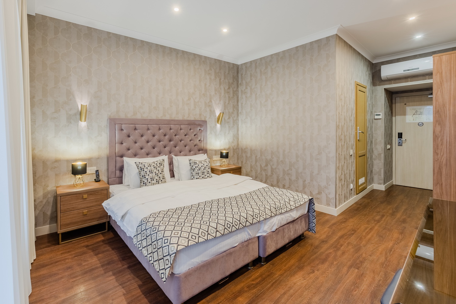 В номере: вешалка, диван раскладной, зеркало, кровать двуспальная, прикроватные тумбочки, стол, столик журнальный, стулья, тумба багажная, шкаф, кондиционер, сейф, телевизор, телефон, холодильник, чайная станция