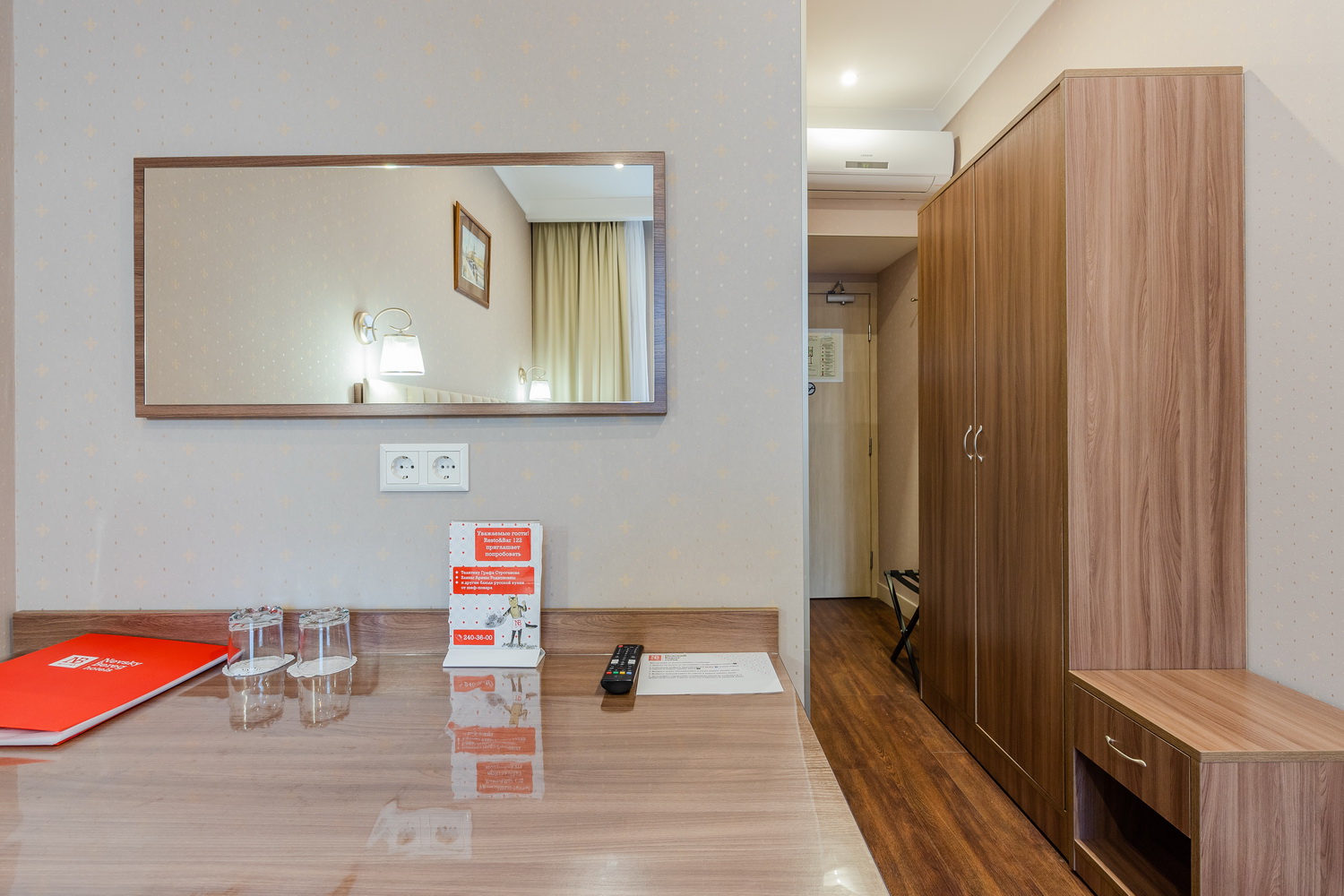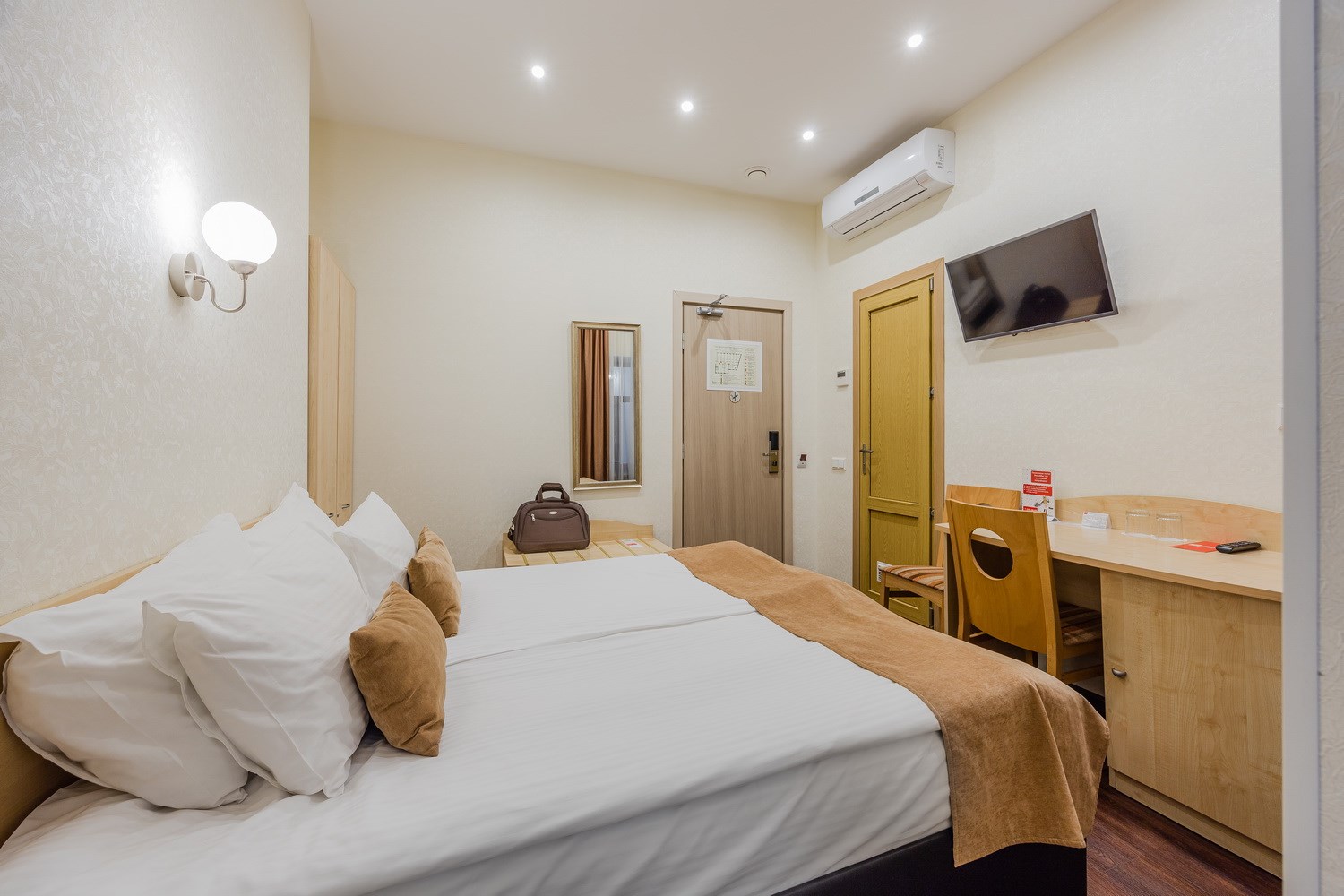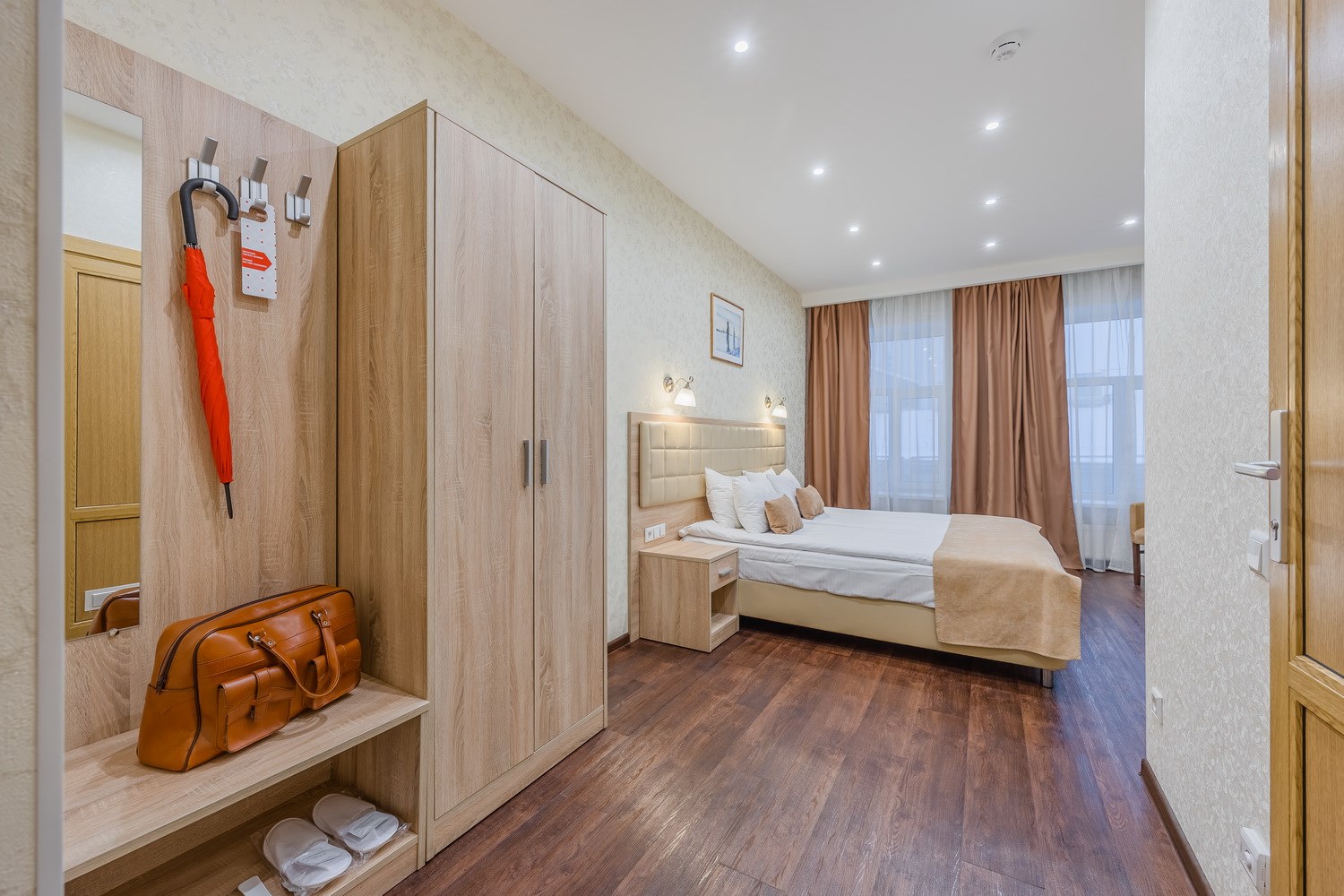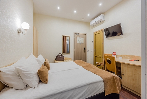 В номере: вешалка, зеркало, кровати односпальные /одна двуспальная кровать, раскладушка, стол, стул, тумба багажная, шкаф, кондиционер, сейф, телевизор, телефон, холодильник, чайная станция