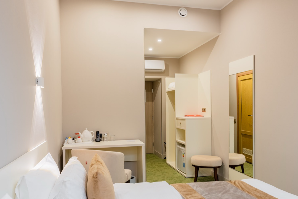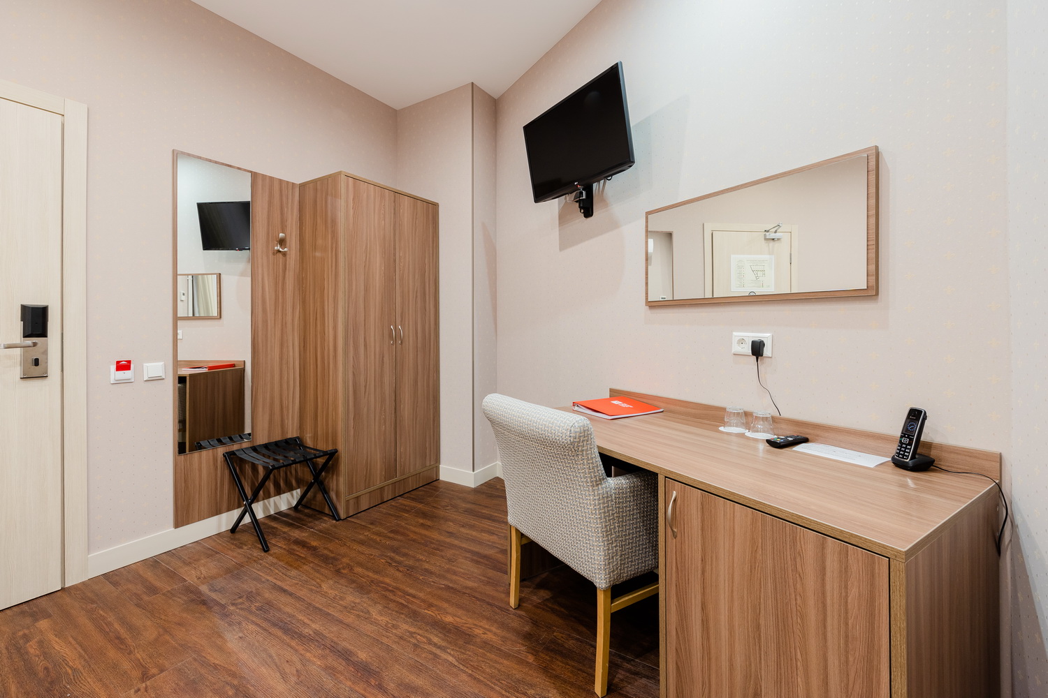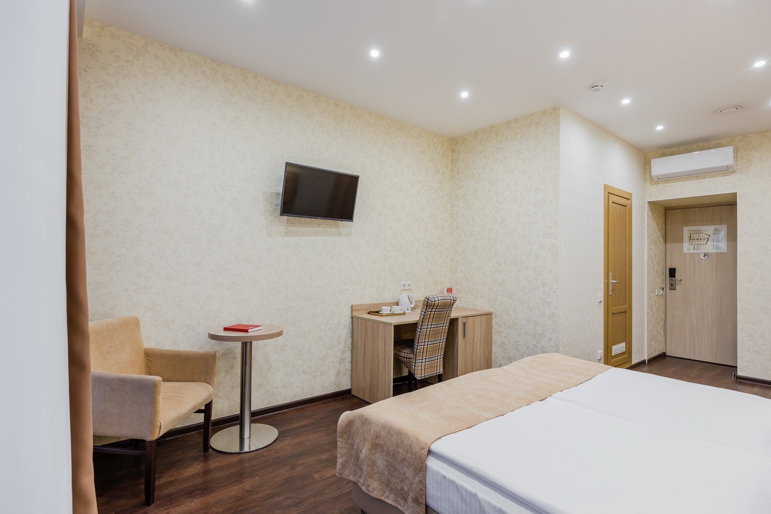 В номере: вешалка, зеркало, кровати односпальные /одна двуспальная кровать, прикроватные тумбочки, стол, стул, сейф, телевизор, телефон, холодильник, чайная станция