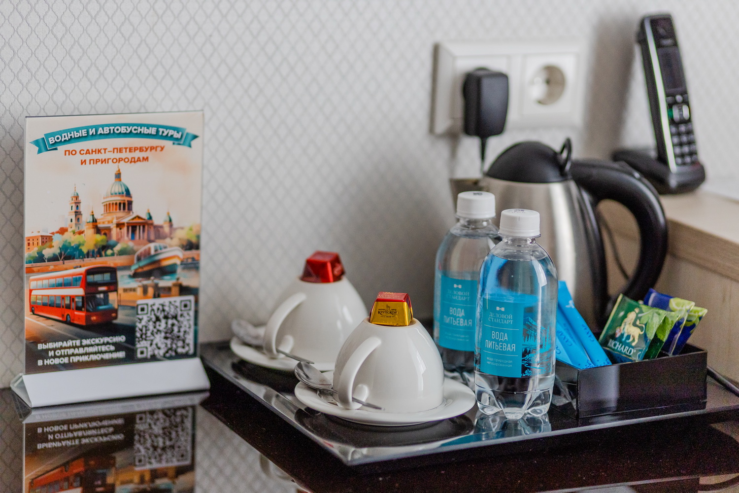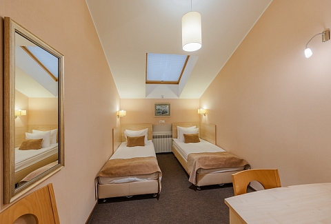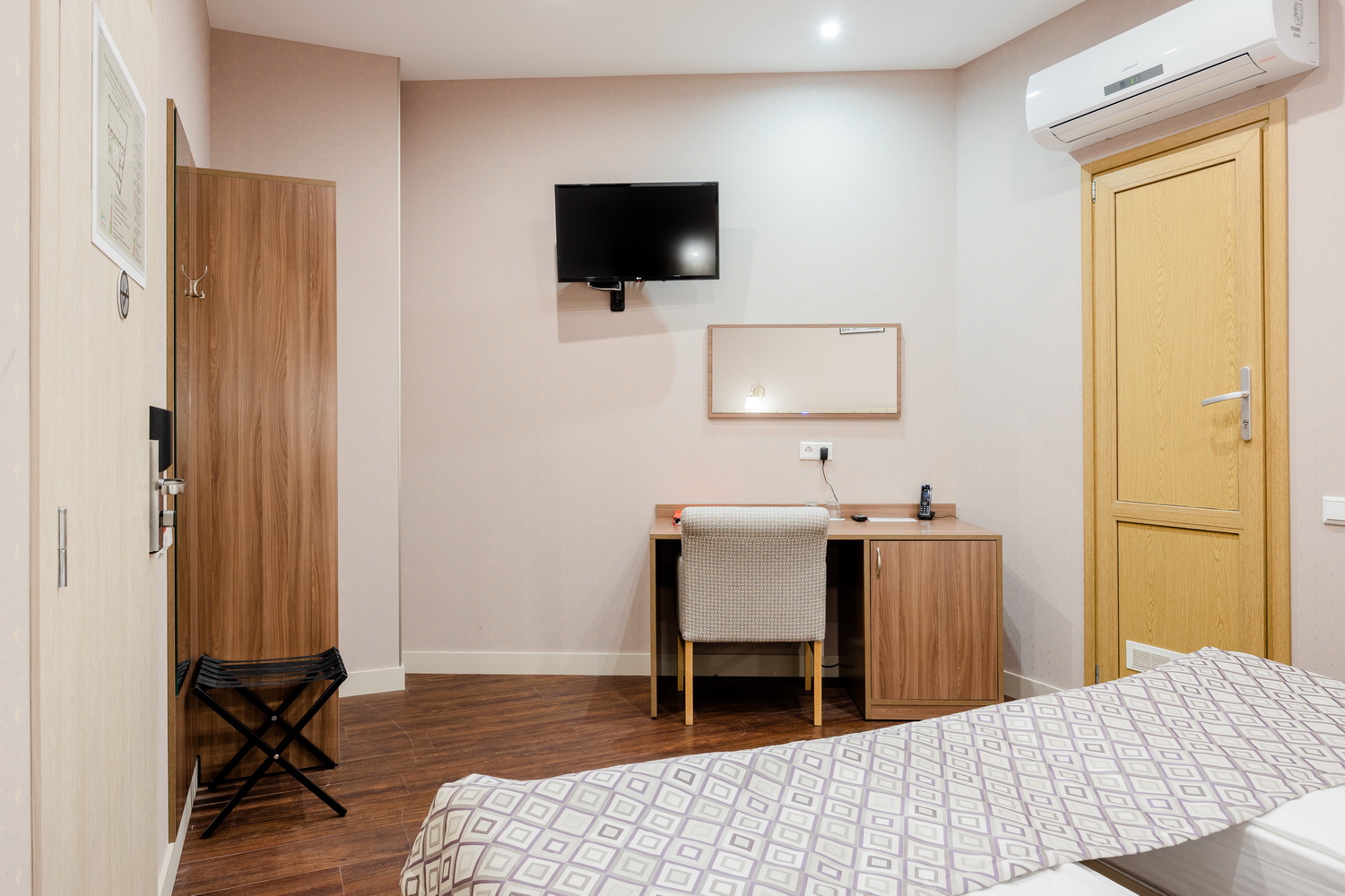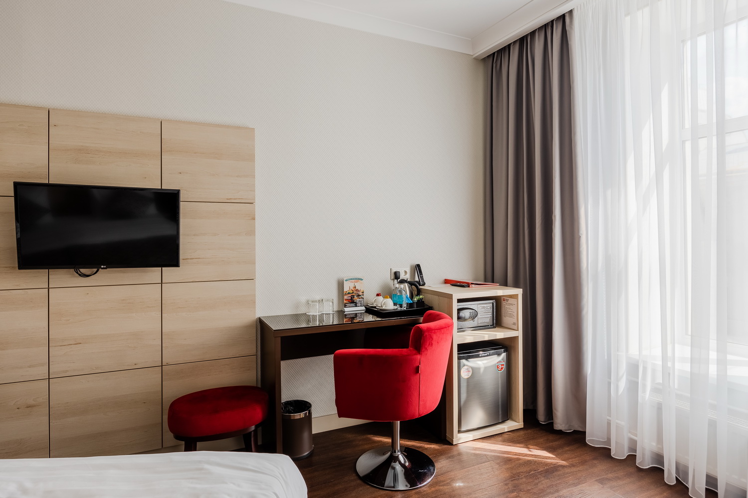 В номере: вешалка, зеркало, кровати односпальные /одна двуспальная кровать, прикроватные тумбочки, стол, стул, сейф, телевизор, телефон, холодильник, чайная станция