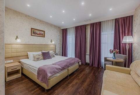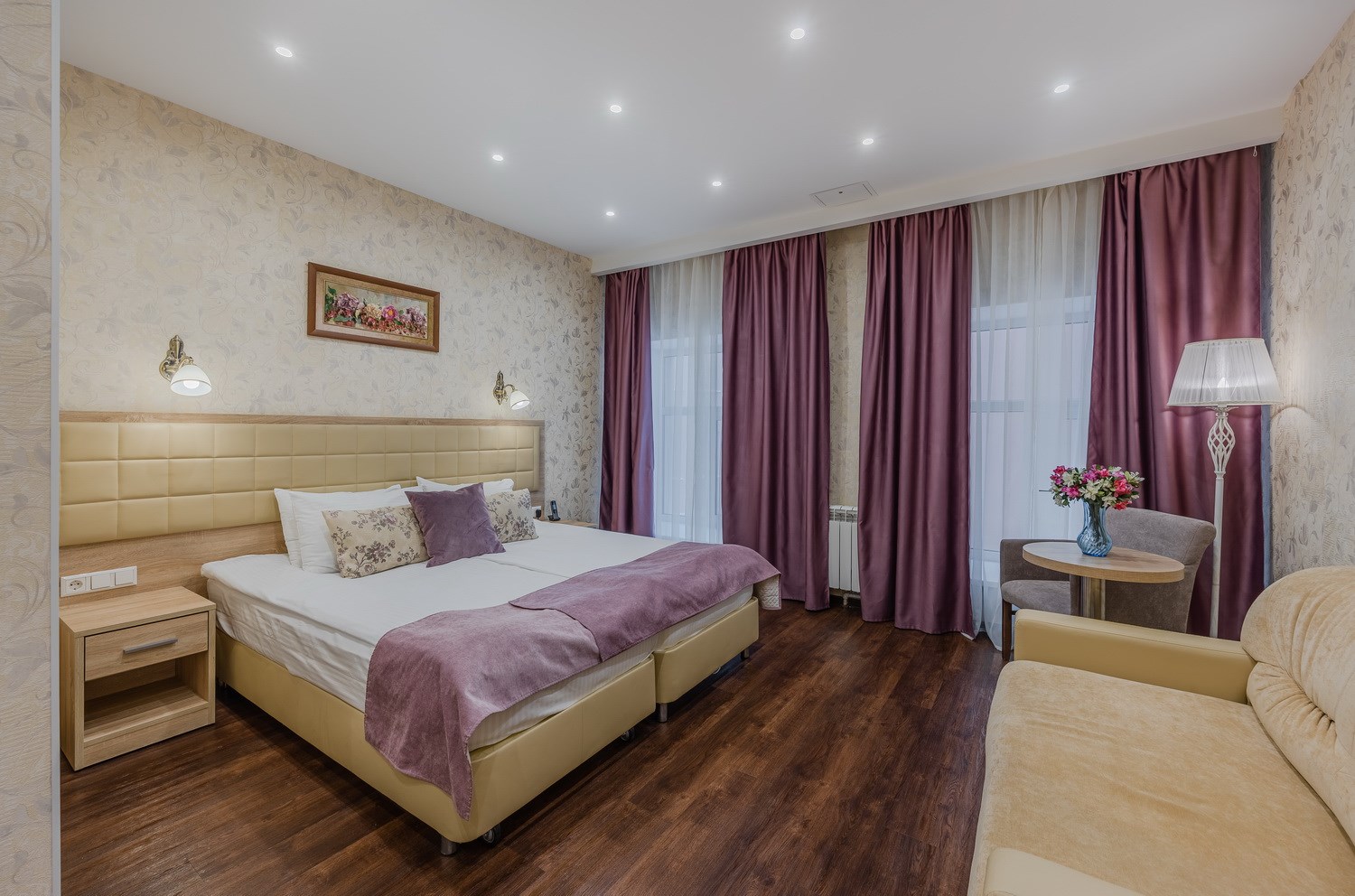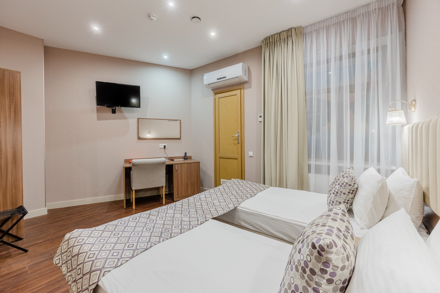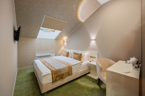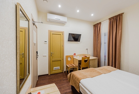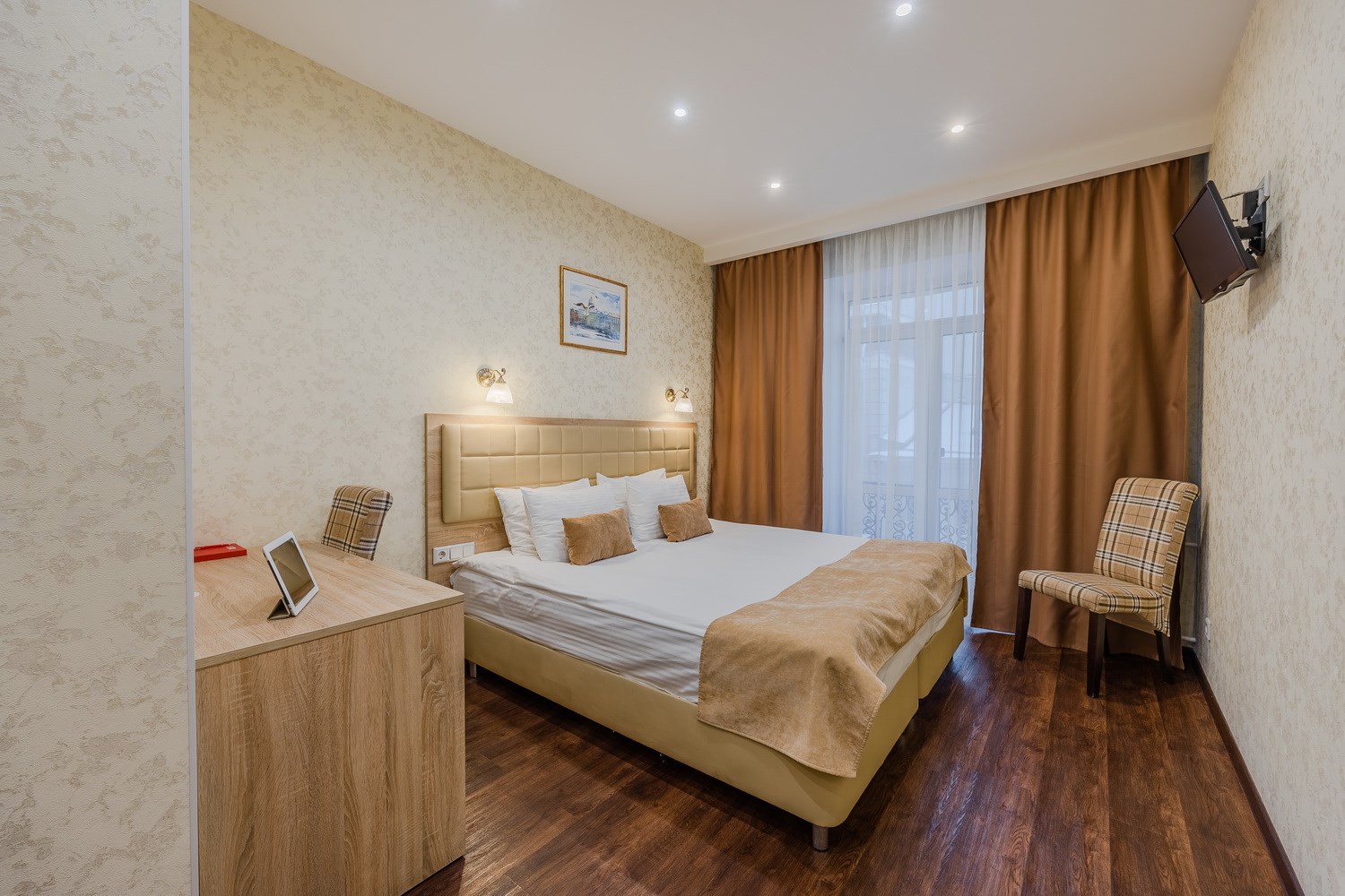 Все комнаты оснащены собственными удобствами, в номерах стандарт к услугам гостей душевые кабинки, а в люксовых – ванная. Также в каждом номере есть кондиционер, телефон, телевизор, холодильник, фен и достаточное количество современной мебели. В гостевом доме функционирует один 2-комнатный люксовый номер. На последнем этаже гостиницы есть мансардные номера с замечательным обзором и планировкой.Каждое утро в отеле сервируется завтрак в виде шведского стола. Для детей до 6-летнего возраста питание осуществляется бесплатно. Для гостей на каждом этаже установлены кулеры с очищенной водой, отведены помещения для курящих. В номерах отеля доступен беспроводной интернет Wi-Fi. Для удобства отдыхающих предусмотрена услуга проката утюга.Для проведения деловых переговоров и небольших семинаров предусмотрен конференц-зал вместимостью до 25 человек. Торжественные мероприятия с комфортом организуются в ресторане отеля.