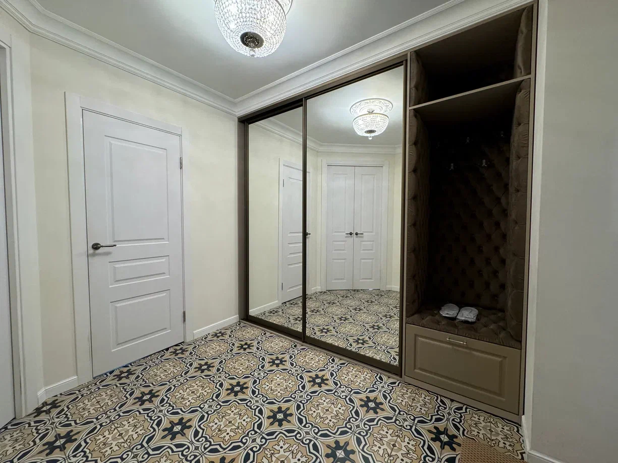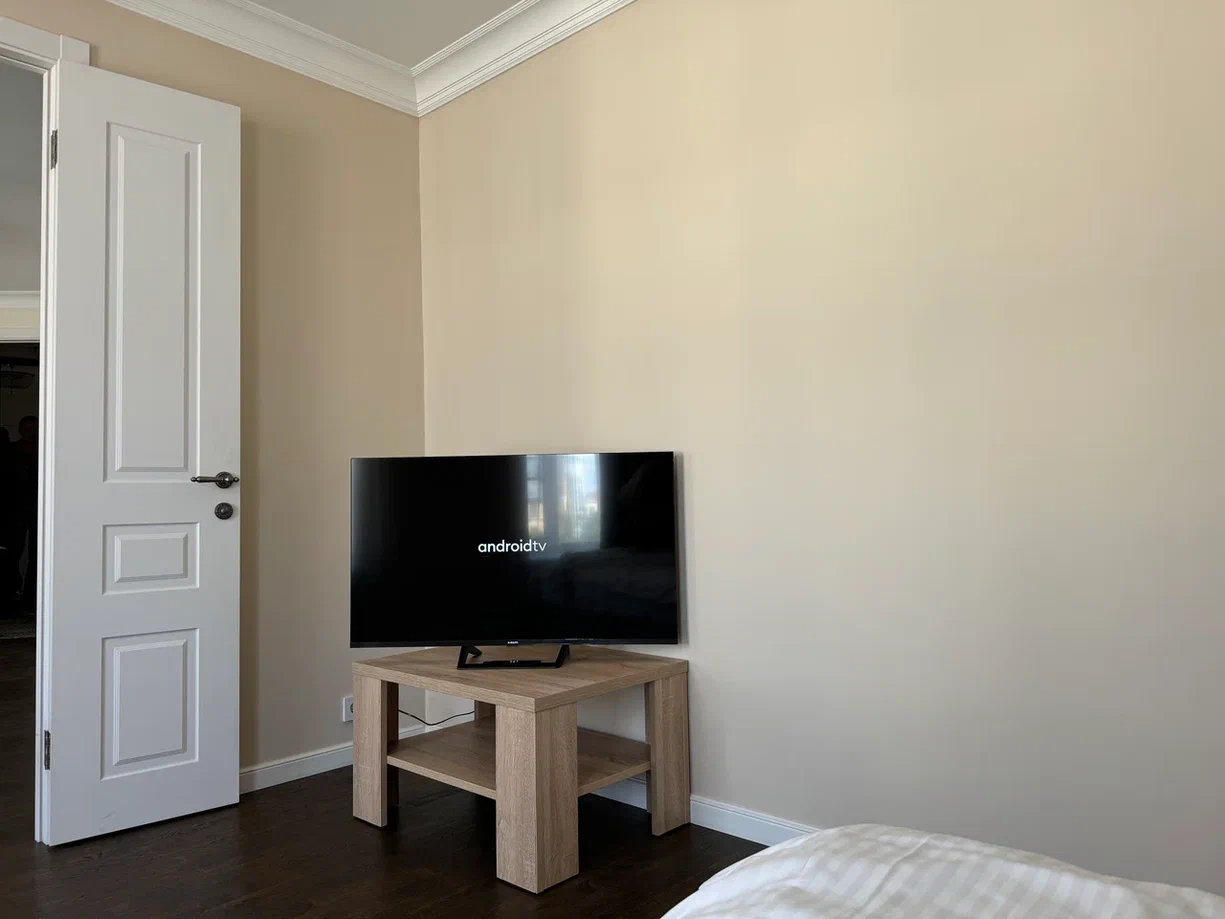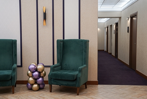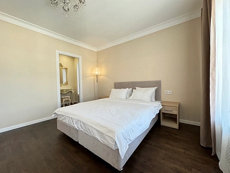 В номере: вешалка, зеркало, кресла, кровать двуспальная, прикроватные тумбочки, раскладушка, стол, стулья, шкаф, духовой шкаф, микроволновая печь, набор посуды, плита электрическая, посудомоечная машина, сейф, телевизор, телефон, холодильник, электрочайник