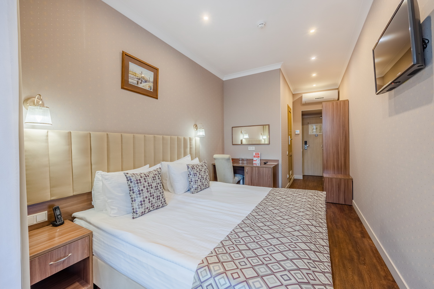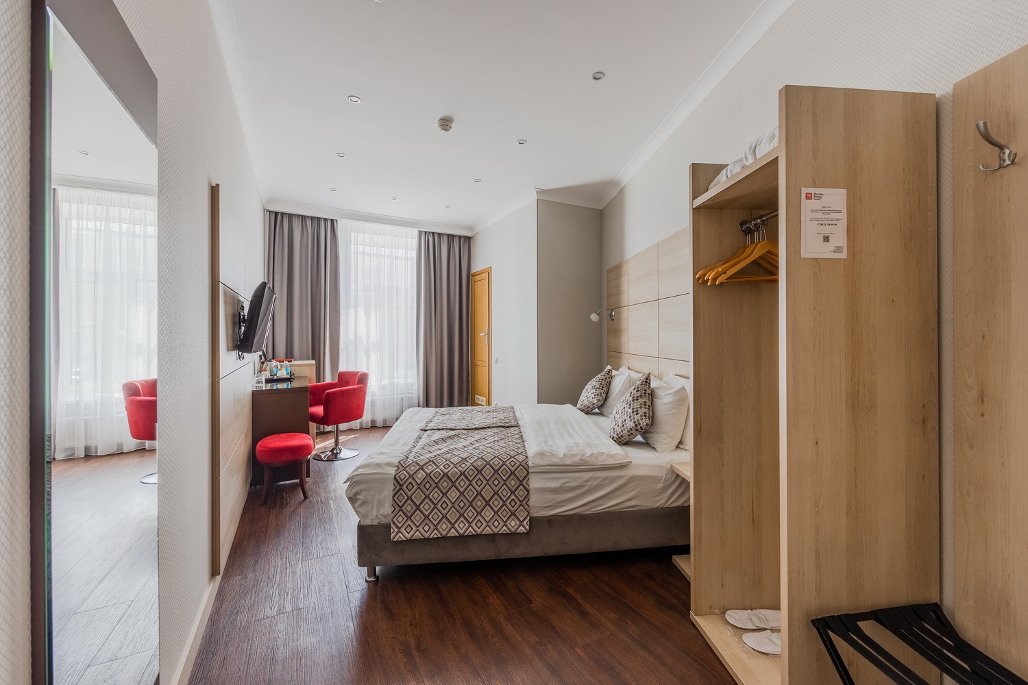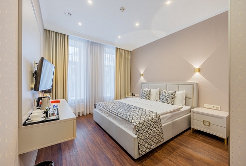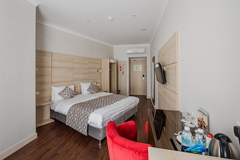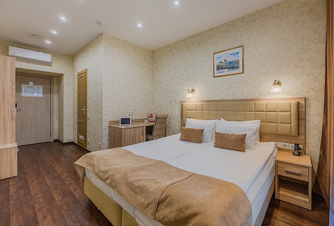 В номере: вешалка, еврораскладушка, зеркало, кровати односпальные /одна двуспальная кровать, прикроватные тумбочки, стол, стулья, тумба багажная, шкаф, кондиционер, сейф, телевизор, телефон, холодильник, чайная станция