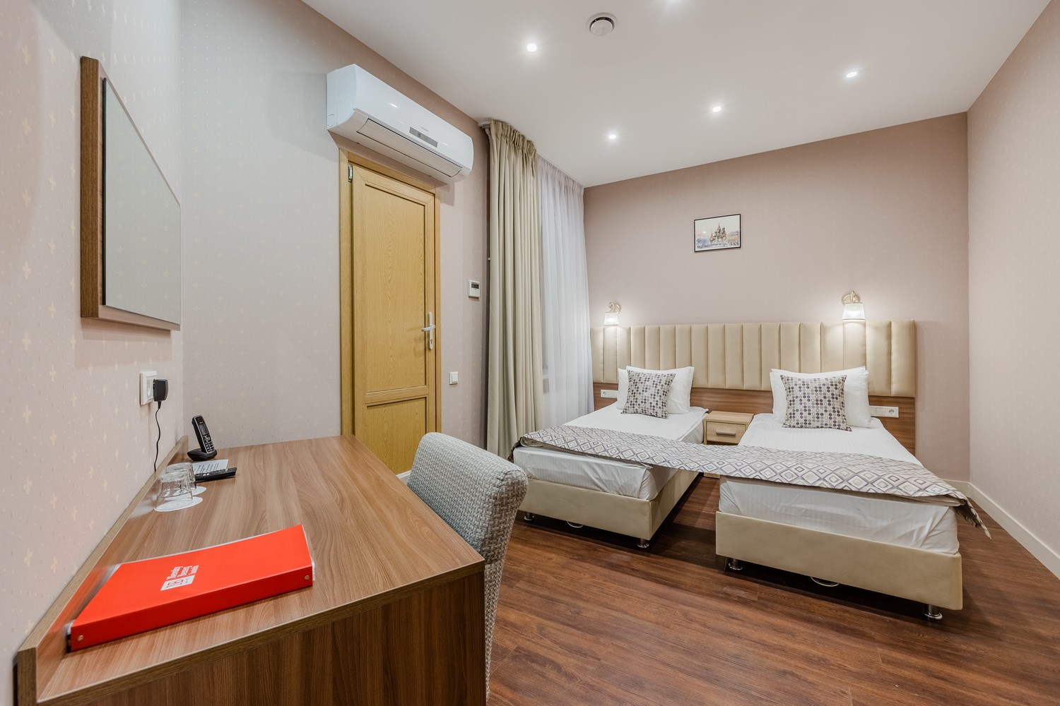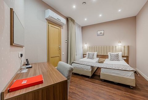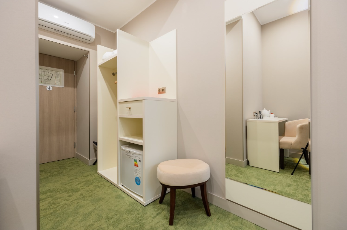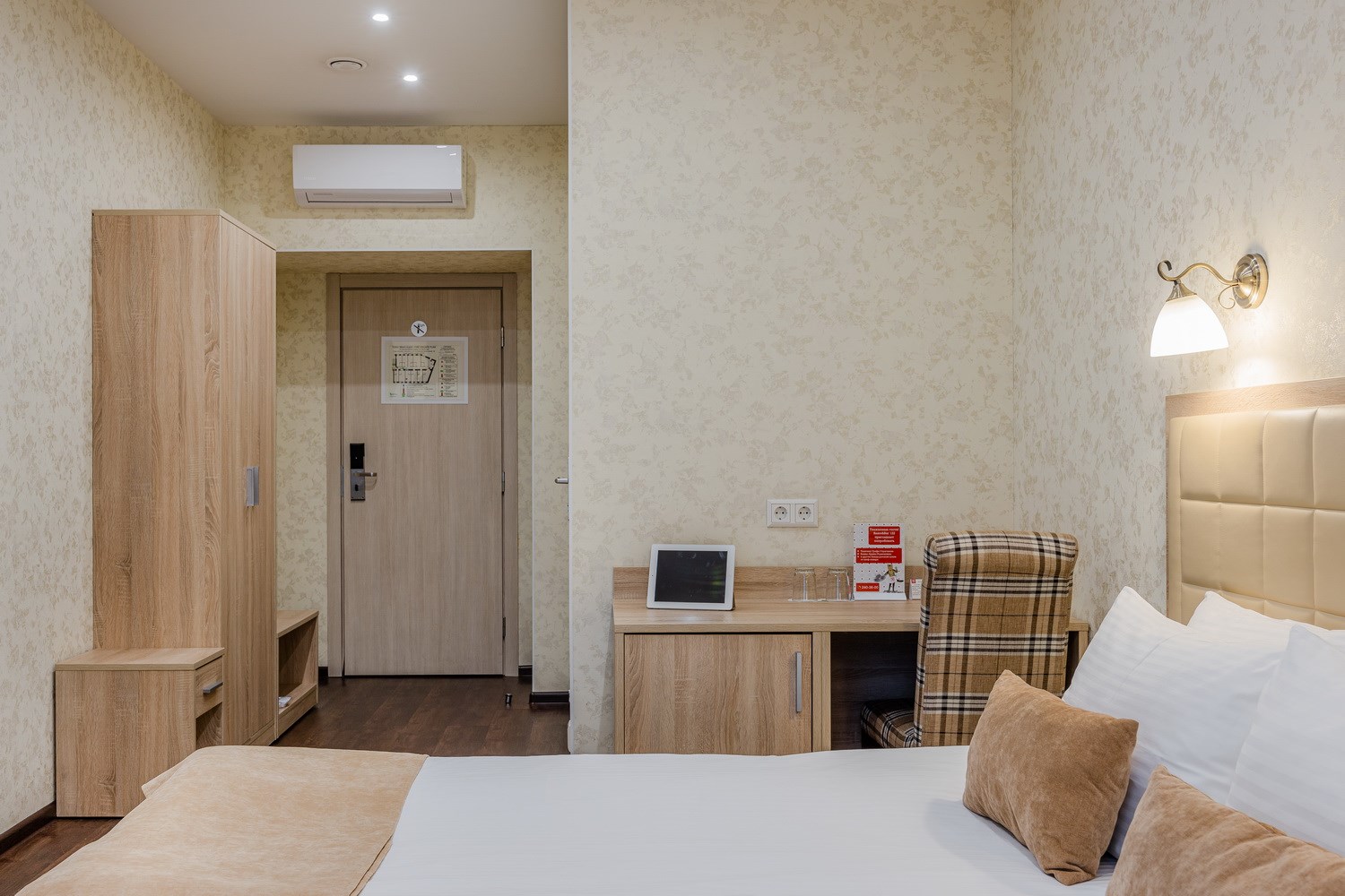 В номере: вешалка, зеркало, кровати односпальные /одна двуспальная кровать, прикроватные тумбочки, стол, стул, тумба, шкаф, кондиционер, сейф, телевизор, телефон, холодильник