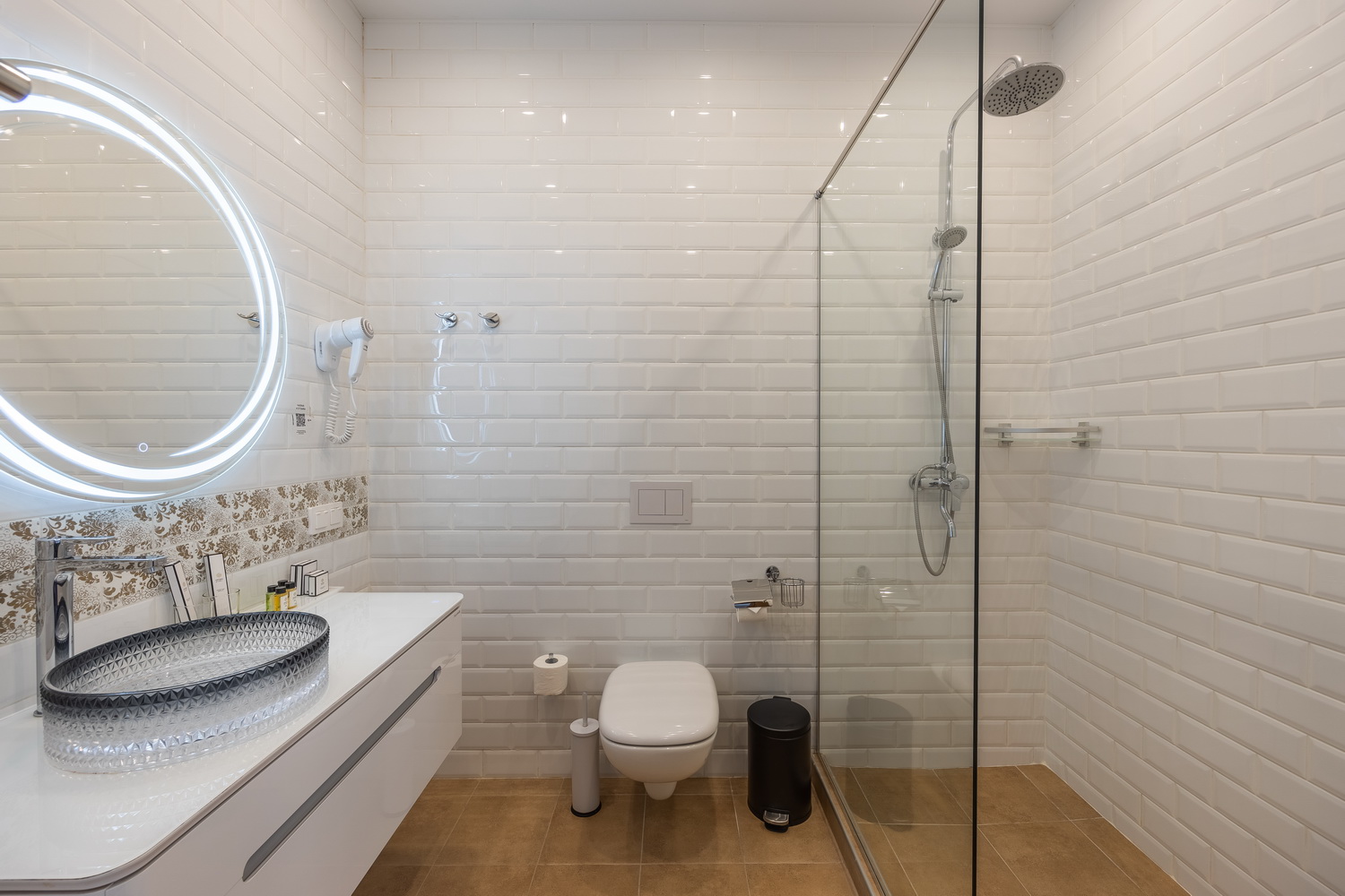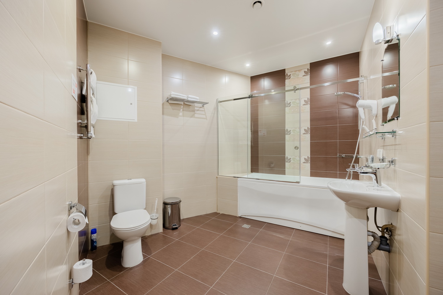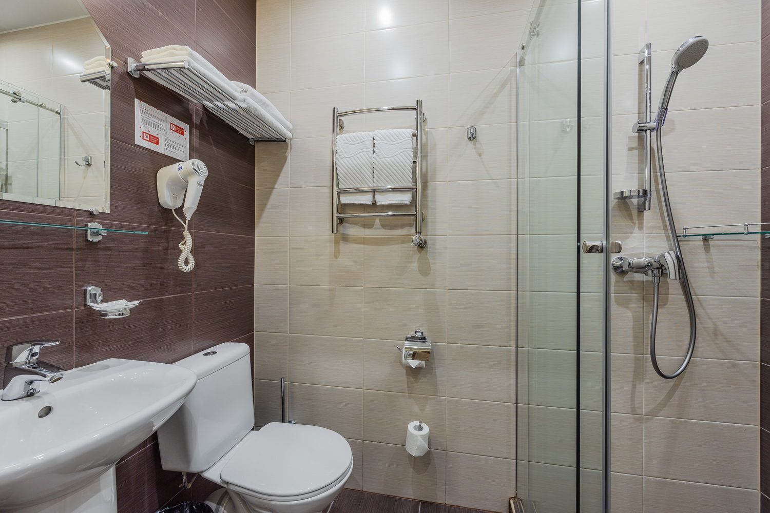 Санузел: с душем, тапочки, туалетные принадлежности, фен, халат