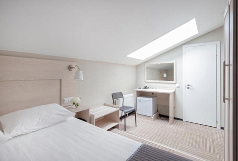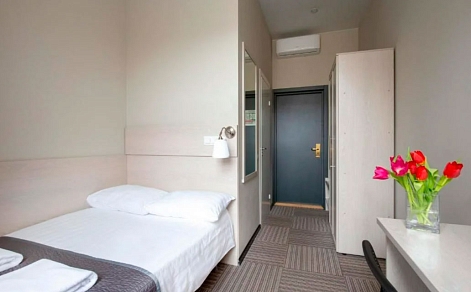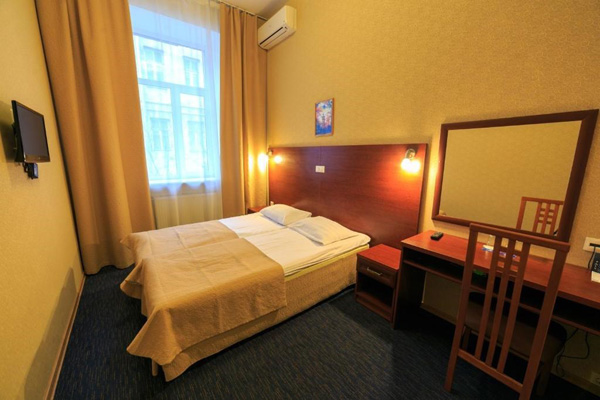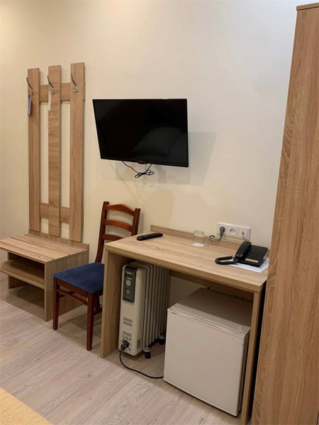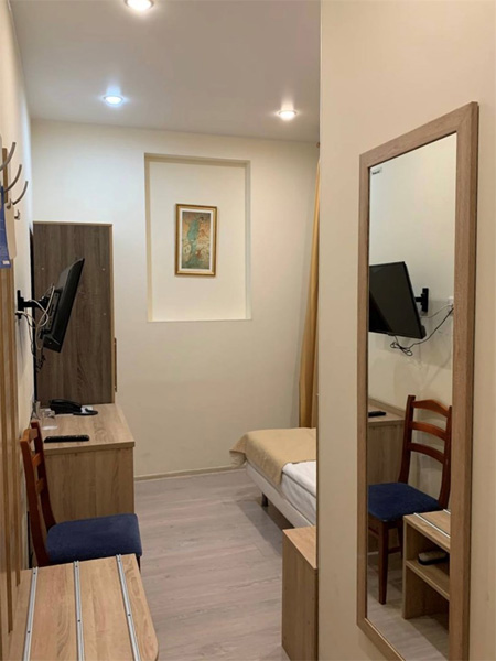 В номере: зеркало, кровать односпальная, прикроватная тумбочка, стол, стул, шкаф, мини-холодильник, сейф, телевизор, телефон