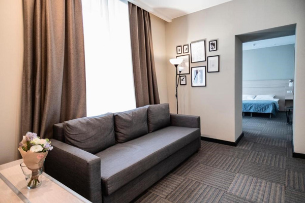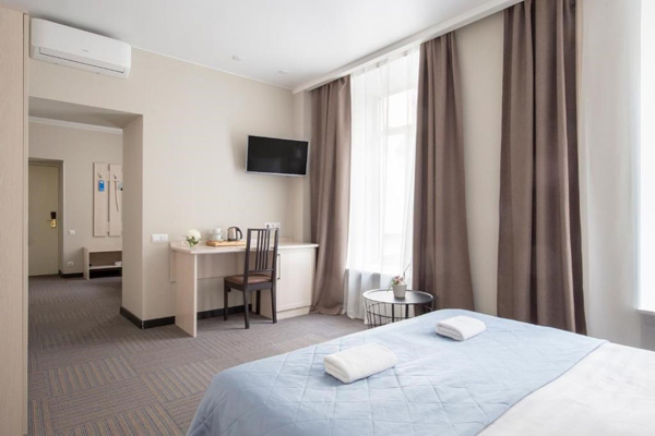В номере: диван, зеркало, кровать двуспальная, обувная полка, прикроватные тумбочки, стол, столик кофейный, стул, шкаф, кондиционер, мини-холодильник, сейф, телевизор, телефон, чайная станция, чайный набор посуды, электрочайник