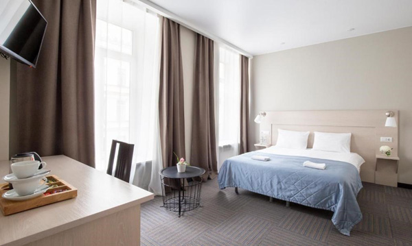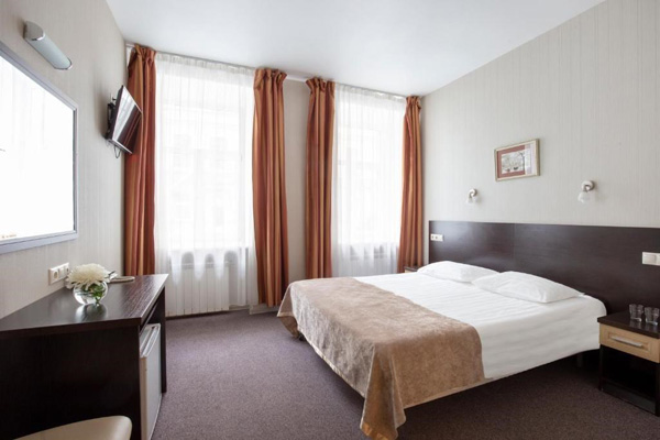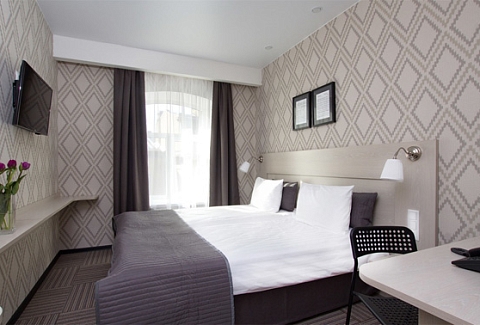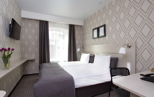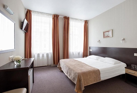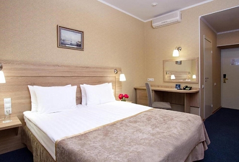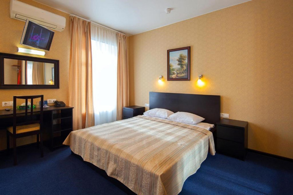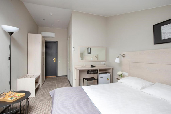В номере: зеркало, кровать двуспальная, прикроватные тумбочки, стол, стул, шкаф, кондиционер, мини-холодильник, сейф, телевизор, телефон