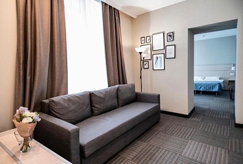 В номере: диван, зеркало, кровати односпальные /одна двуспальная кровать, прикроватные тумбочки, стол, стулья, шкаф, кондиционер, мини-холодильник, сейф, телевизор, телефон, чайный набор посуды, электрочайник