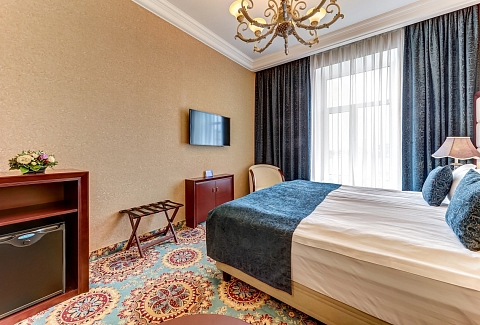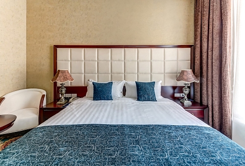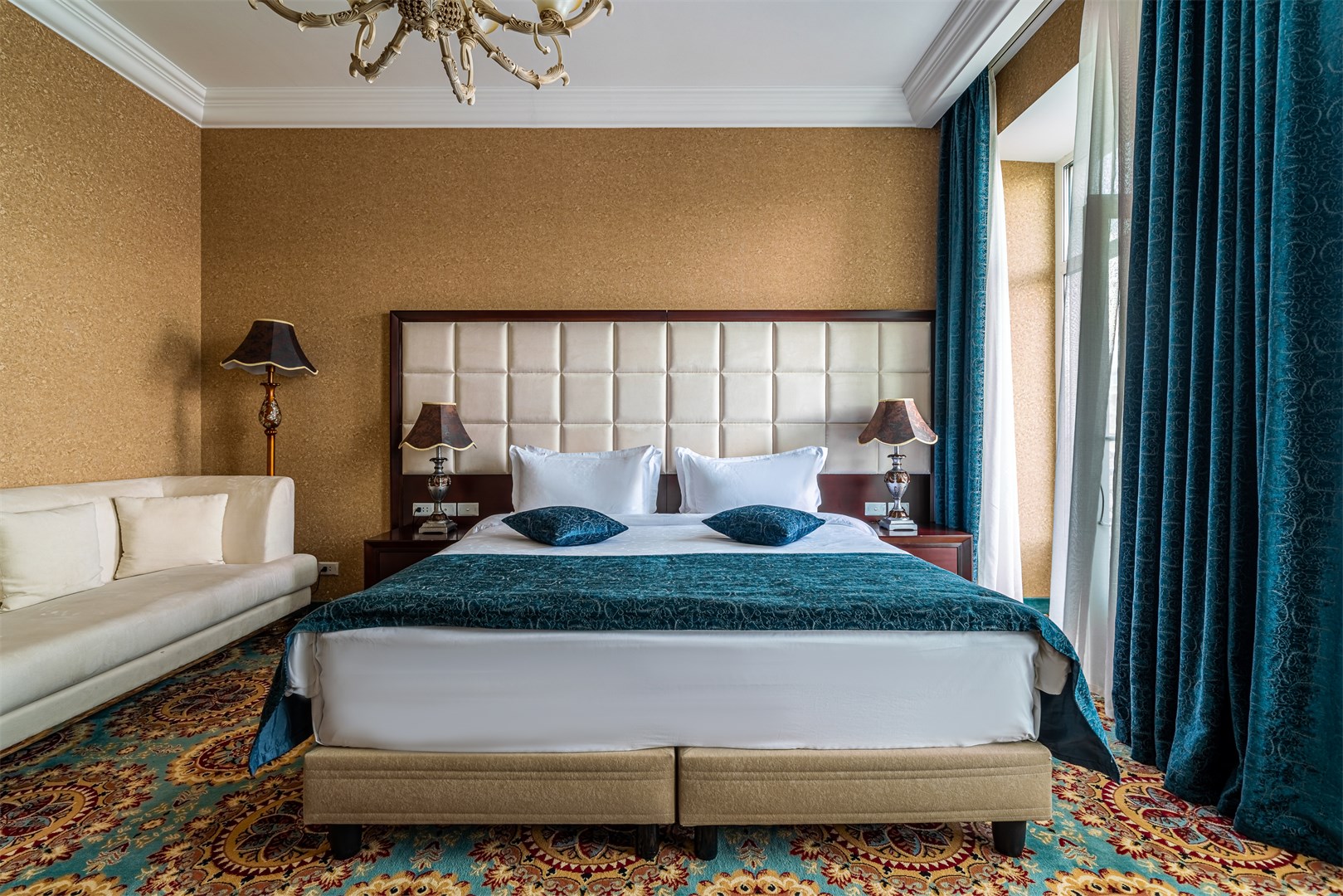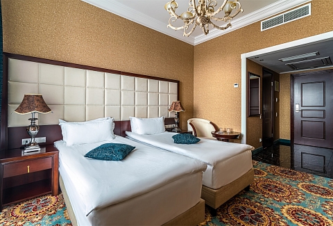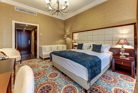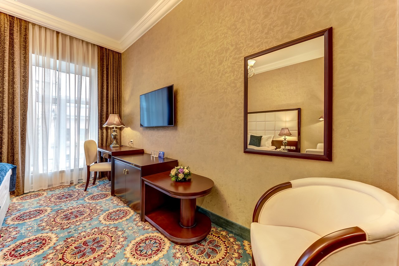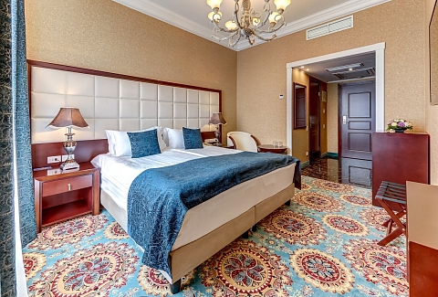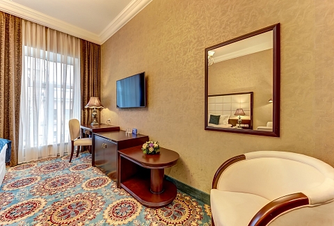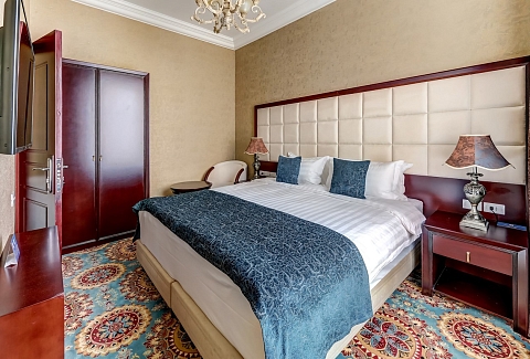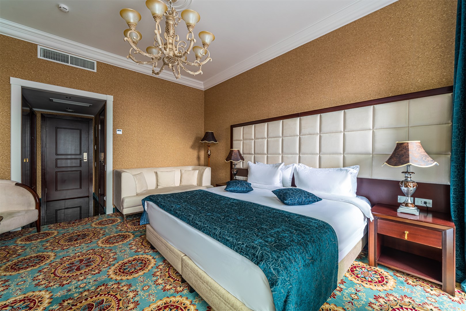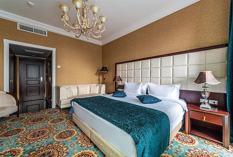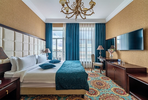 В номере: вешалка, диван, зеркало, кровать двуспальная, прикроватные тумбочки, стол, стулья, шкаф, кондиционер, мини-холодильник, сейф, телевизор, чайная станция