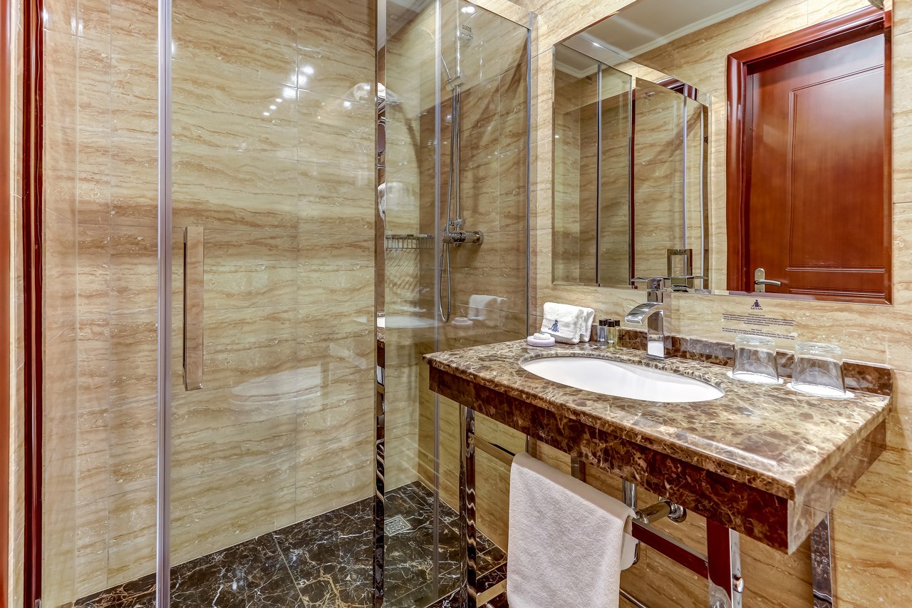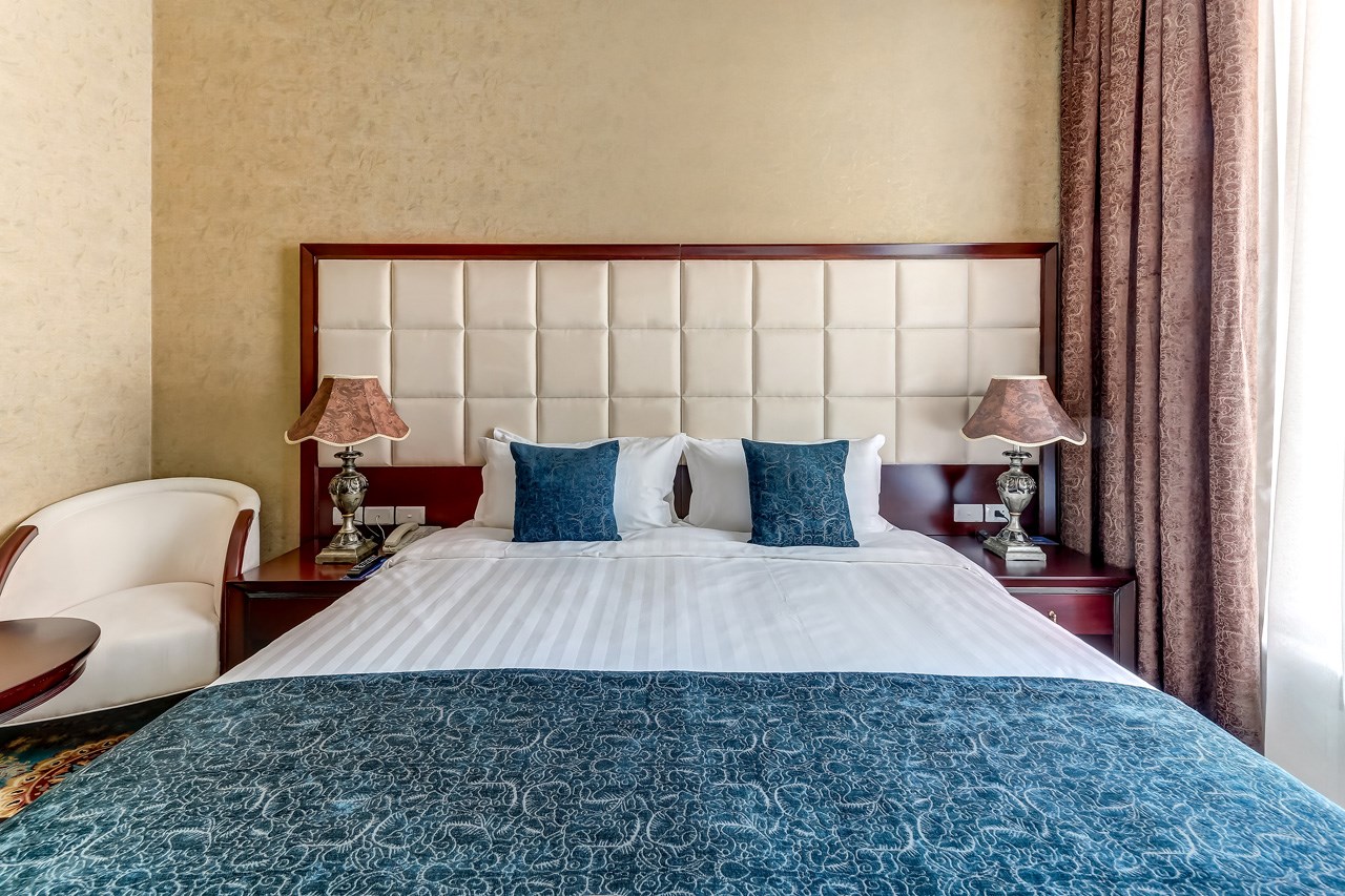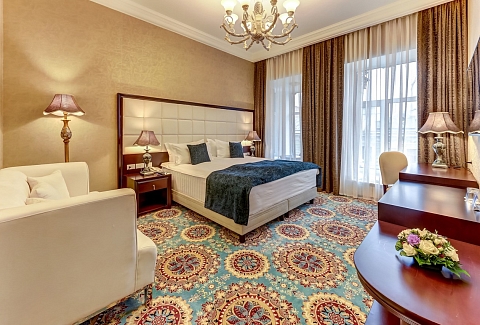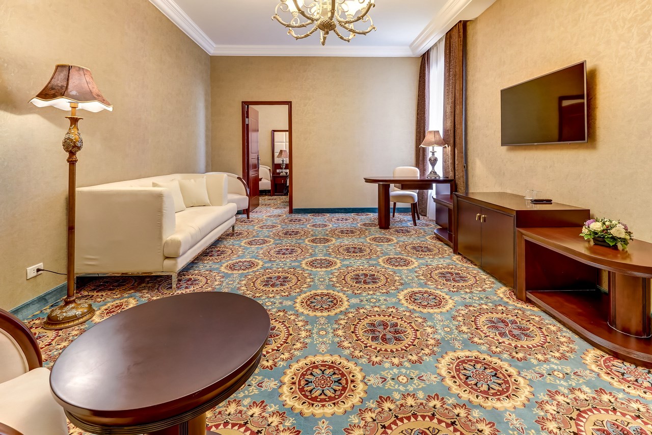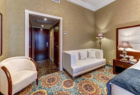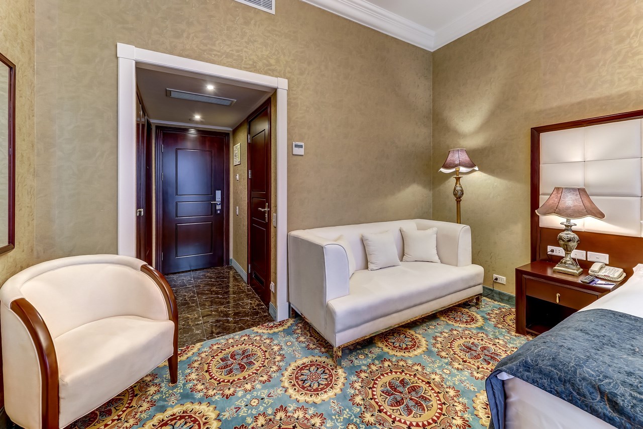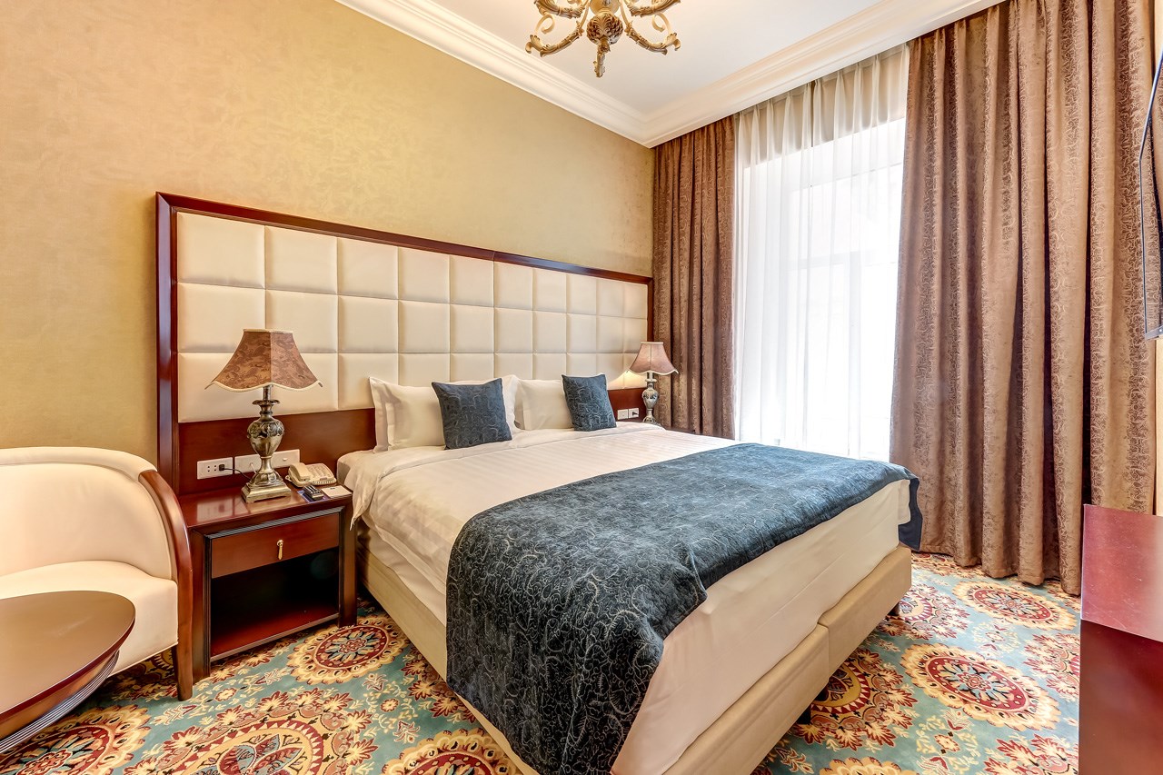 В номере: вешалка, диван, зеркало, кровать двуспальная, прикроватные тумбочки, стол, стулья, шкаф, кондиционер, мини-холодильник, сейф, телевизор, чайная станция
