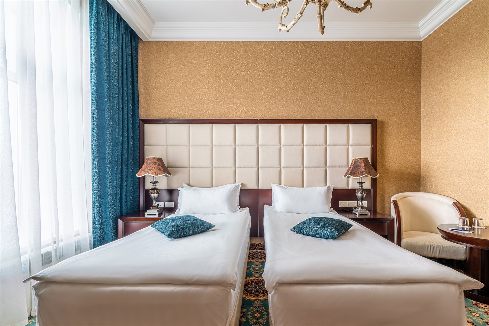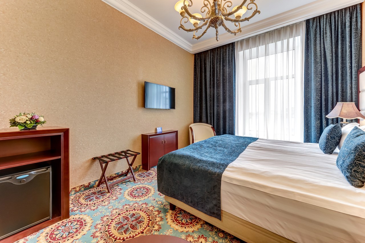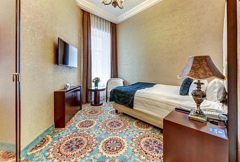 В номере: вешалка, зеркало, кровать односпальная, прикроватная тумбочка, стол, стул, шкаф, кондиционер, мини-холодильник, сейф, телевизор