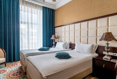 В номере: вешалка, диван, зеркало, кровати односпальные /одна двуспальная кровать, прикроватные тумбочки, стол, стулья, шкаф, кондиционер, мини-холодильник, сейф, телевизор, чайная станция