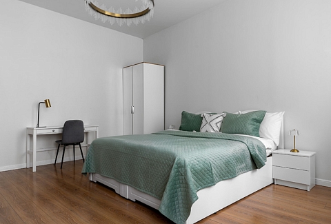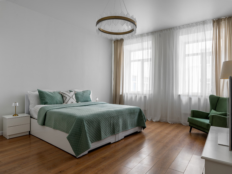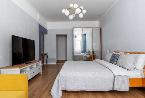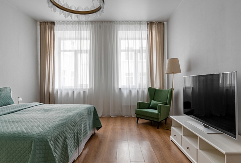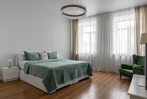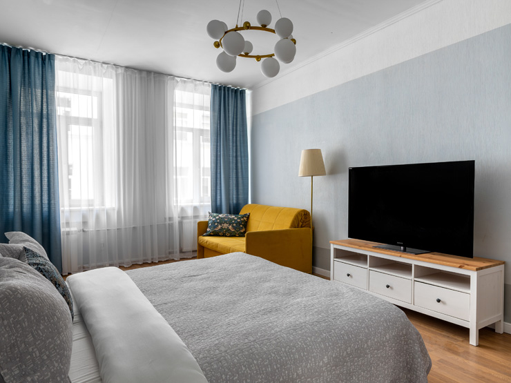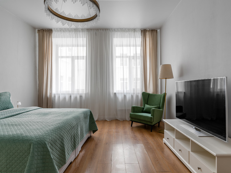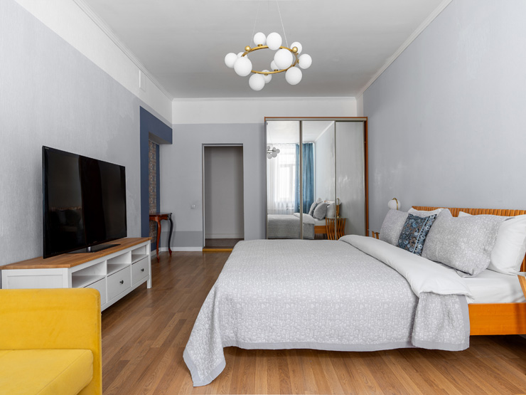В номере: вешалка, диван раскладной, зеркало, кресло, кровать двуспальная, прикроватные тумбочки, стол, стулья, шкаф, гладильная доска, микроволновая печь, набор посуды, плита электрическая, посудомоечная машина, стиральная машина, сушилка для белья, телевизор, утюг, холодильник, электрочайник