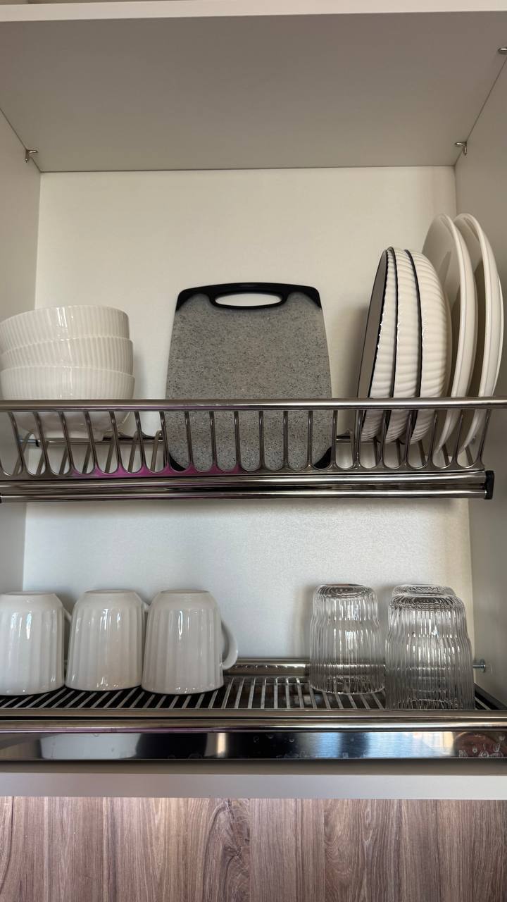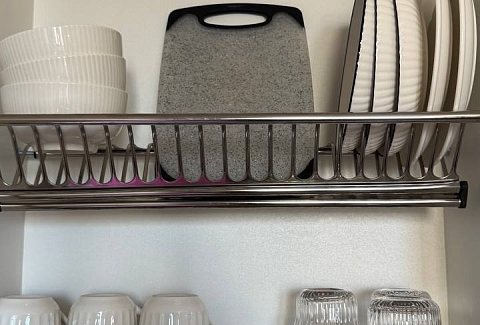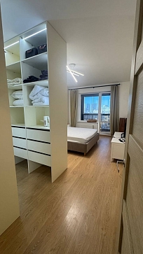 В номере: вешалка, зеркало, кровать двуспальная, прикроватные тумбочки, стол, стулья, шкаф встроенный, набор посуды, плита, стиральная машина, телевизор, холодильник