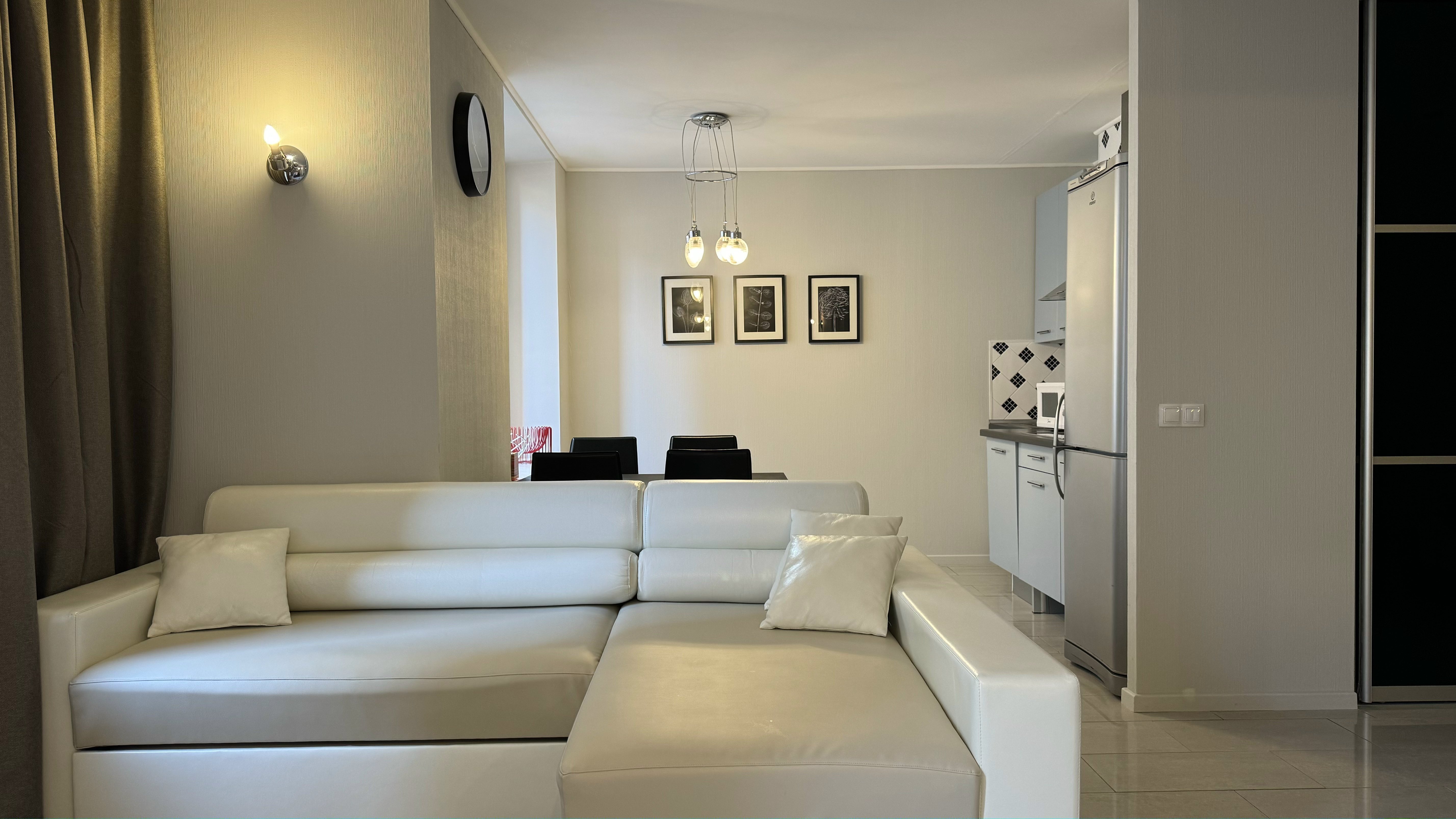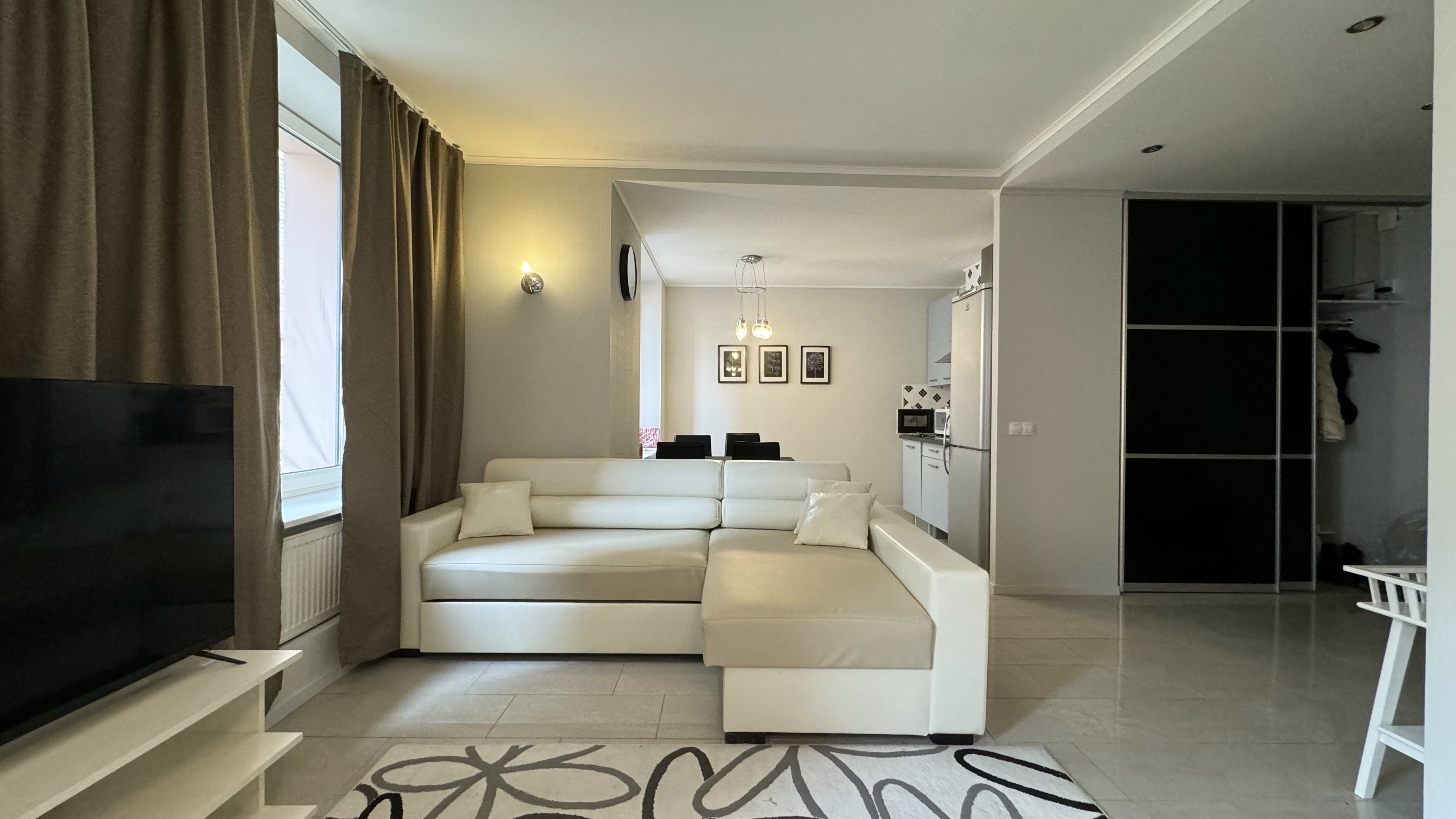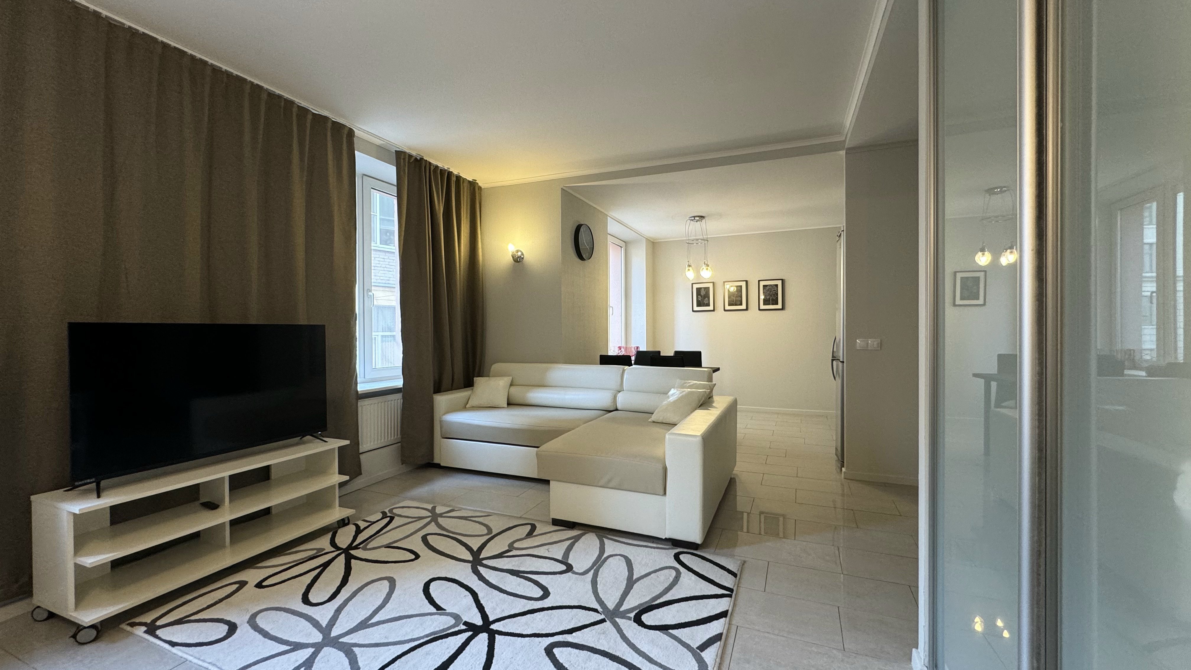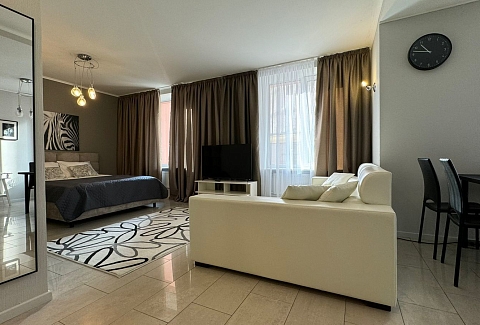 В окружении есть все необходимое для повседневных нужд: магазины, остановки общественного транспорта и благоустроенные городские пространства.Внутреннее пространство апартаментов организовано с вниманием к деталям и потребностям гостей. Предусмотрены комфортные места для отдыха: двуспальная кровать и раскладывающийся диван, также предназначенный для двоих. На кухне установлена электрическая плита, холодильник, микроволновая печь и посудомоечная машина, имеется полный набор посуды и кухонных принадлежностей. В собственной ванной комнате с душевой кабиной гостей ждут фен и средства гигиены. Для создания атмосферы домашнего уюта предусмотрены текстиль — постельное белье и полотенца, а также приятные дополнения: чай, кофе, утюг и стиральная машина. Свободный доступ к Wi-Fi и наличие телевизора позволяют оставаться на связи или наслаждаться отдыхом после насыщенного дня. Просторные шкафы и функциональная мебель дают возможность удобно разместить личные вещи.Эти апартаменты станут продуманным выбором для тех, кто ценит комфорт и расположение в самом сердце города, оставаясь при этом в тихой и уютной обстановке, где есть все необходимое для продолжительного пребывания.