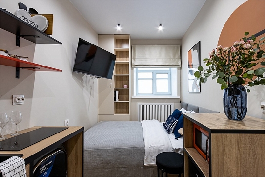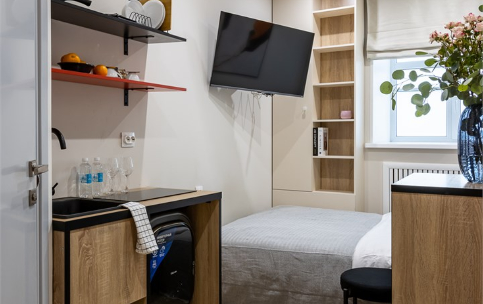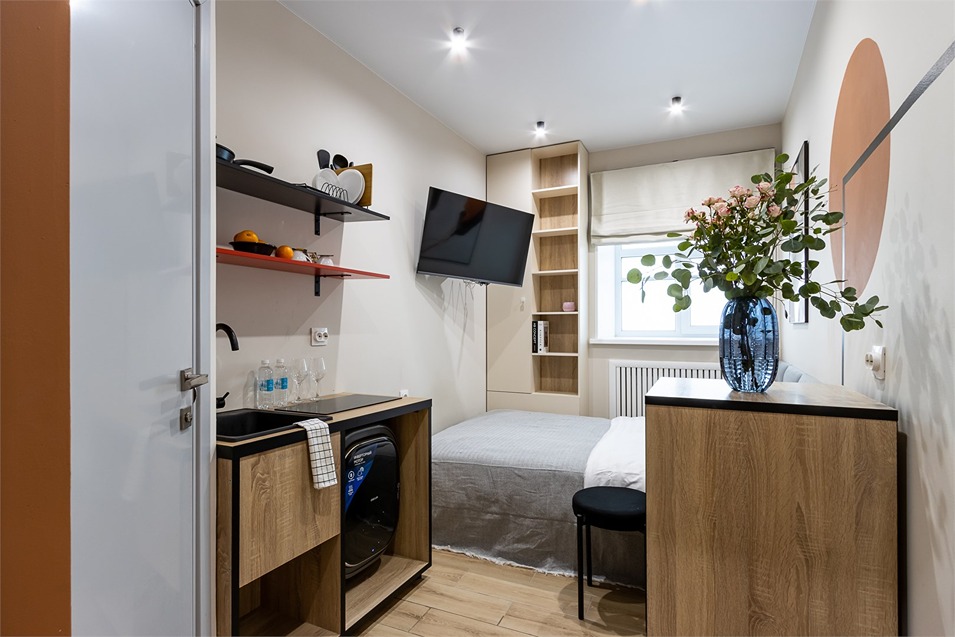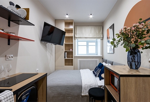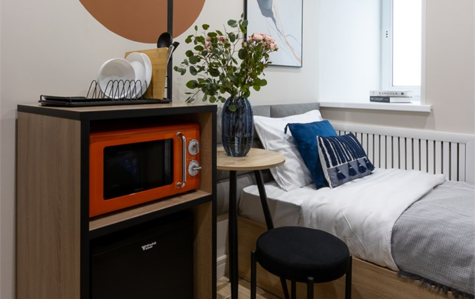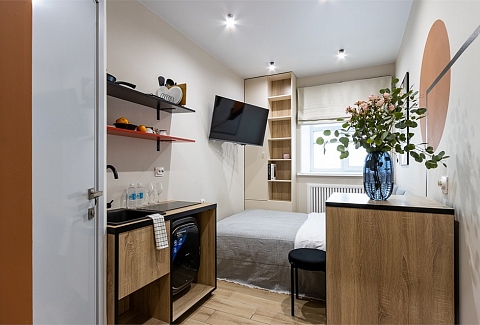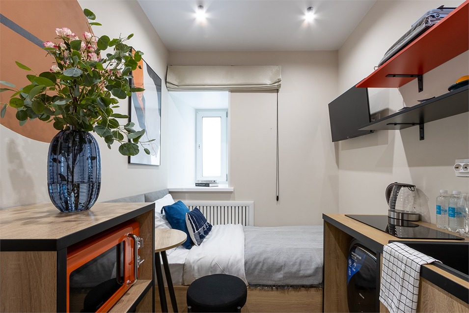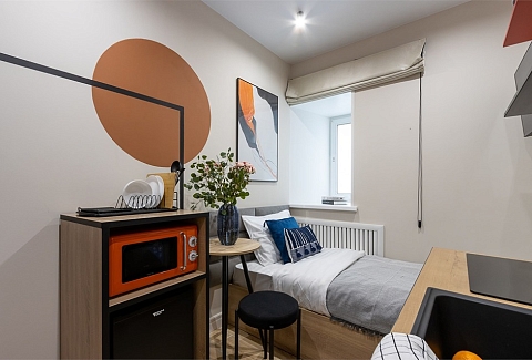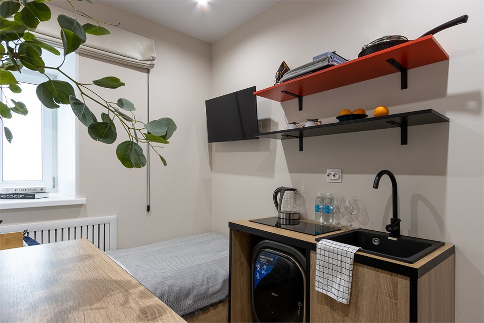 В номере: кровать односпальная, стол, стул, микроволновая печь, мини-холодильник, мультиварка, плита электрическая, стиральная машина, телевизор, утюг, электрочайник