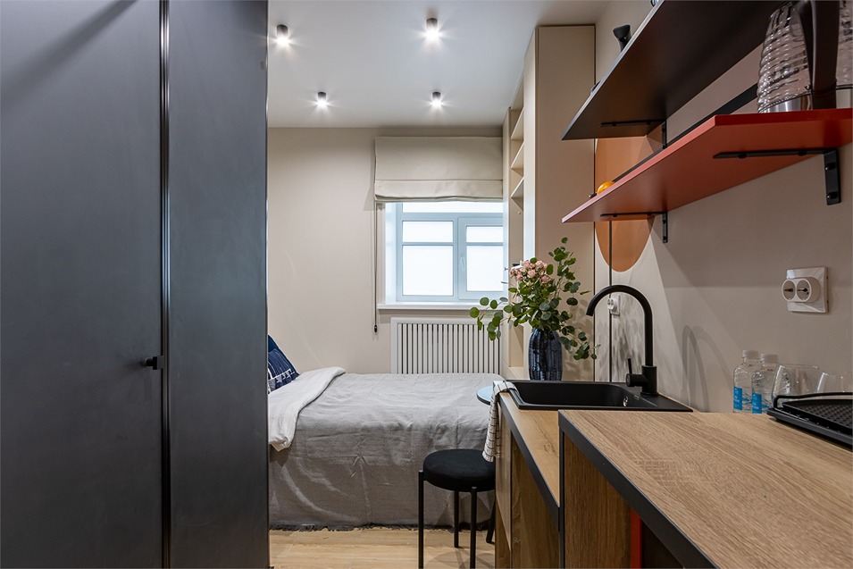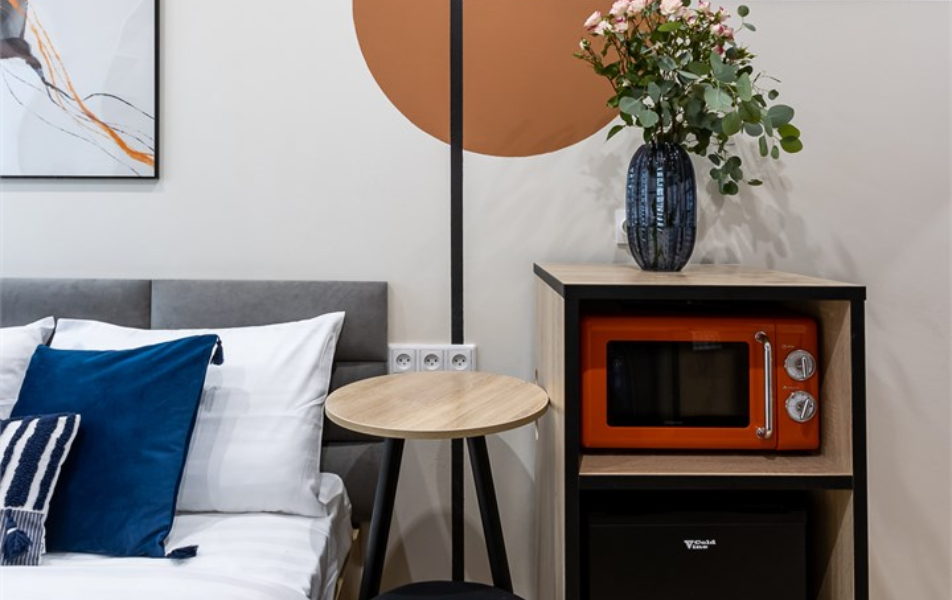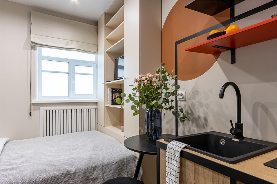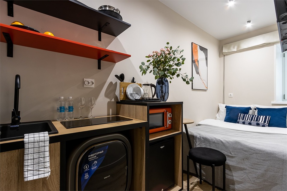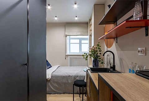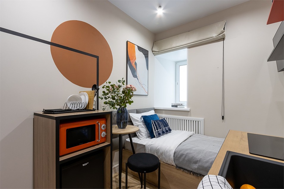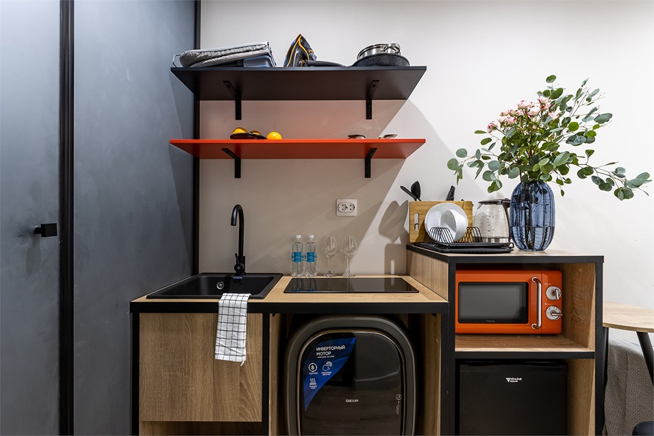 В номере: кровать односпальная, стол, стул, микроволновая печь, мини-холодильник, мультиварка, плита электрическая, стиральная машина, телевизор, утюг, электрочайник