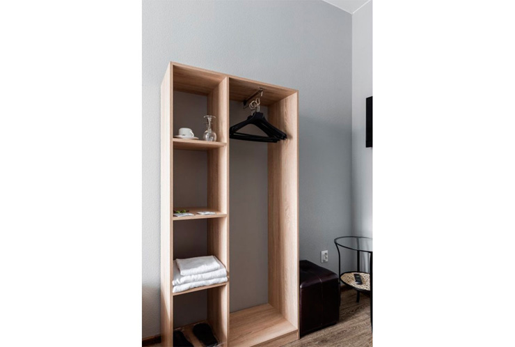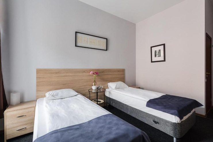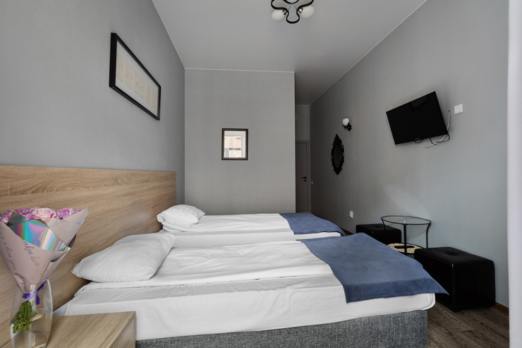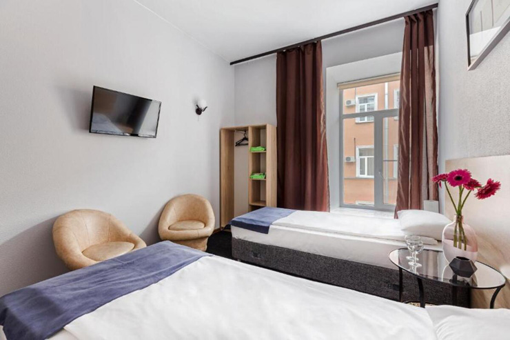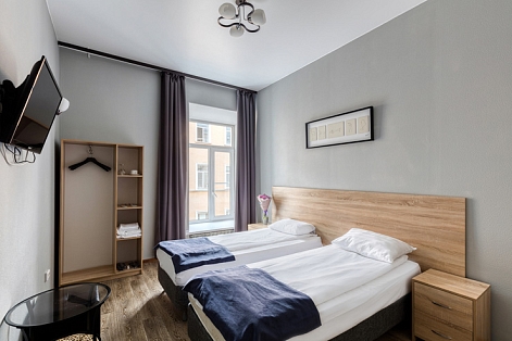 В номере: кровати односпальные, прикроватные тумбочки, столик журнальный, стулья, шкаф, телевизор
